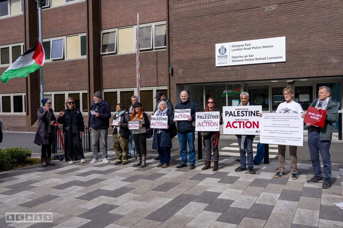 Glasgow UK. 6th April 2026. Pro-Palestinian supporters gather outside London Road Police Station to protest continuing arrests by UK police of activists holding banners showing support for Palestine Action.