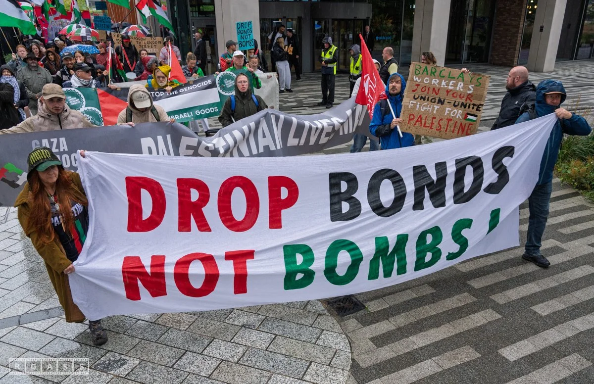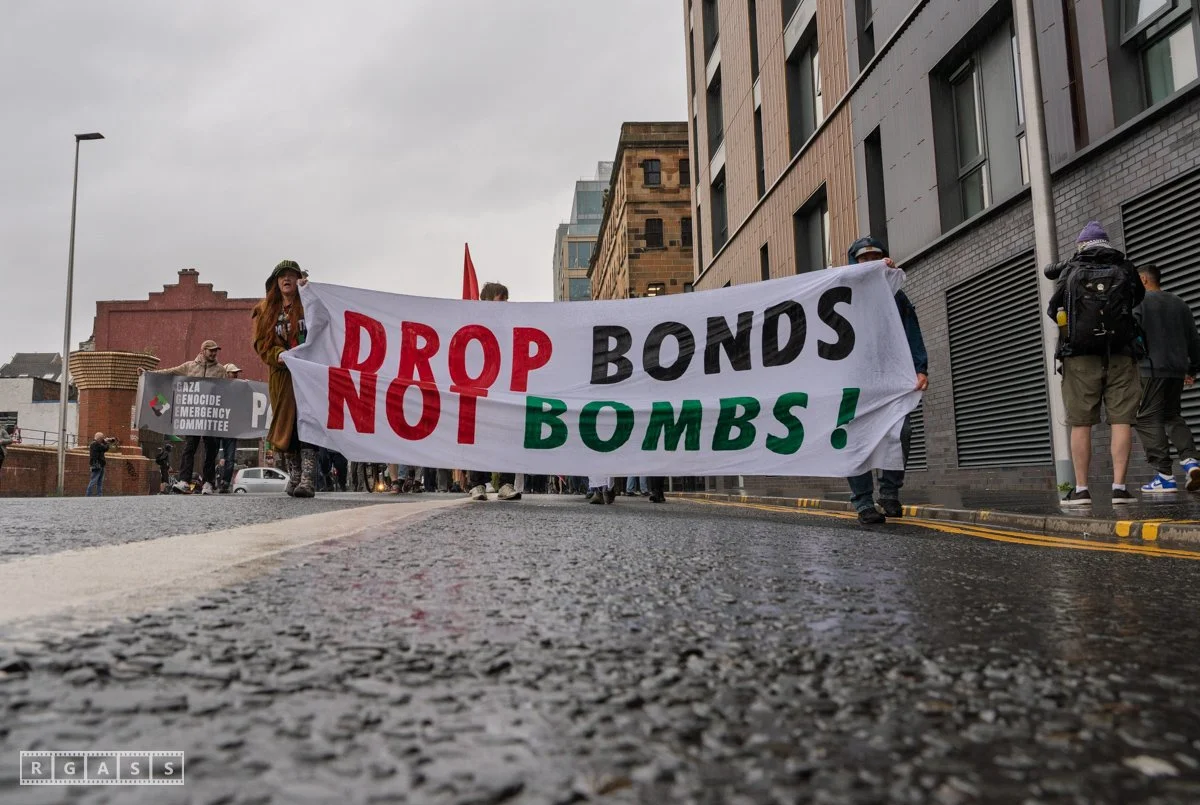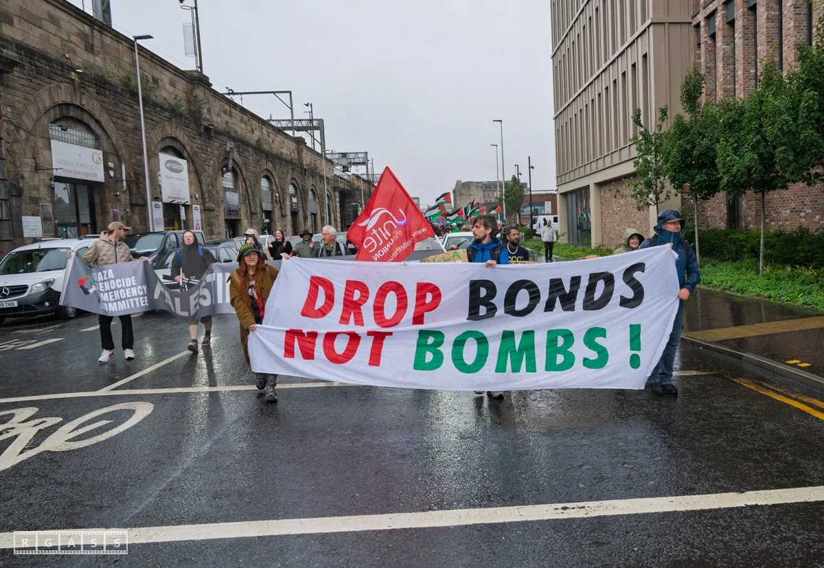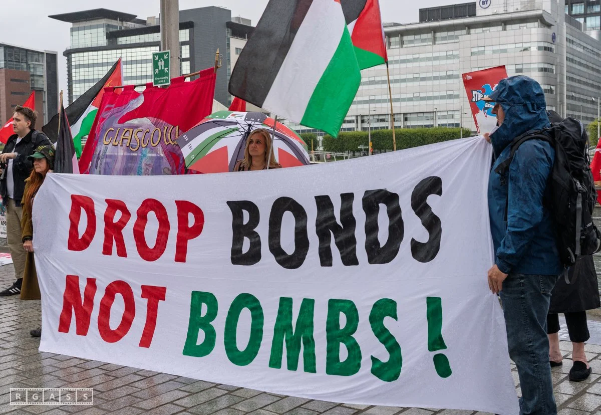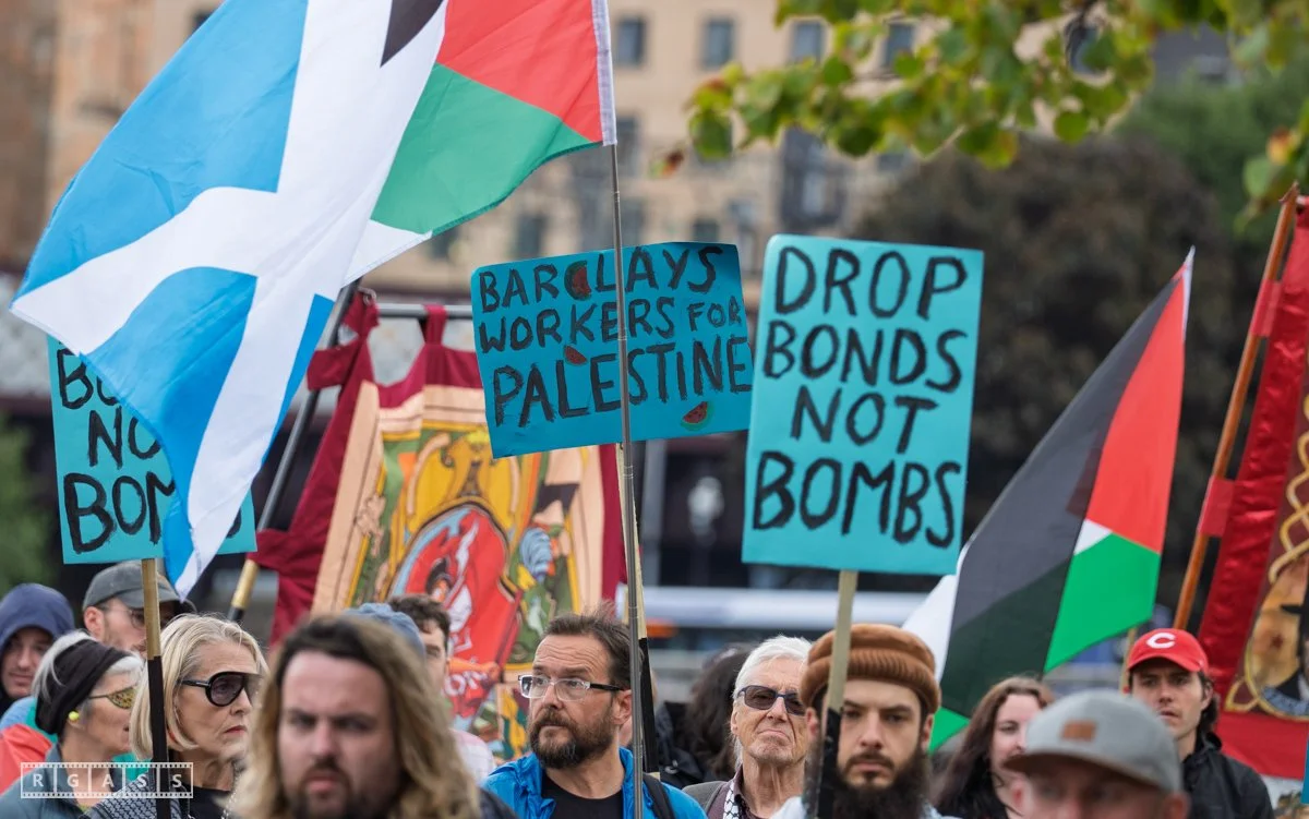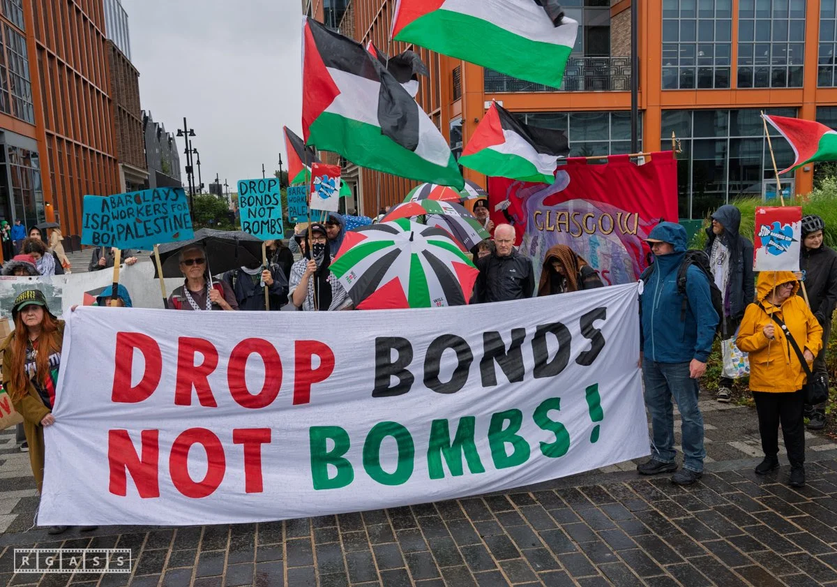 Glasgow, UK. 27th Aug 2025. Barclays workers protest along with pro-Palestinian activists and trade unionists outside the Headquarters Office, with placards saying ‘Drop Bonds Not Bombs’ demanding that Barclays divest from Israeli Government bonds.