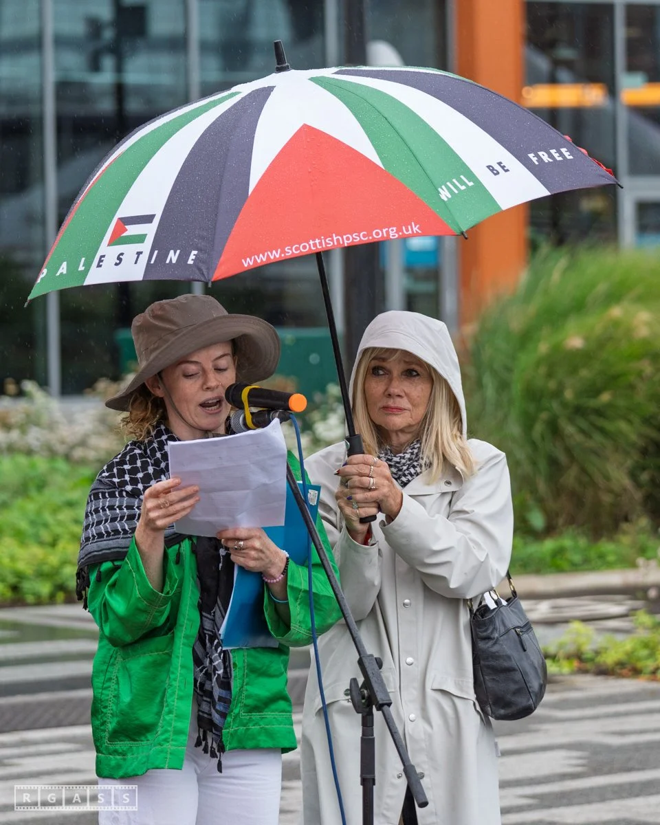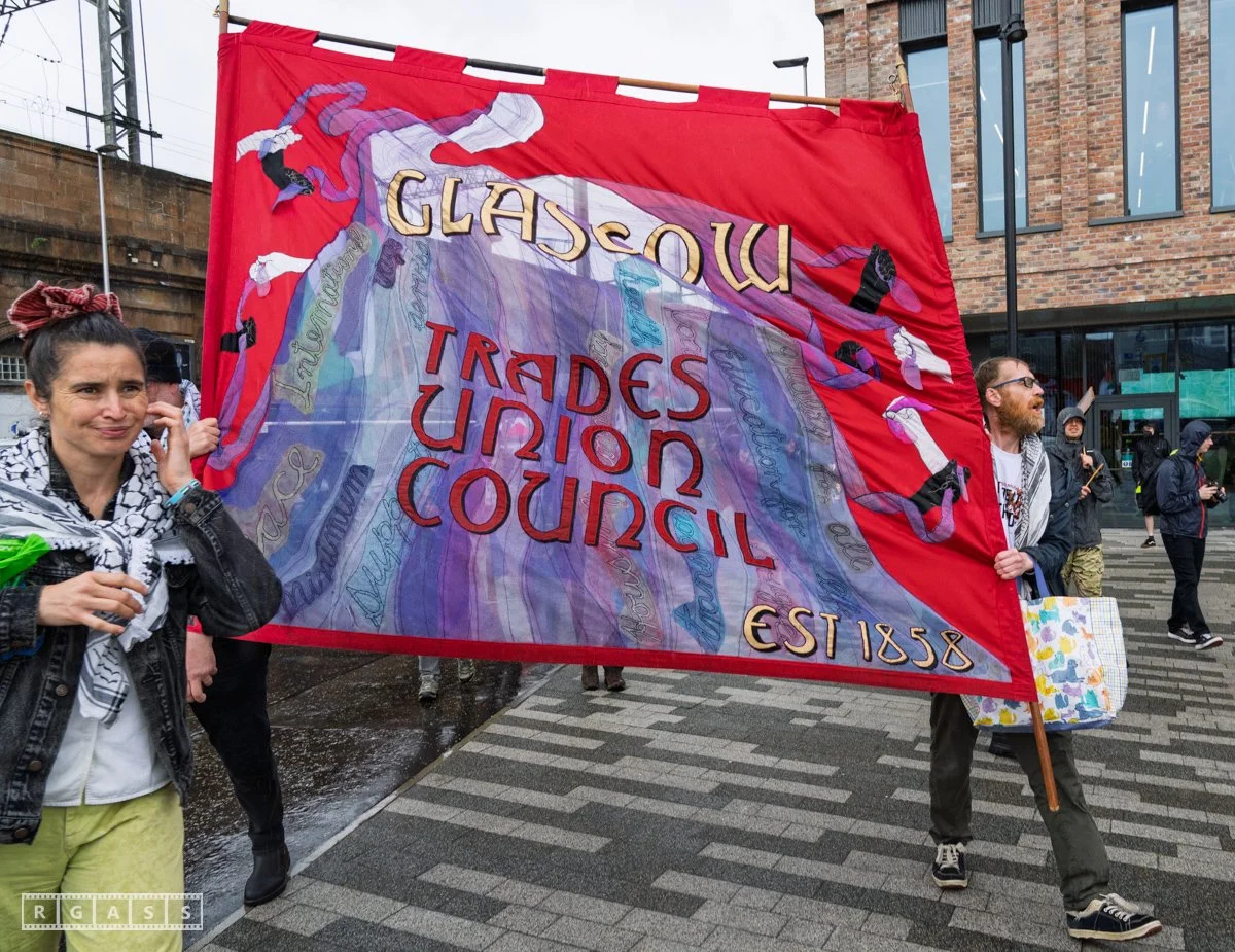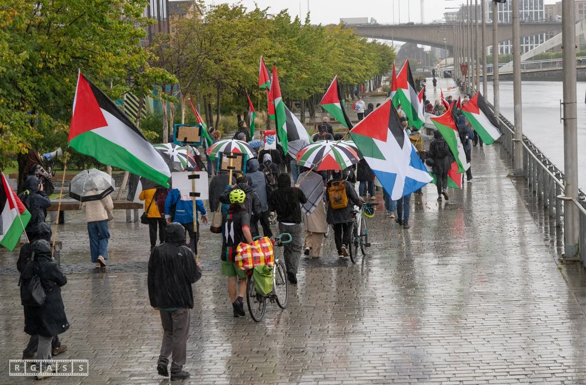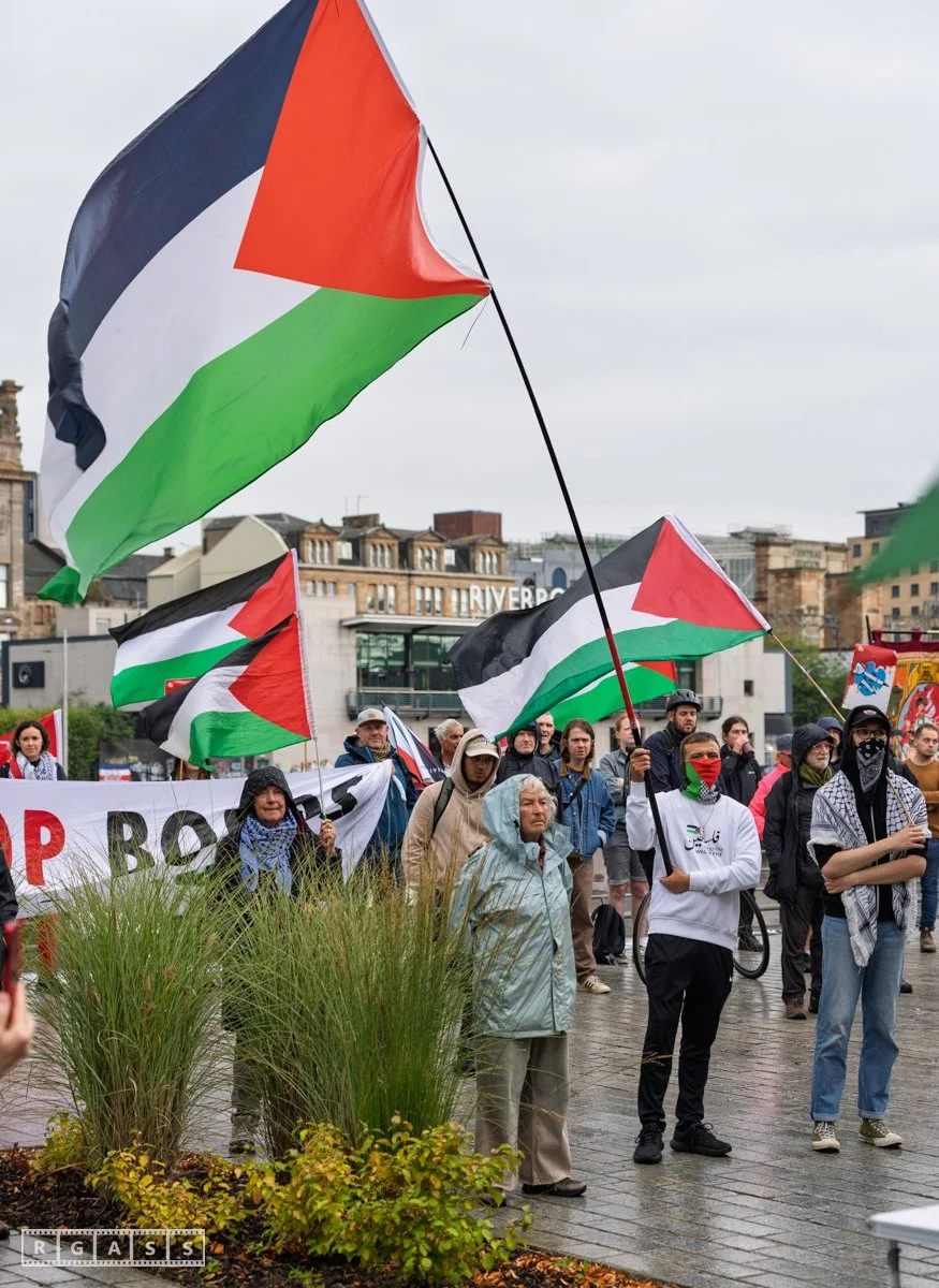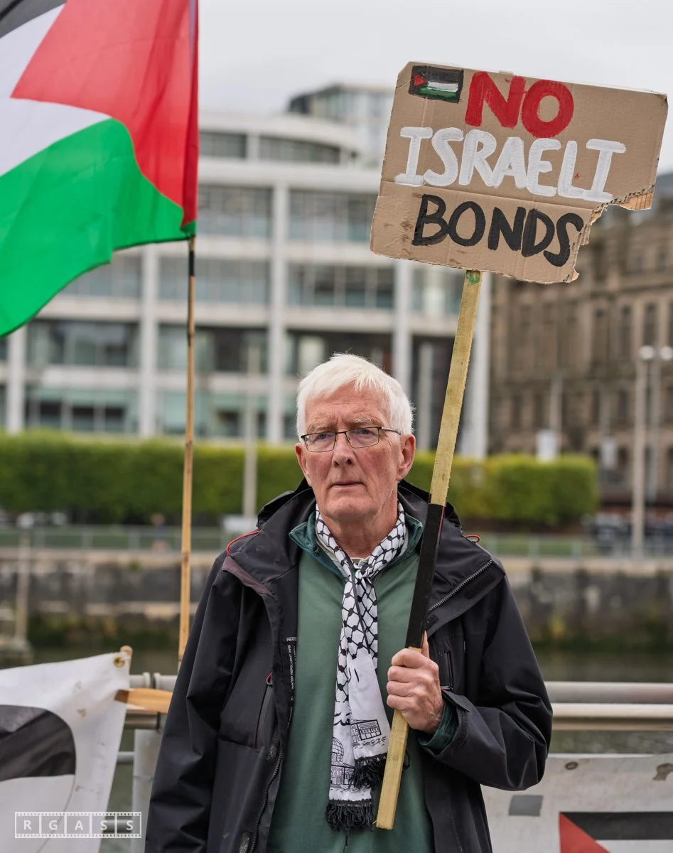 Glasgow, UK. 27th Aug 2025. Barclays workers protest along with pro-Palestinian activists and trade unionists outside the Headquarters Office, with placards saying ‘Drop Bonds Not Bombs’ demanding that Barclays divest from Israeli Government bonds.