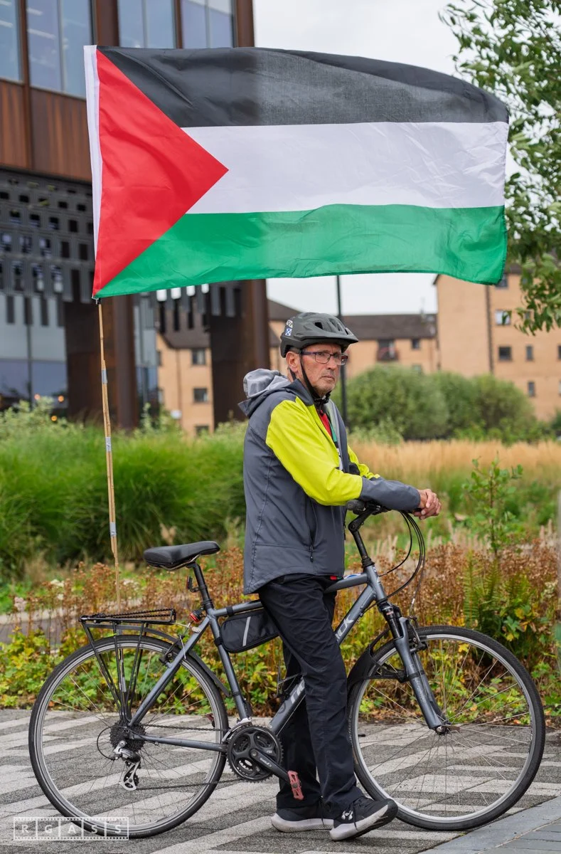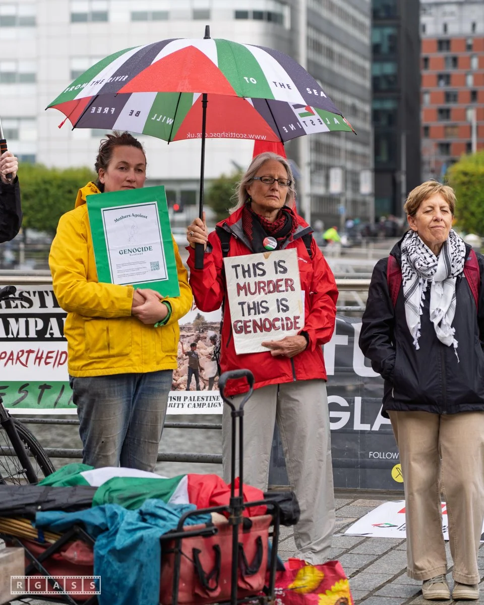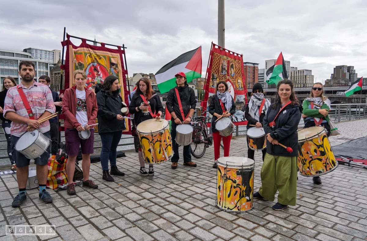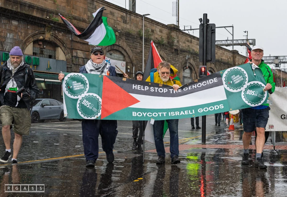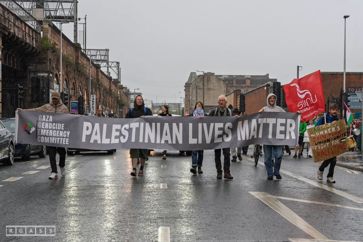 Glasgow, UK. 27th Aug 2025. Barclays workers protest along with pro-Palestinian activists and trade unionists outside the Headquarters Office, with placards saying ‘Drop Bonds Not Bombs’ demanding that Barclays divest from Israeli Government bonds.