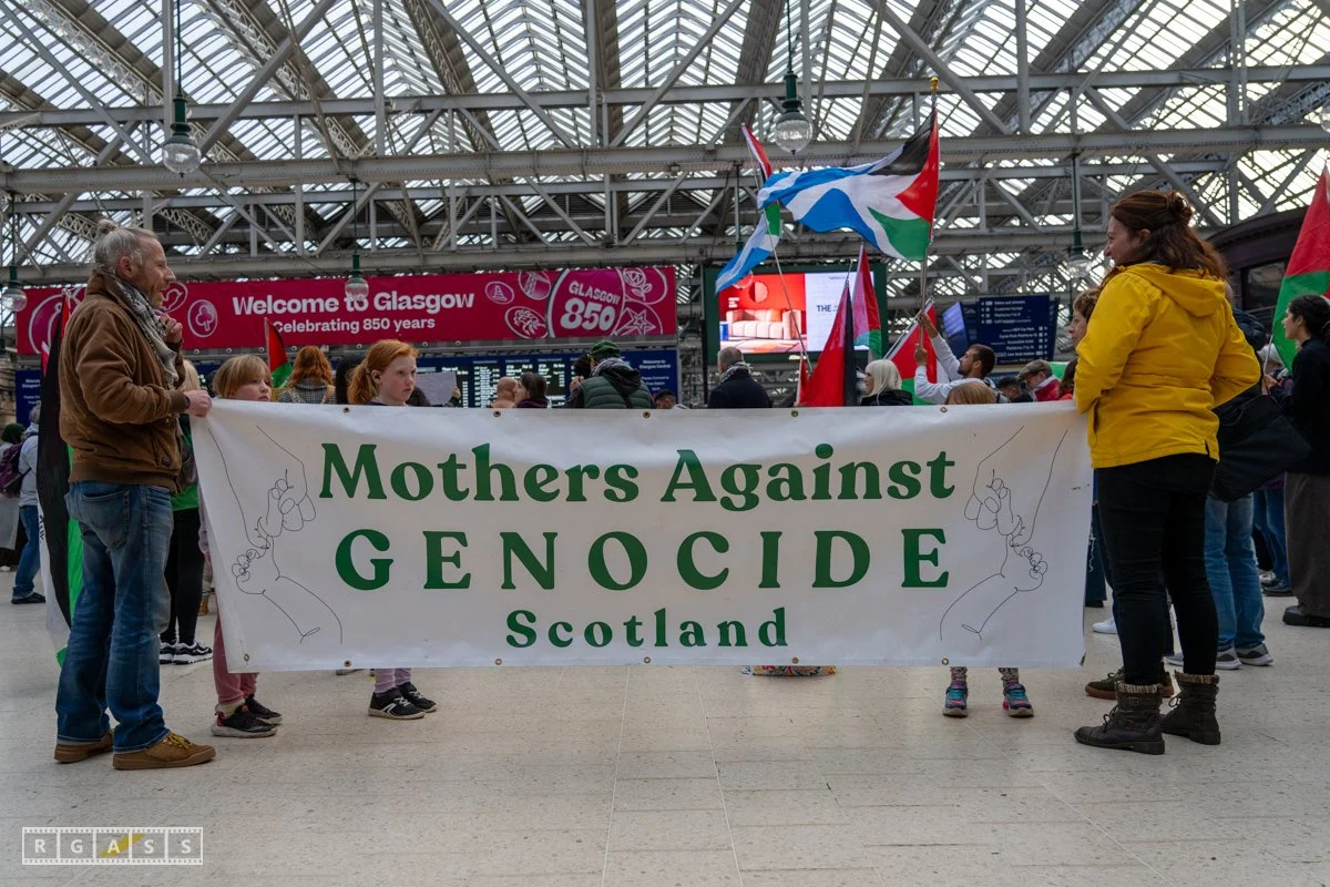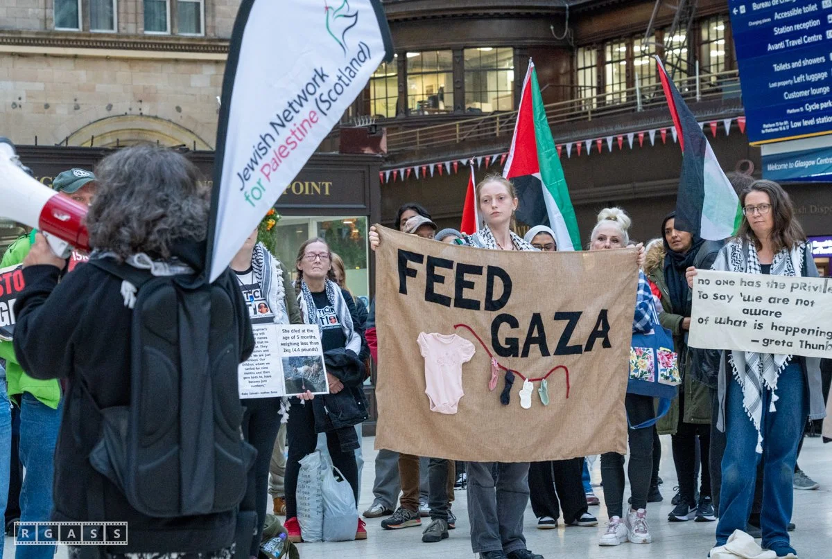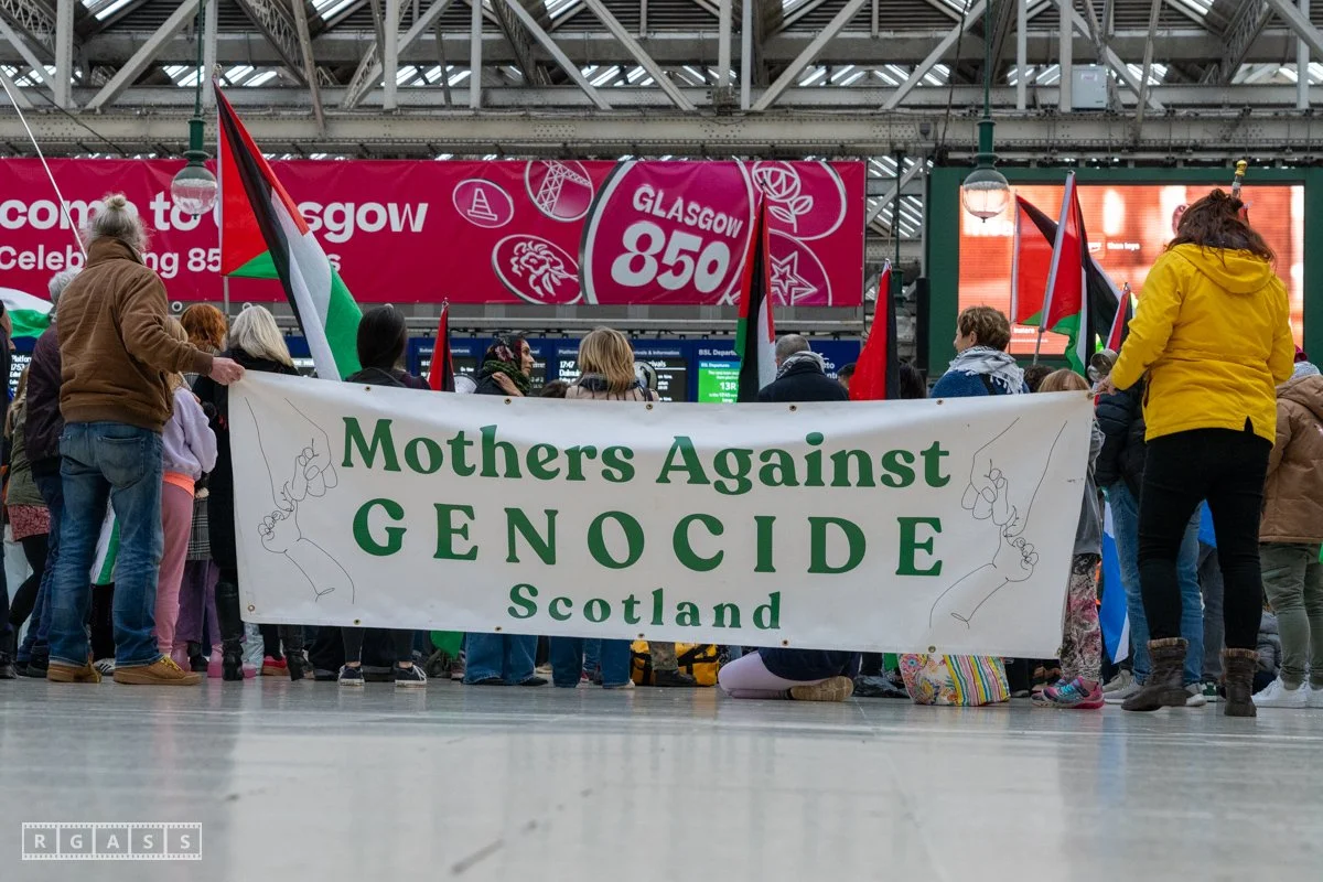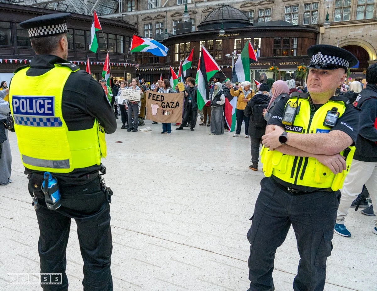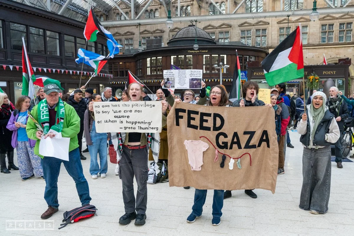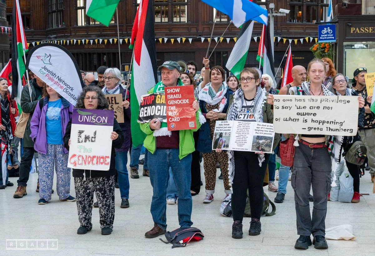 Glasgow Scotland UK. 7th October 2025. Pro Palestine supporters gather in Central Station exactly two years after the Hamas attack in Israel. Protesters demanded an end to the Genocide in Gaza. This and other similar events across the UK were labelled as disrespectful and un-British by the Prime Minister and other senior Government officials.