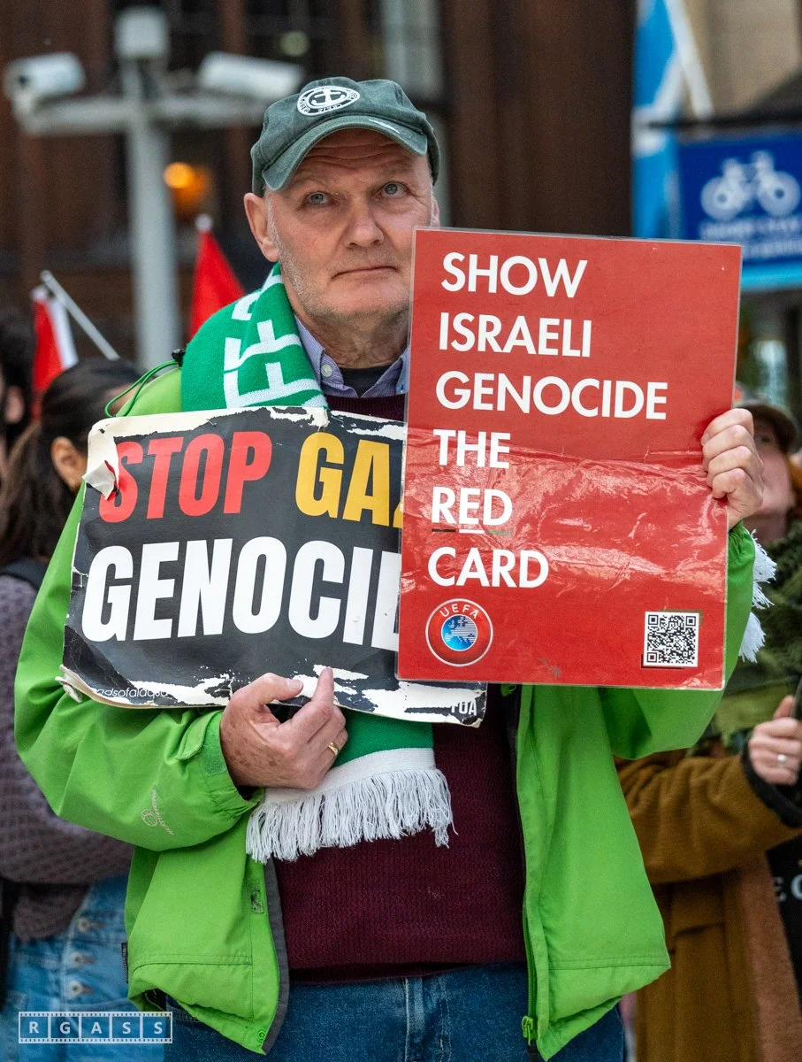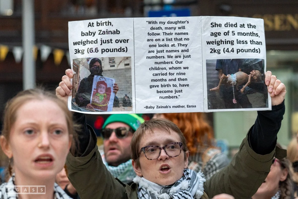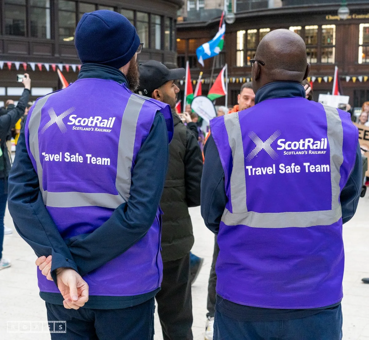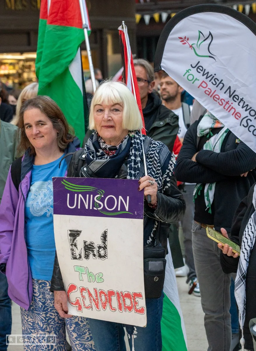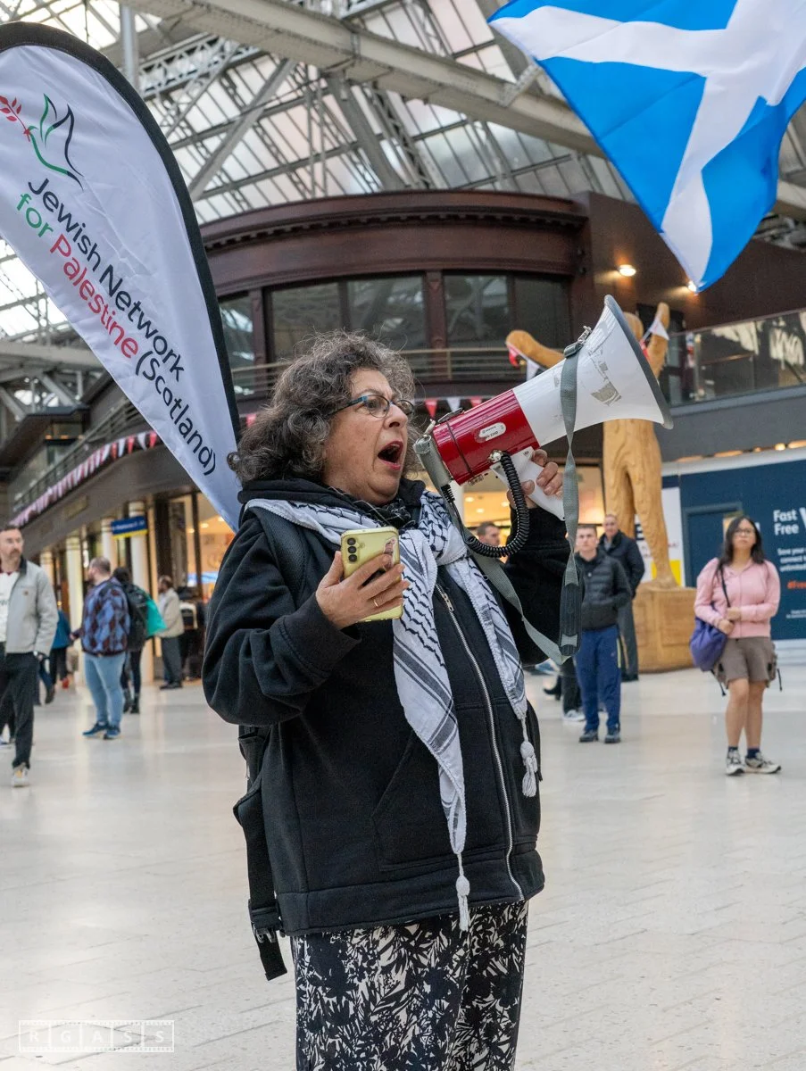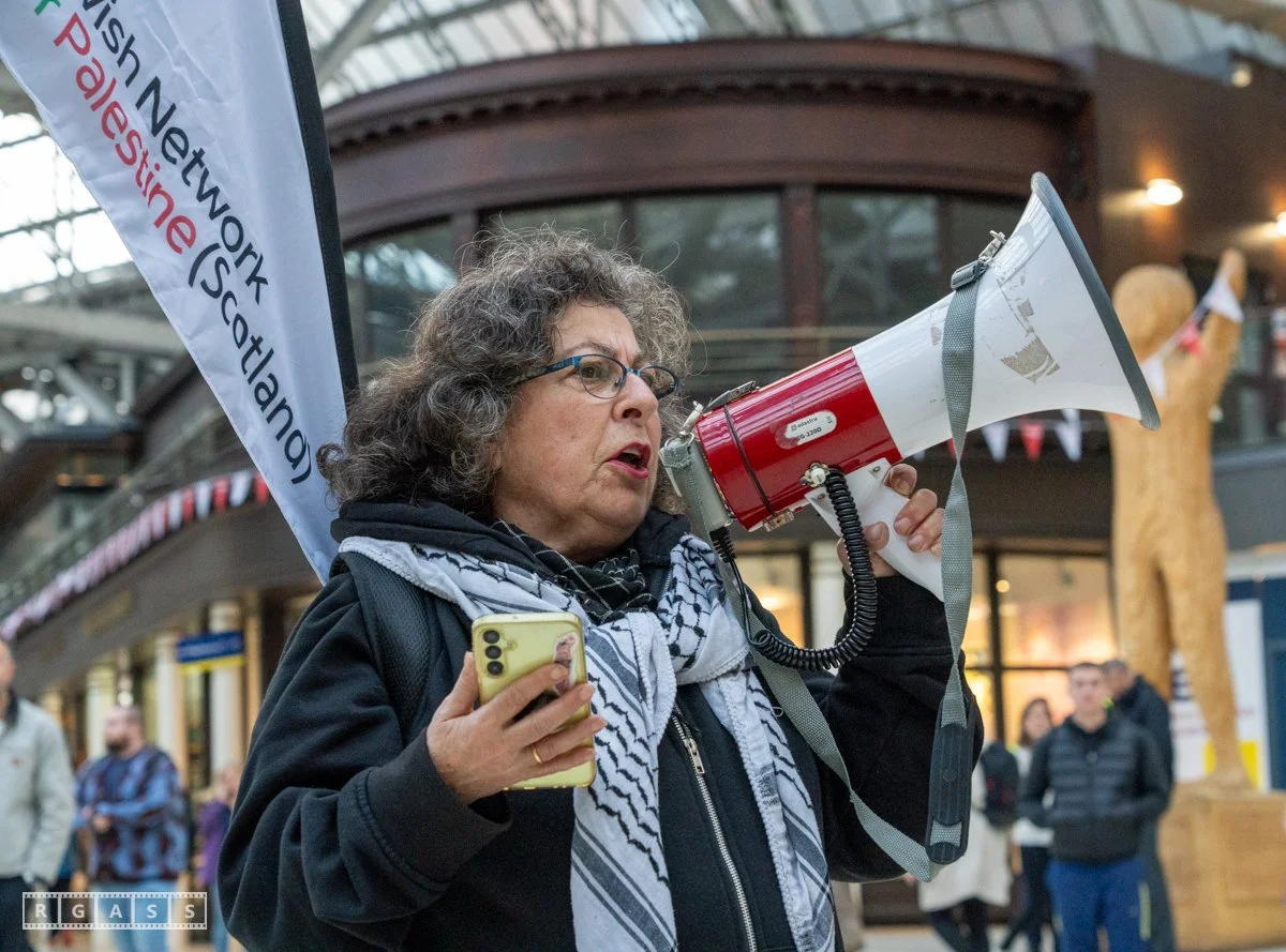 Glasgow Scotland UK. 7th October 2025. Pro Palestine supporters gather in Central Station exactly two years after the Hamas attack in Israel. Protesters demanded an end to the Genocide in Gaza. This and other similar events across the UK were labelled as disrespectful and un-British by the Prime Minister and other senior Government officials.