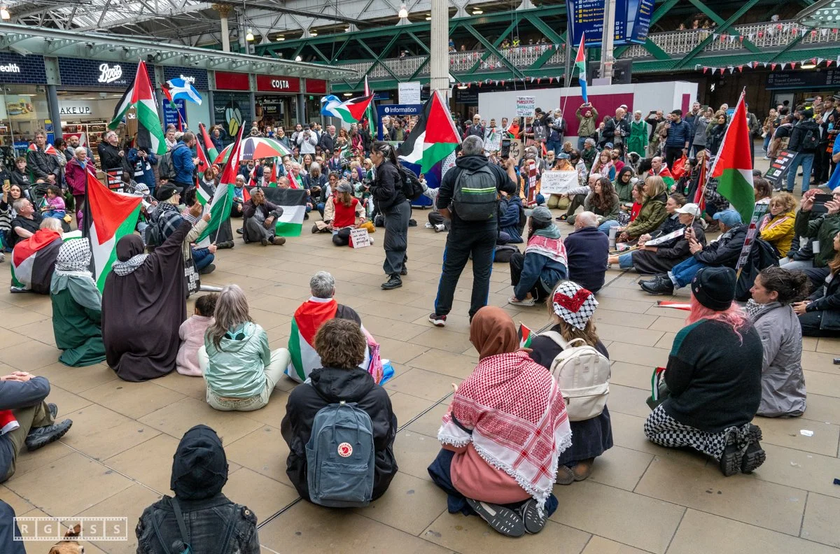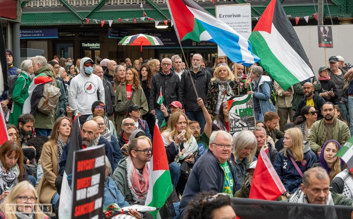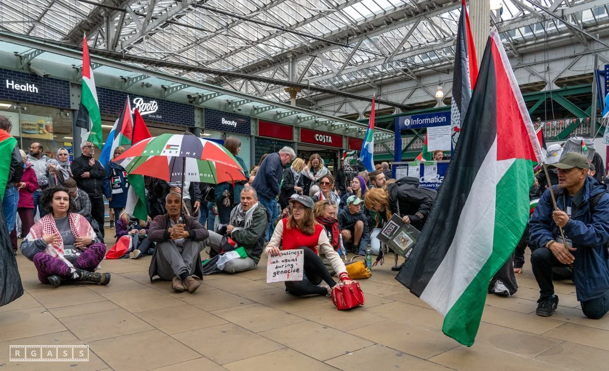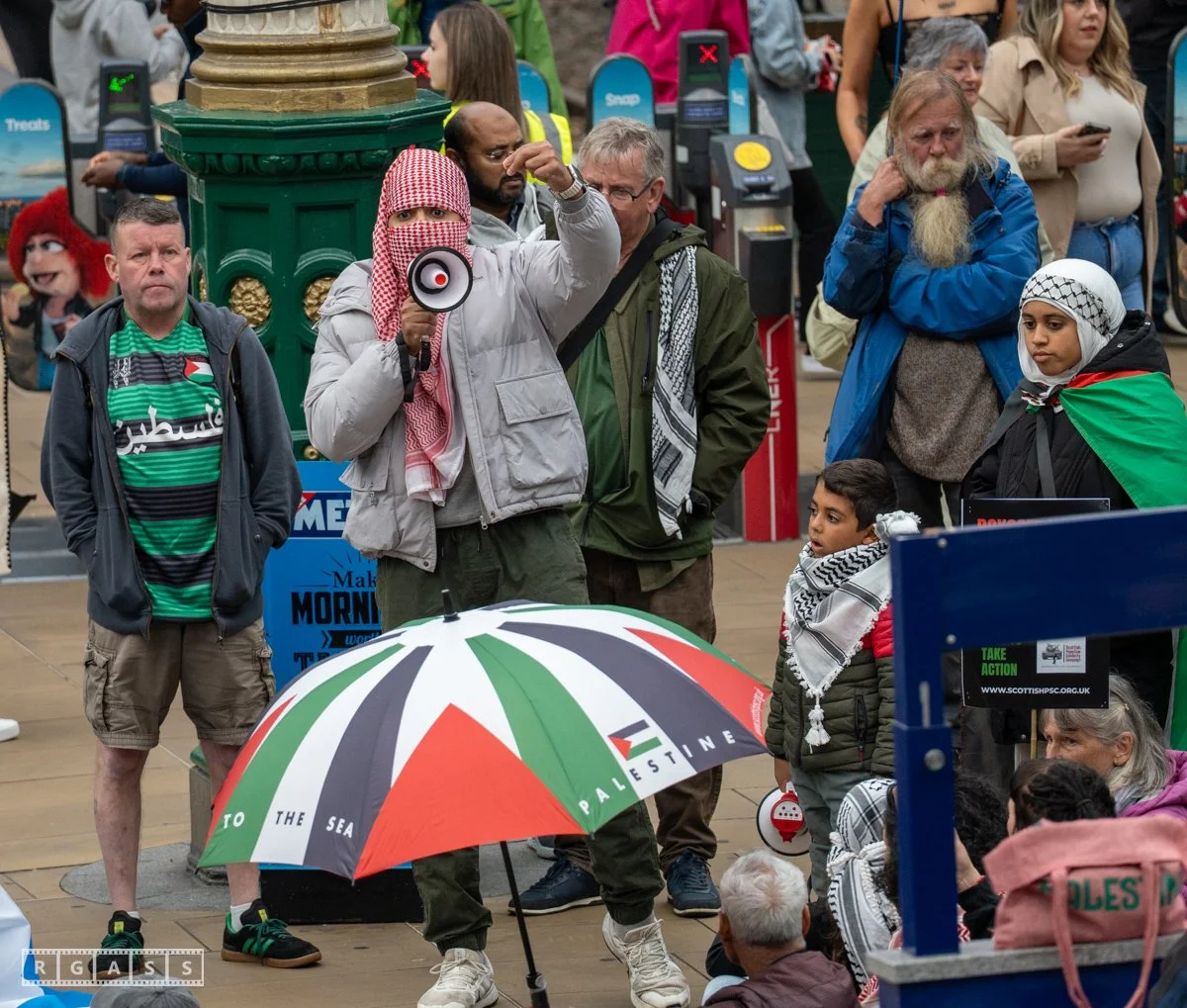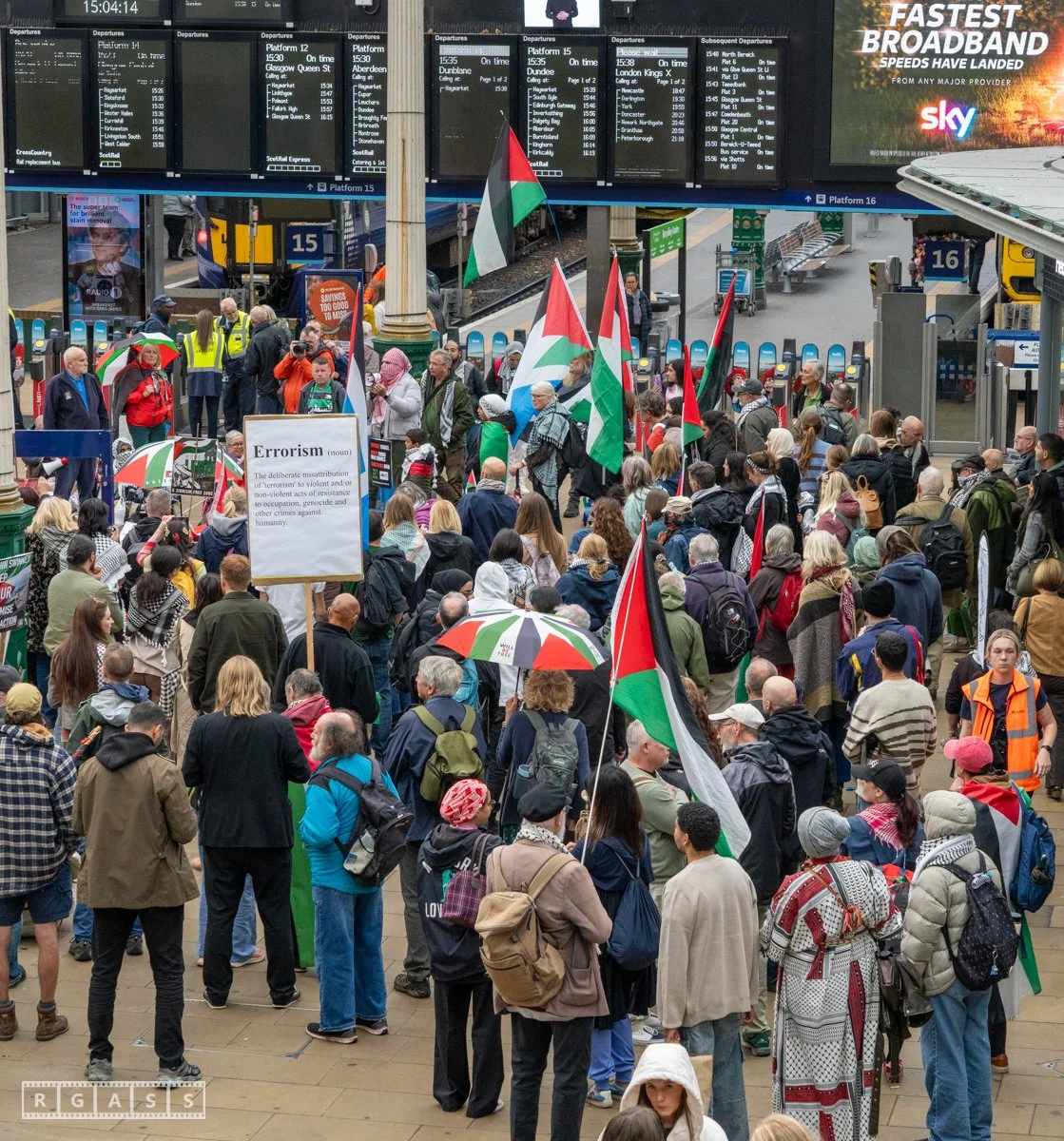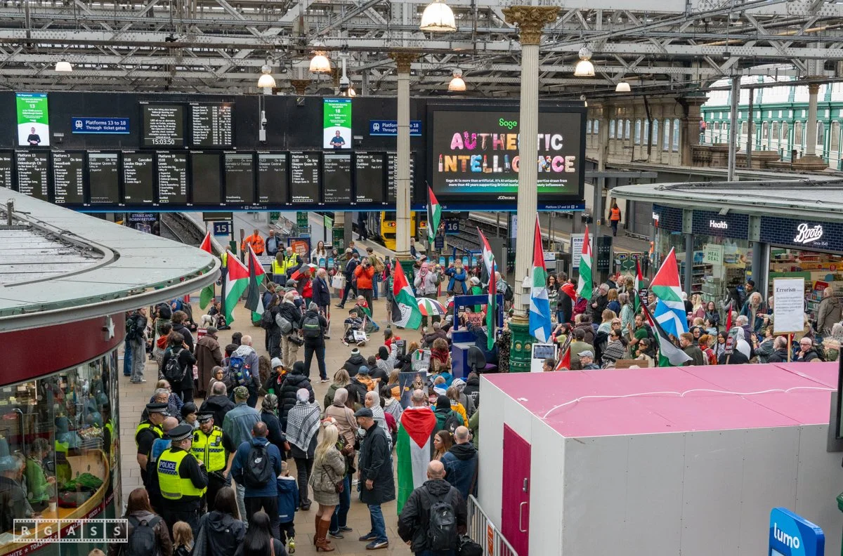 Edinburgh UK. 13 September 2025. Scottish National Demonstration for Palestine “Gaza is being Eroded, Stop the Annihilation”. Static demonstration at the foot of the mound. After the Scottish National Demonstration for Palestine protesters walked to Waverley Station and waited together on the concourse for the train to Glasgow