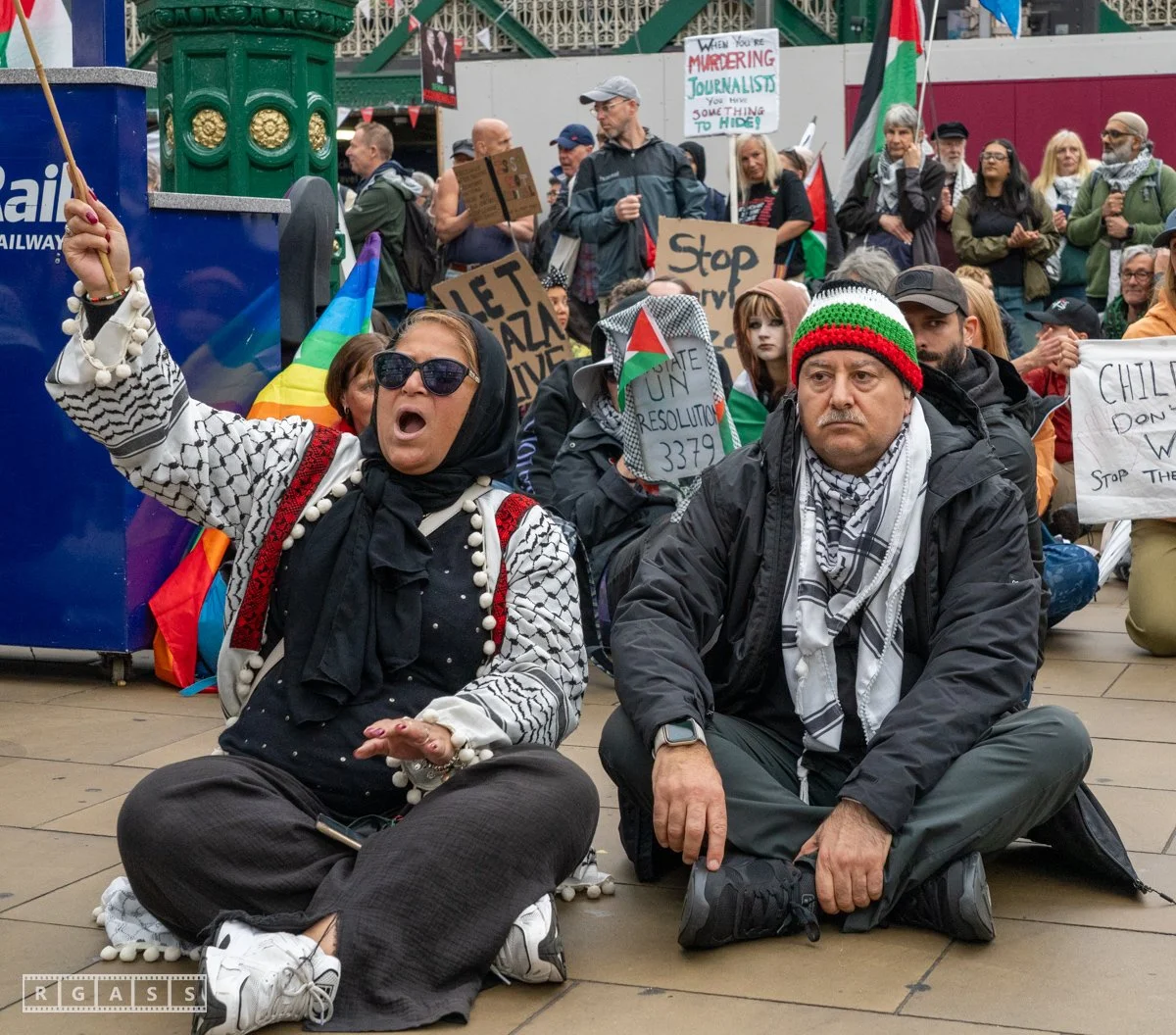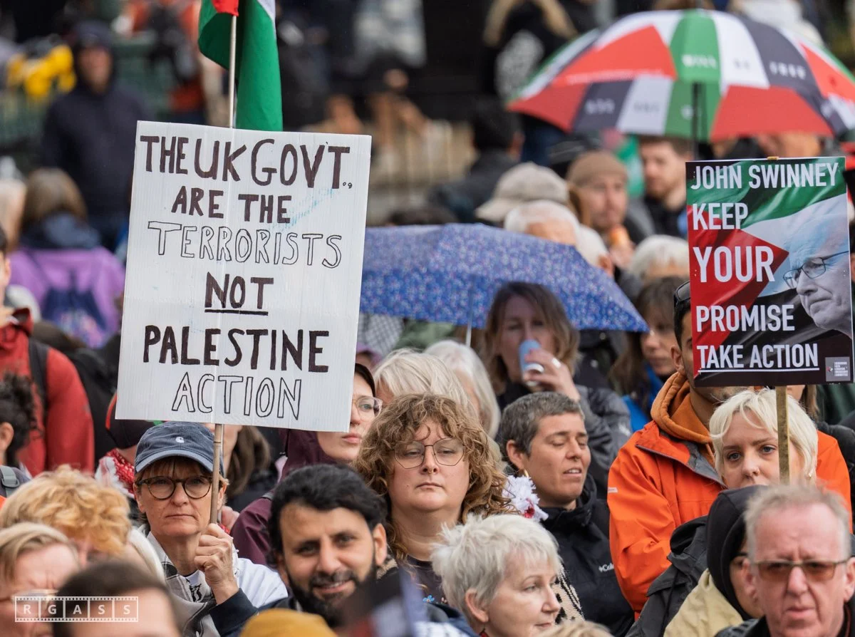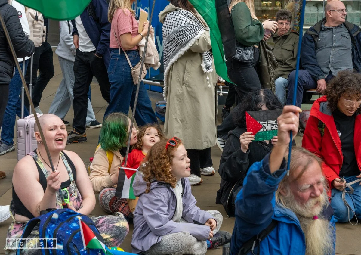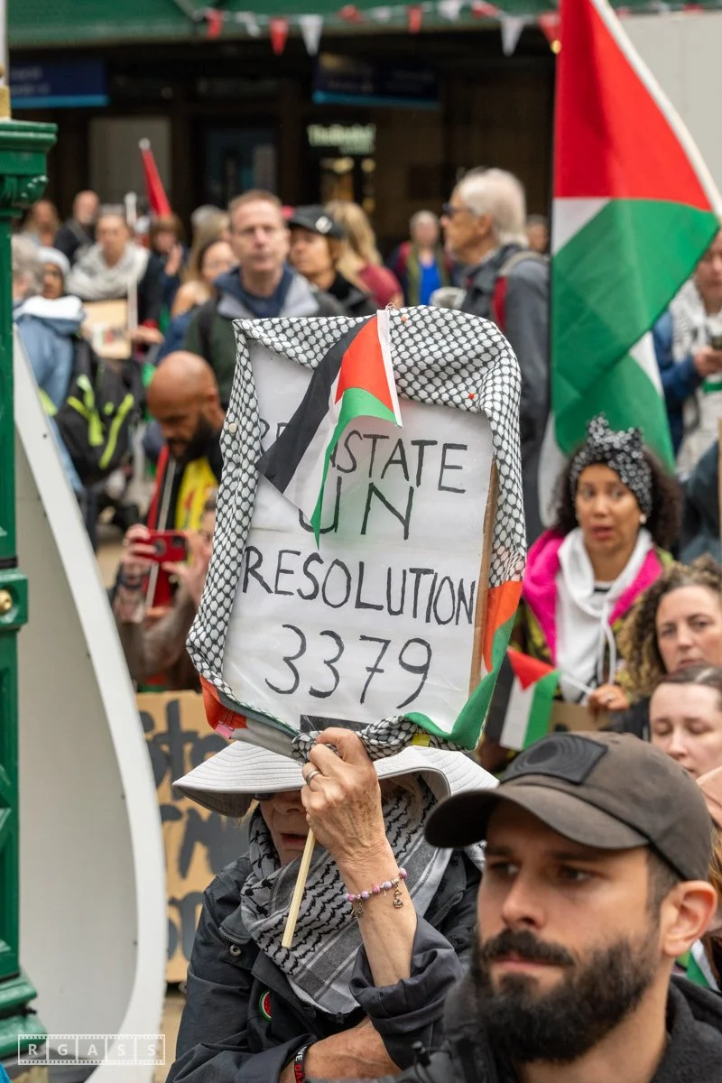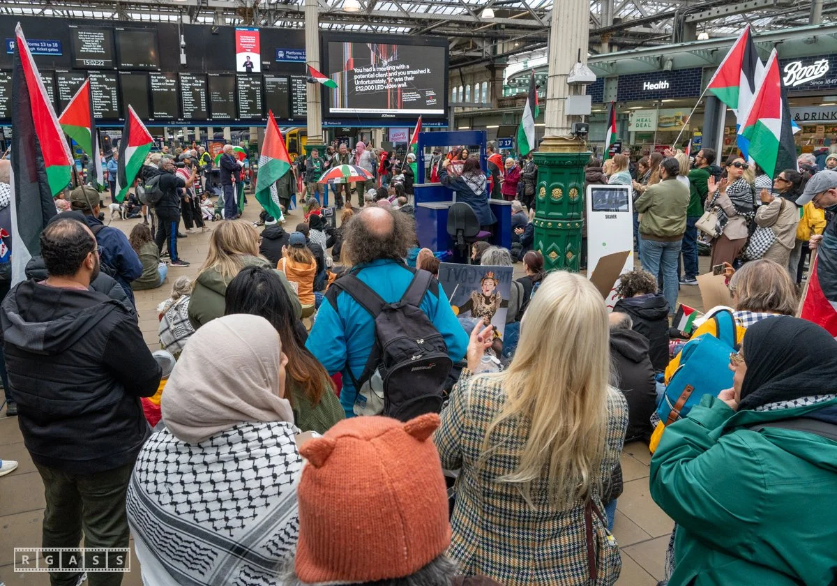 Edinburgh UK. 13 September 2025. Scottish National Demonstration for Palestine “Gaza is being Eroded, Stop the Annihilation”. Static demonstration at the foot of the mound. After the Scottish National Demonstration for Palestine protesters walked to Waverley Station and waited together on the concourse for the train to Glasgow