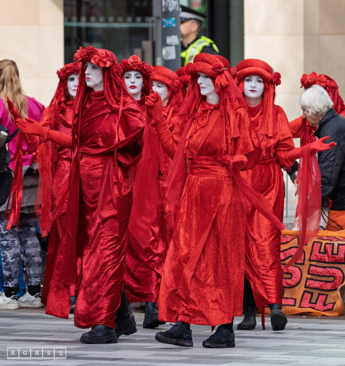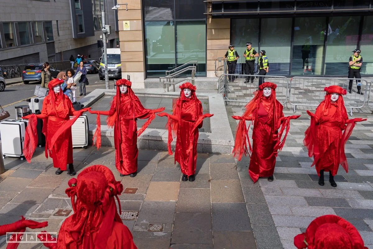 Edinburgh, UK. 6th September 2025. The Red Rebel Brigade join protesters outside HM Government offices at Queen Elizabeth House to demand the UK Government stop the Rosebank oil and gas development.