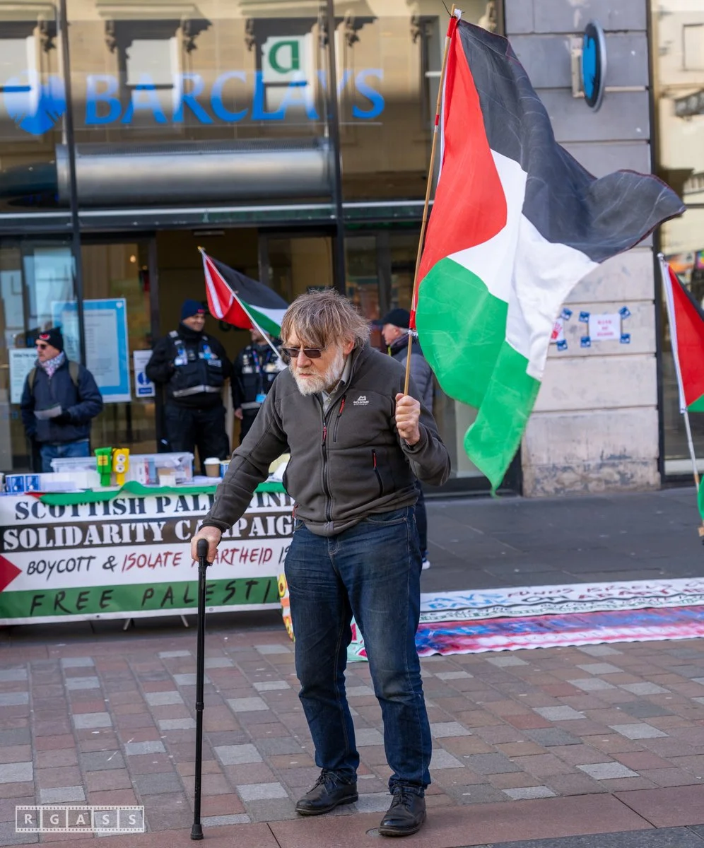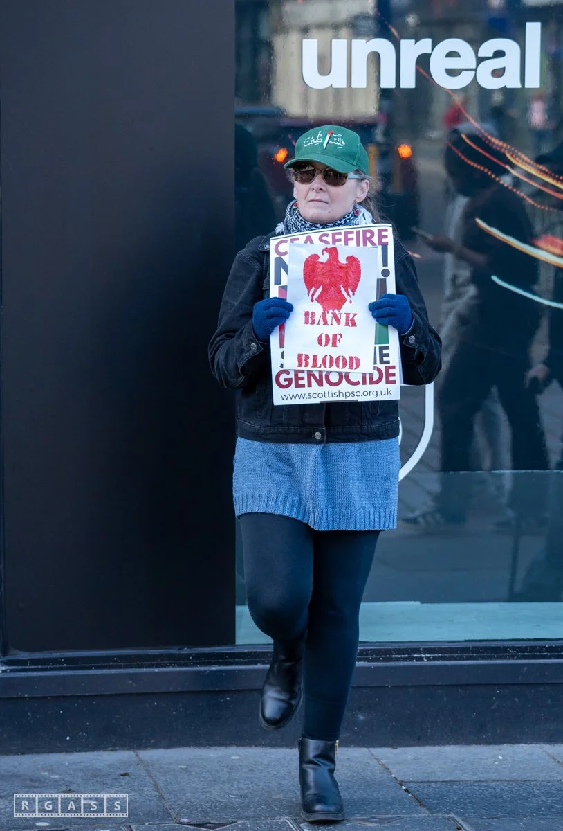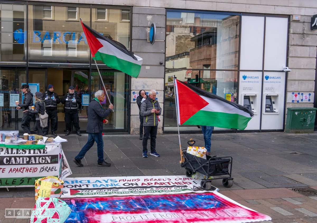 Glasgow UK. 5th April 2025 Pro Palestine protest outside Barclays Bank on Argyll Street.