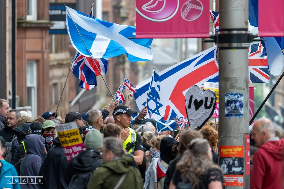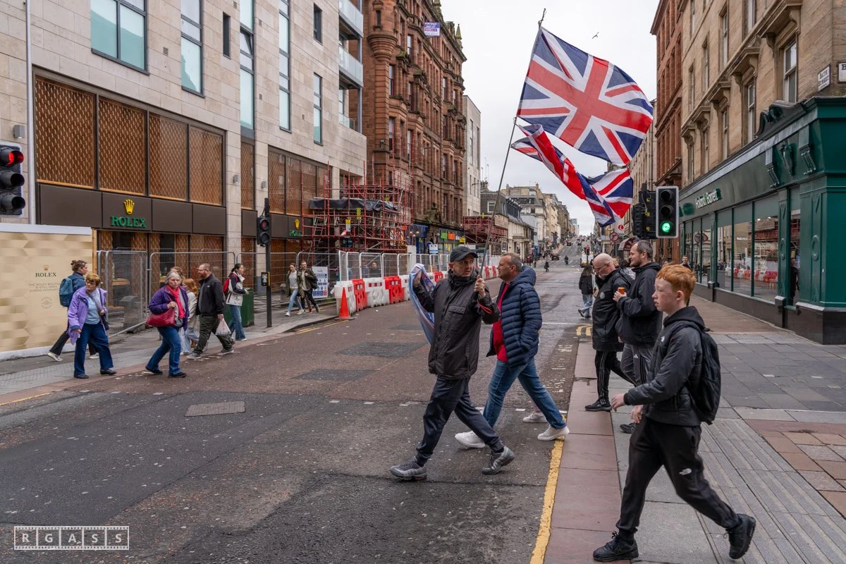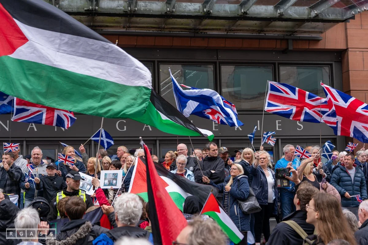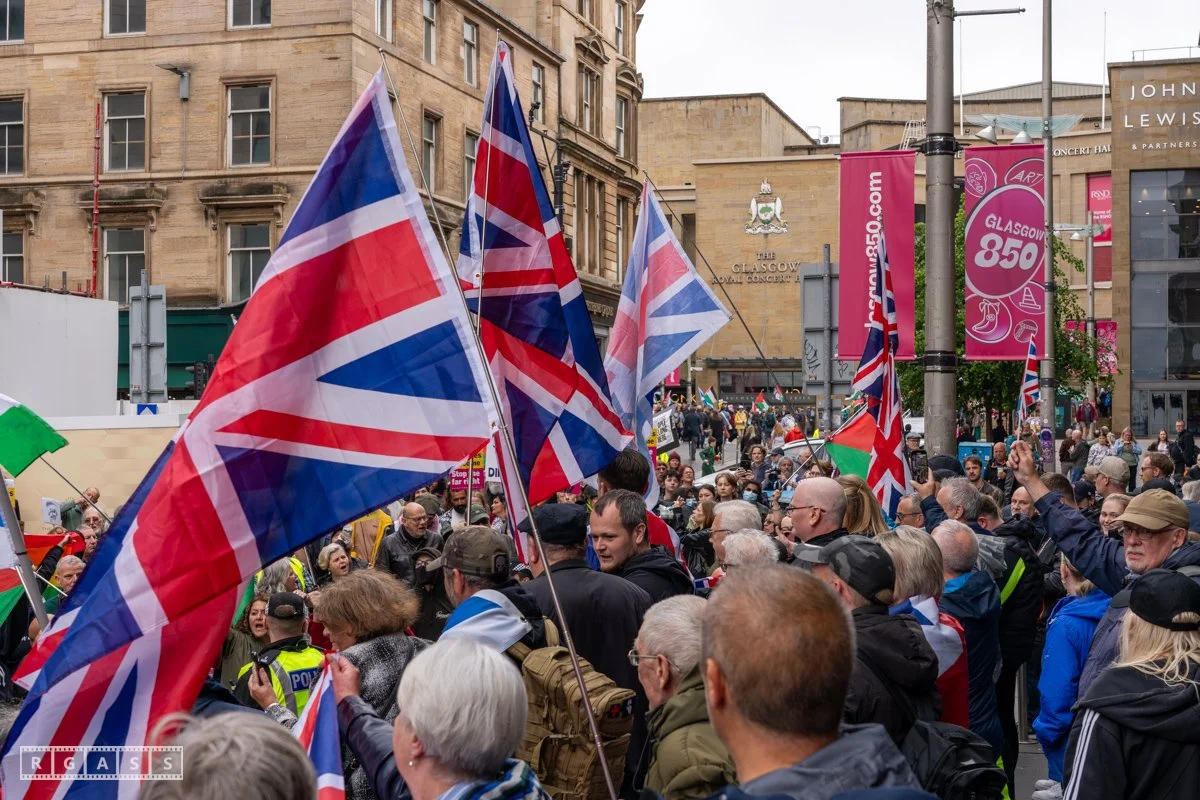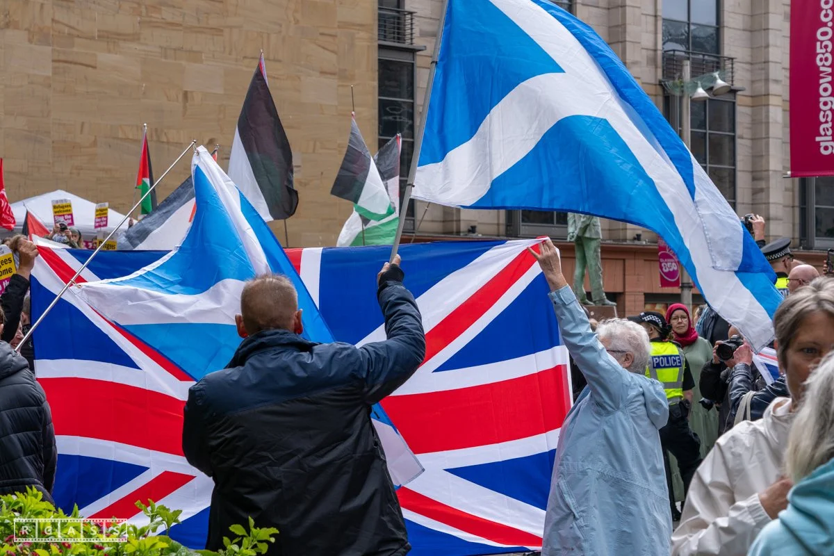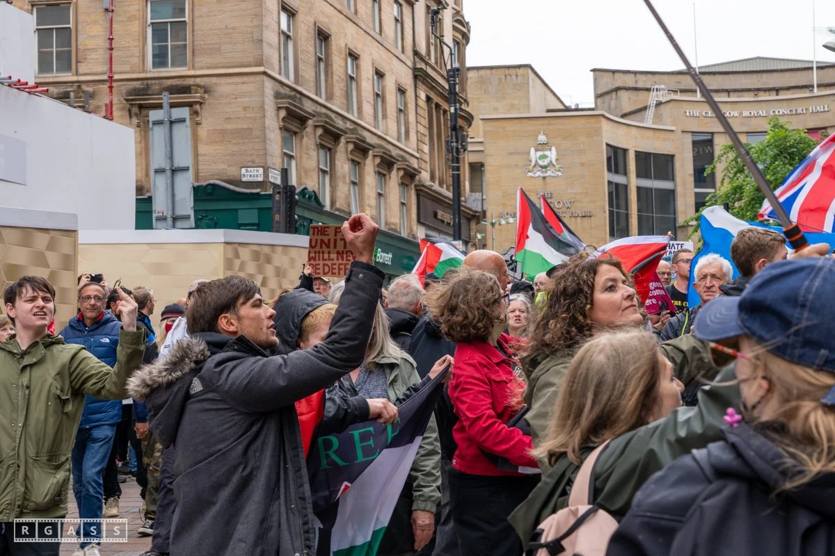 May 24, 2025, Glasgow, UK: Protestors supporting the Great British National Strike are met by large numbers of counter-protesters from ‘Stand Up To Racism Scotland’ and Pro-Palestinian Supporters and trade unions.