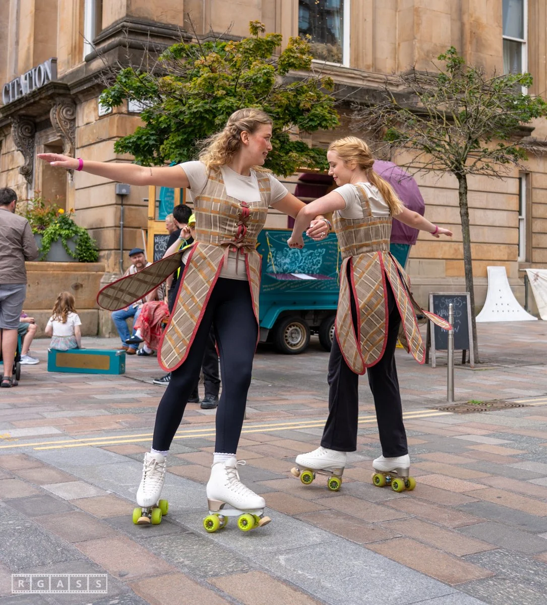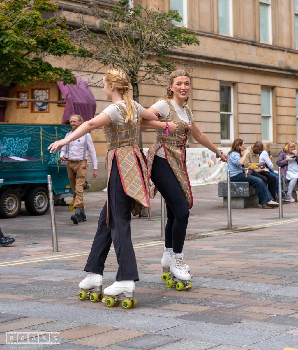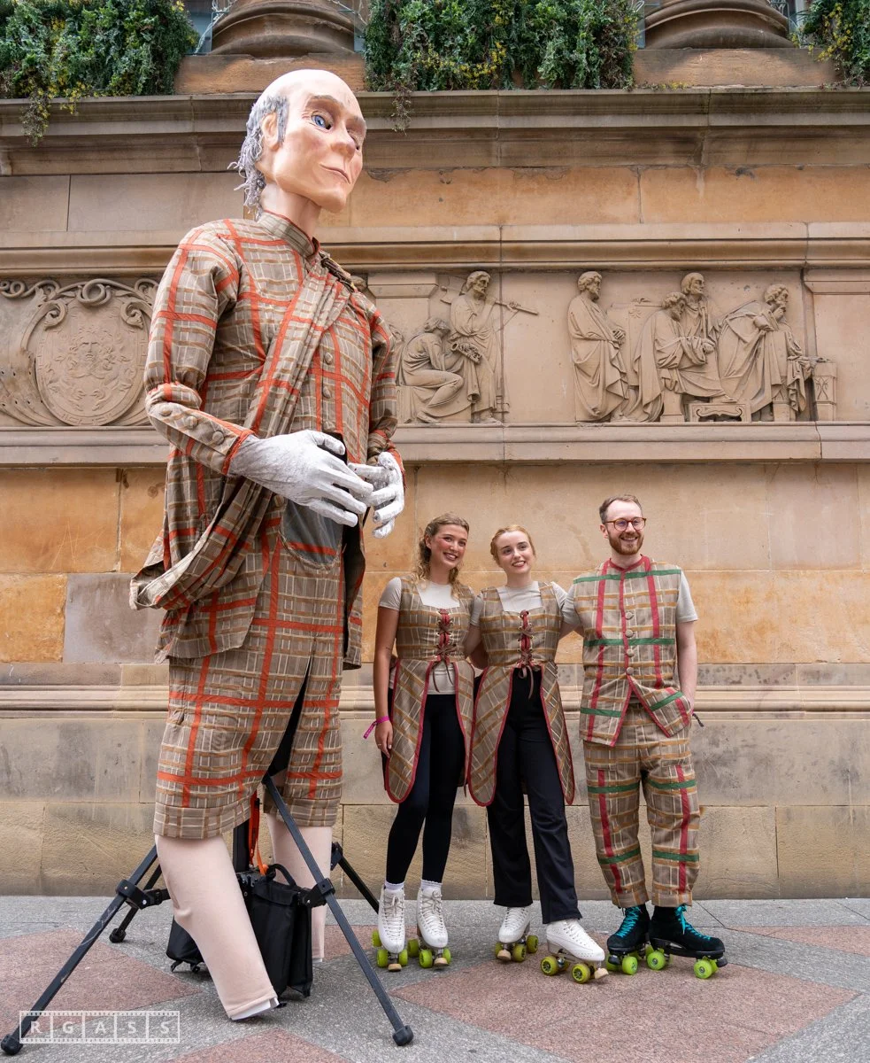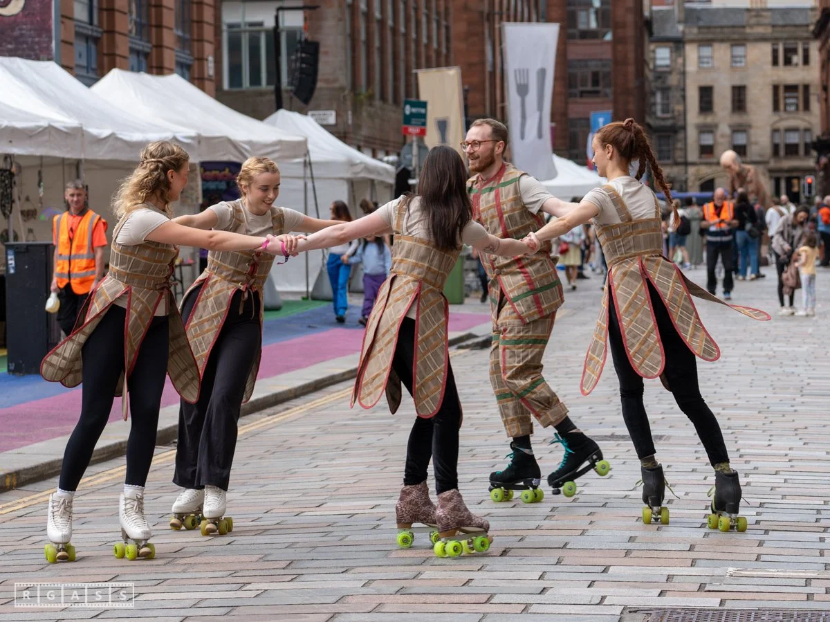 Glasgow, UK. 18th July 2025. Roller skaters and large puppets performing in the street as part of the Merchant City Festival