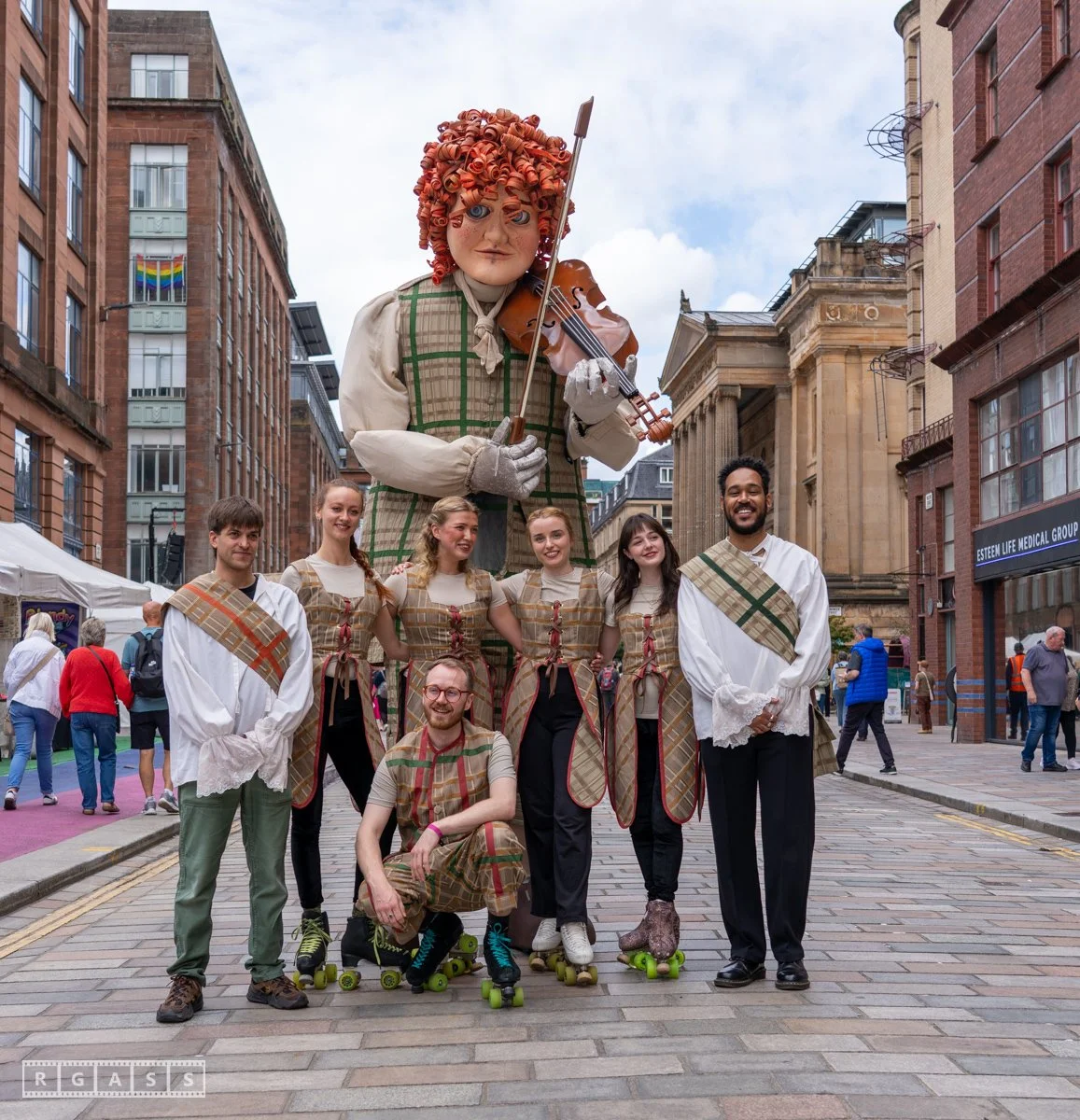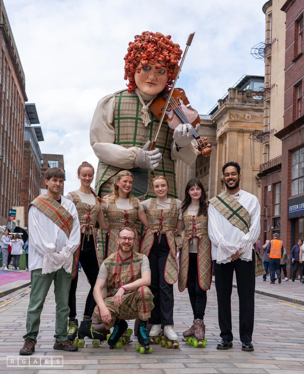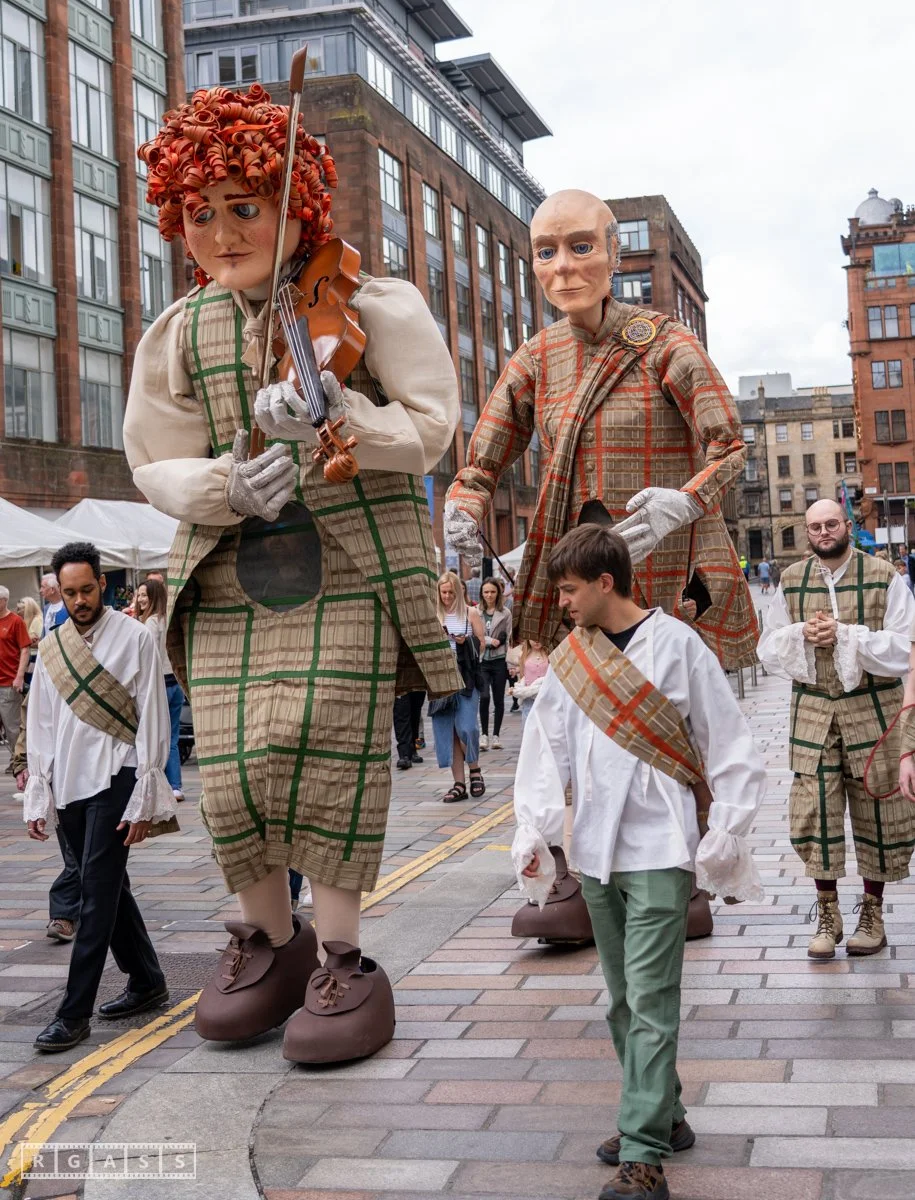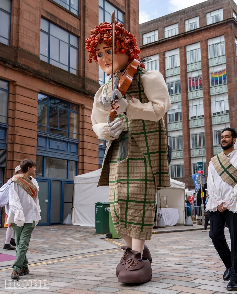 Glasgow, UK. 18th July 2025. Roller skaters and large puppets performing in the street as part of the Merchant City Festival