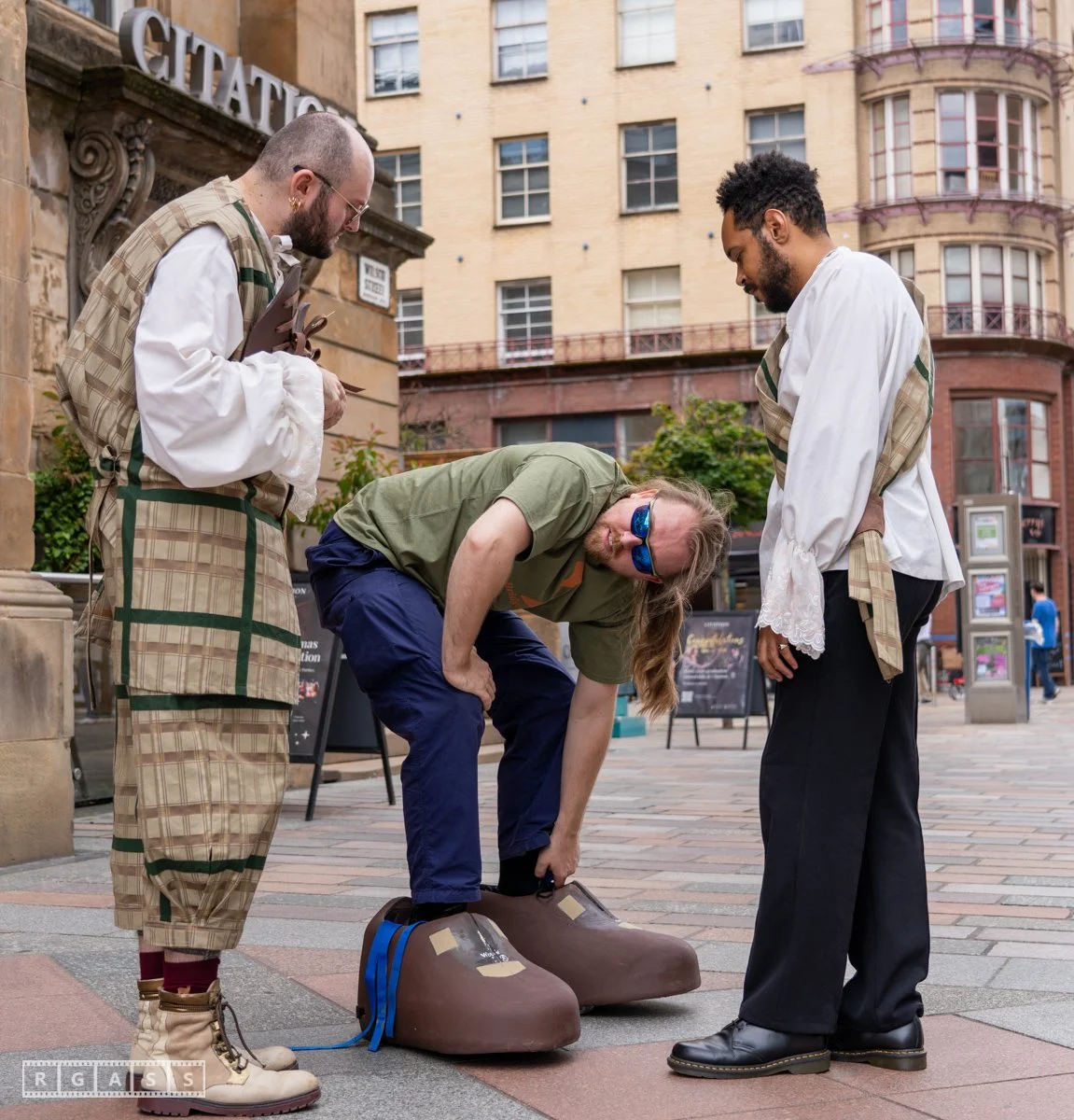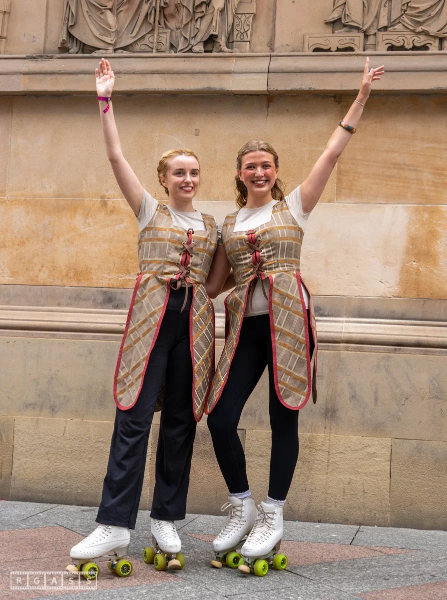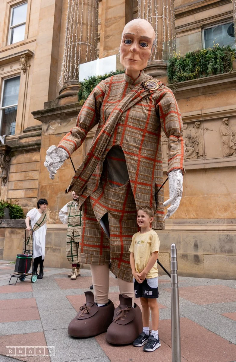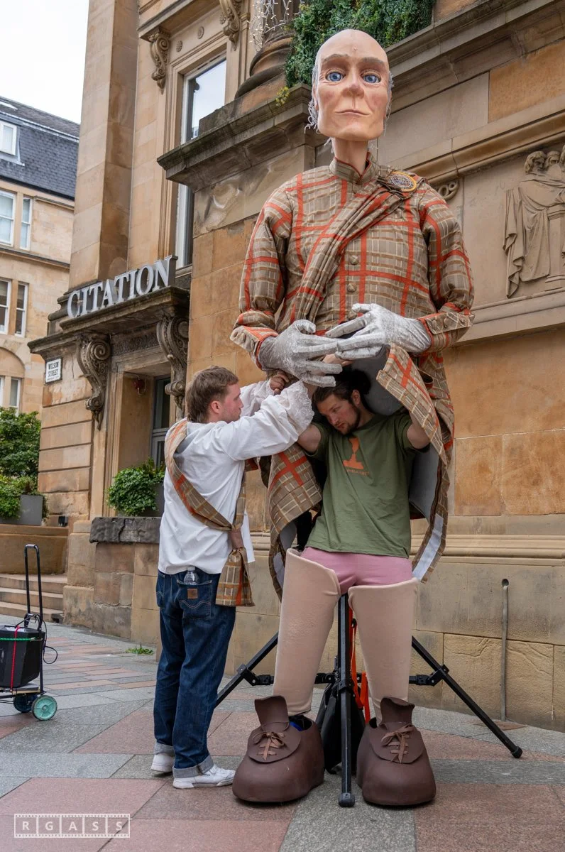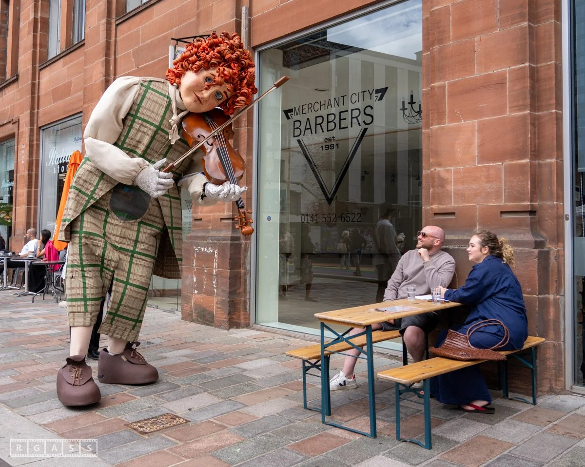 Glasgow, UK. 18th July 2025. Roller skaters and large puppets performing in the street as part of the Merchant City Festival
