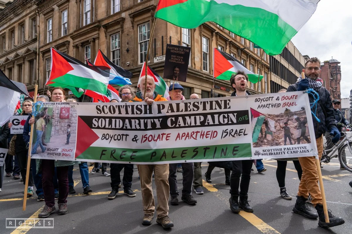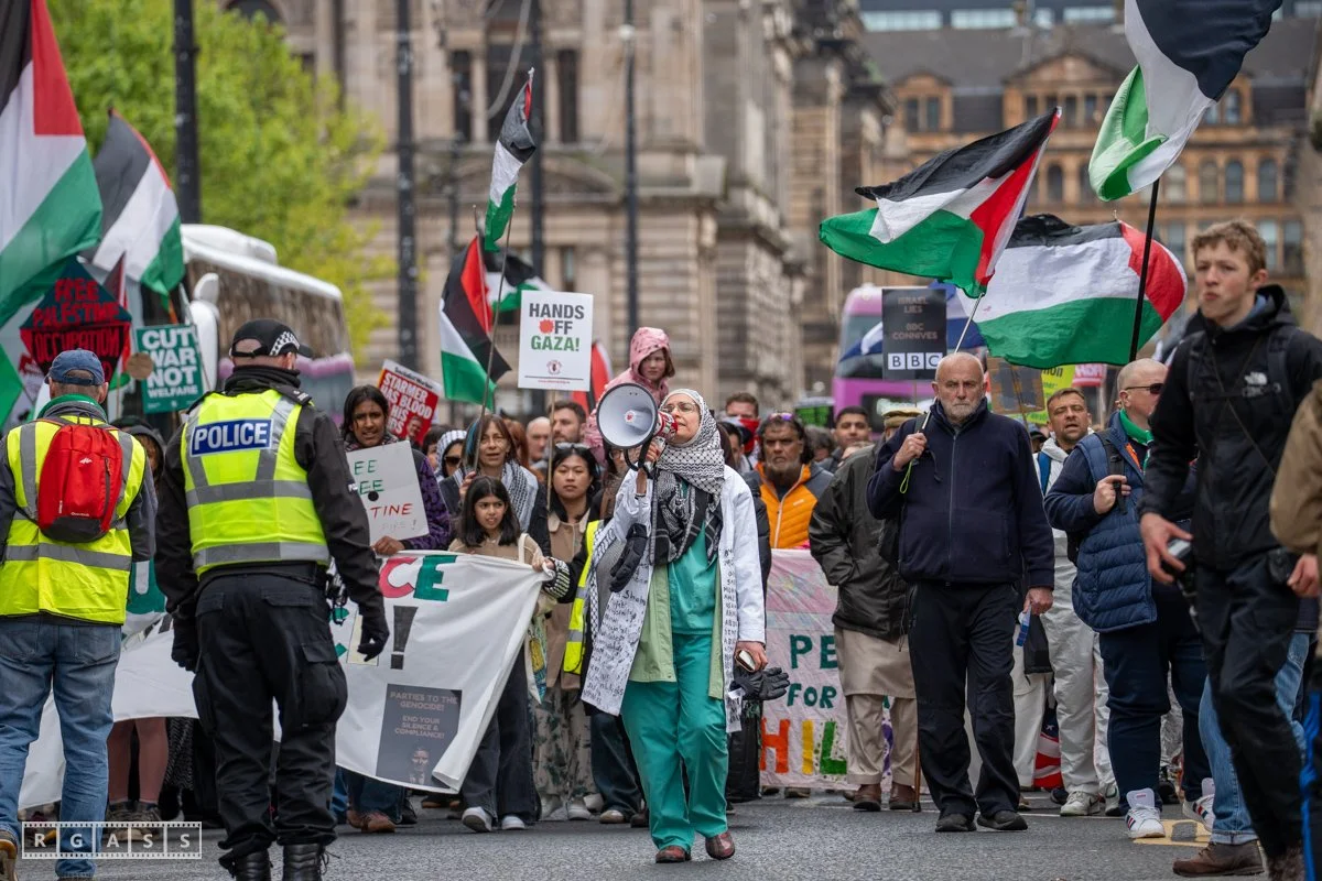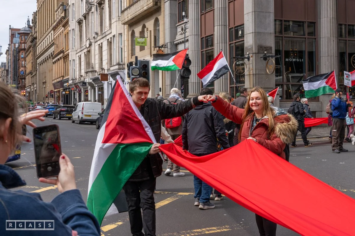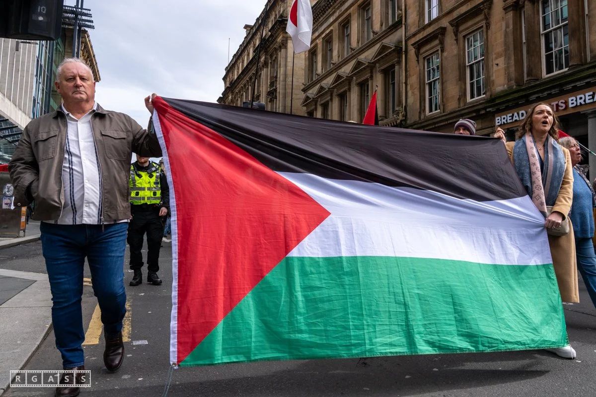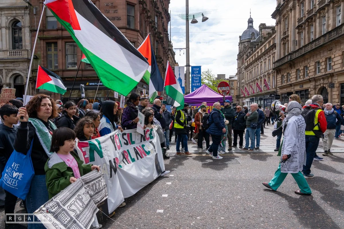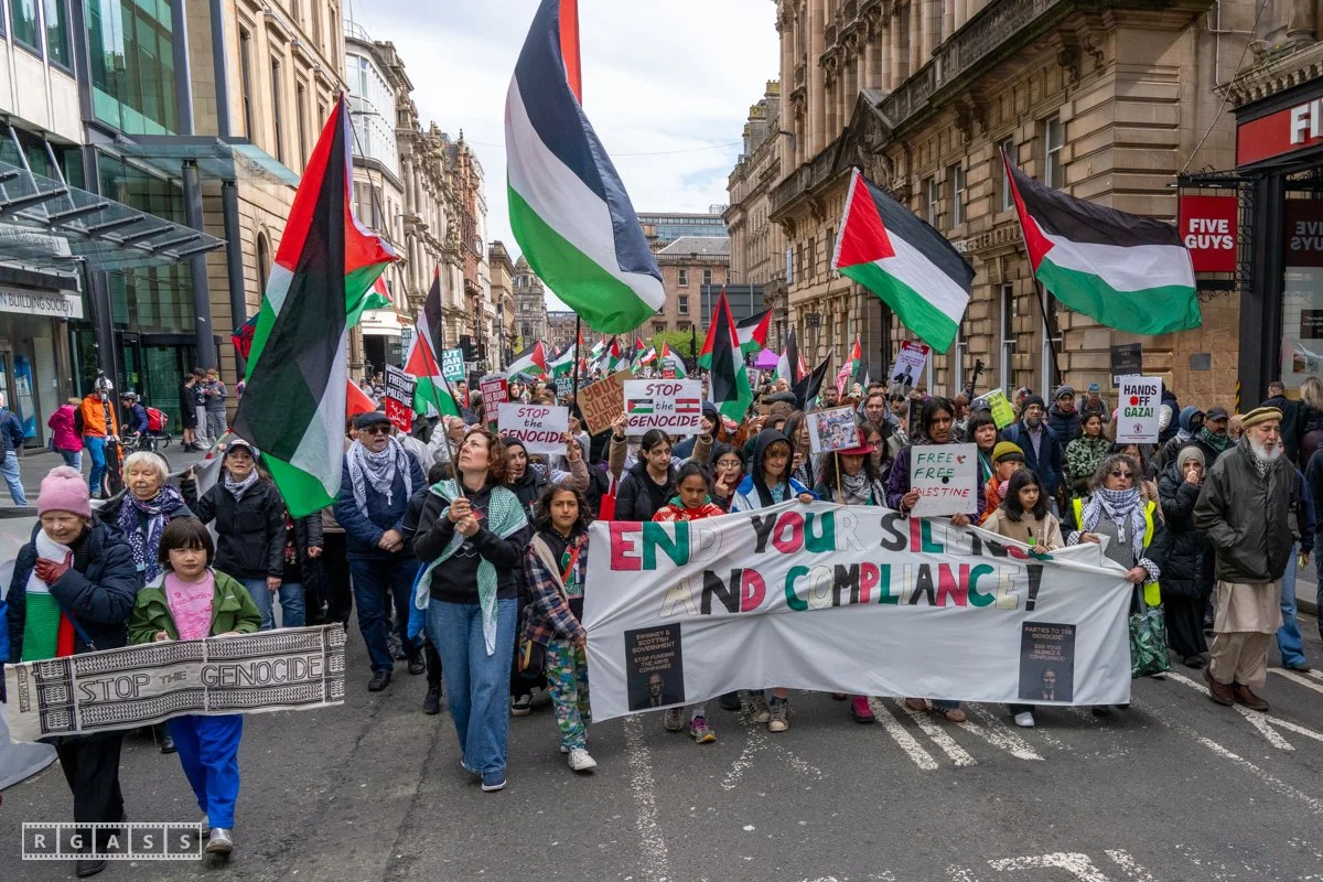 Glasgow Scotland UK. 19 April 2025. Gaza Genocide Emergency Committee (GGEC) national march and rally for Palestine from Glasgow Green to the Buchanan Steps. To protest the continued killing of Palestinians in Gaza