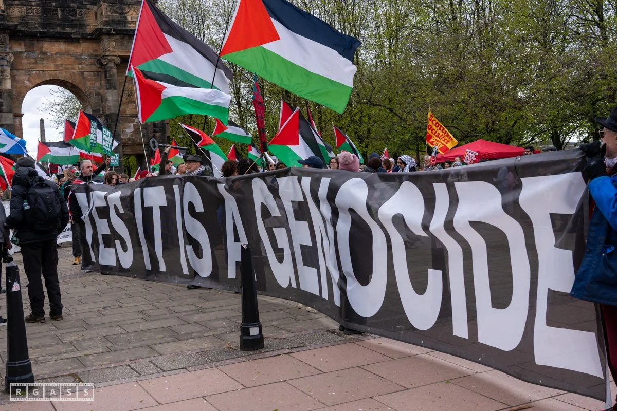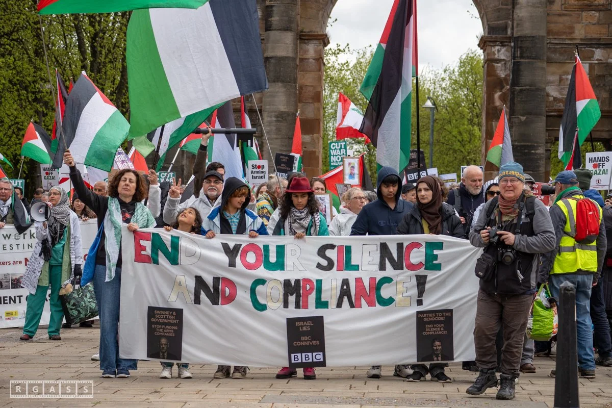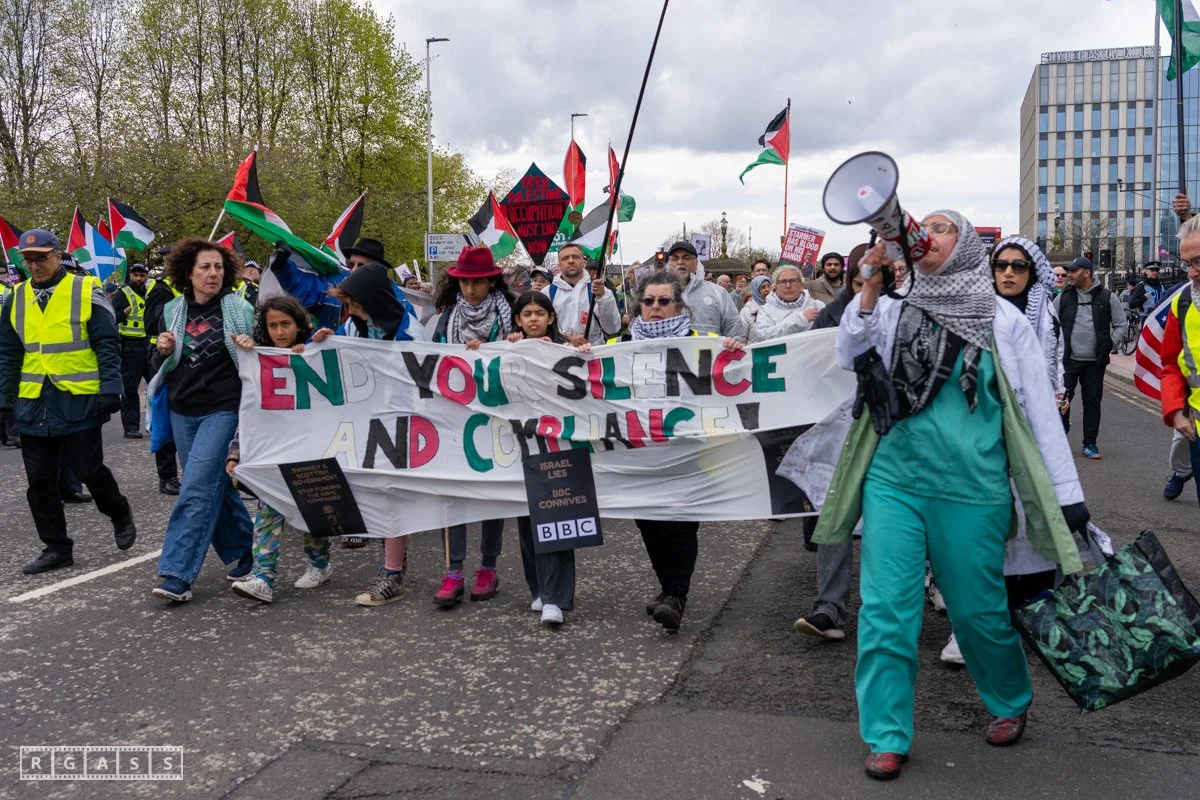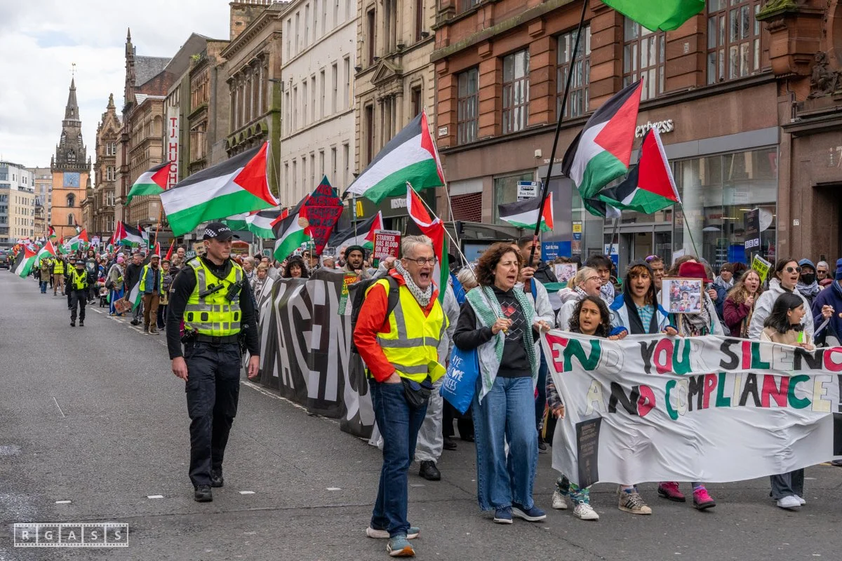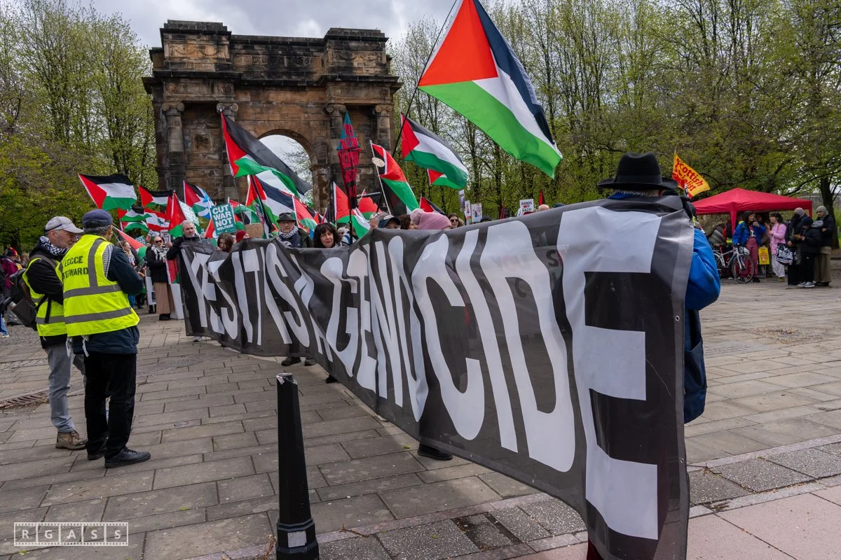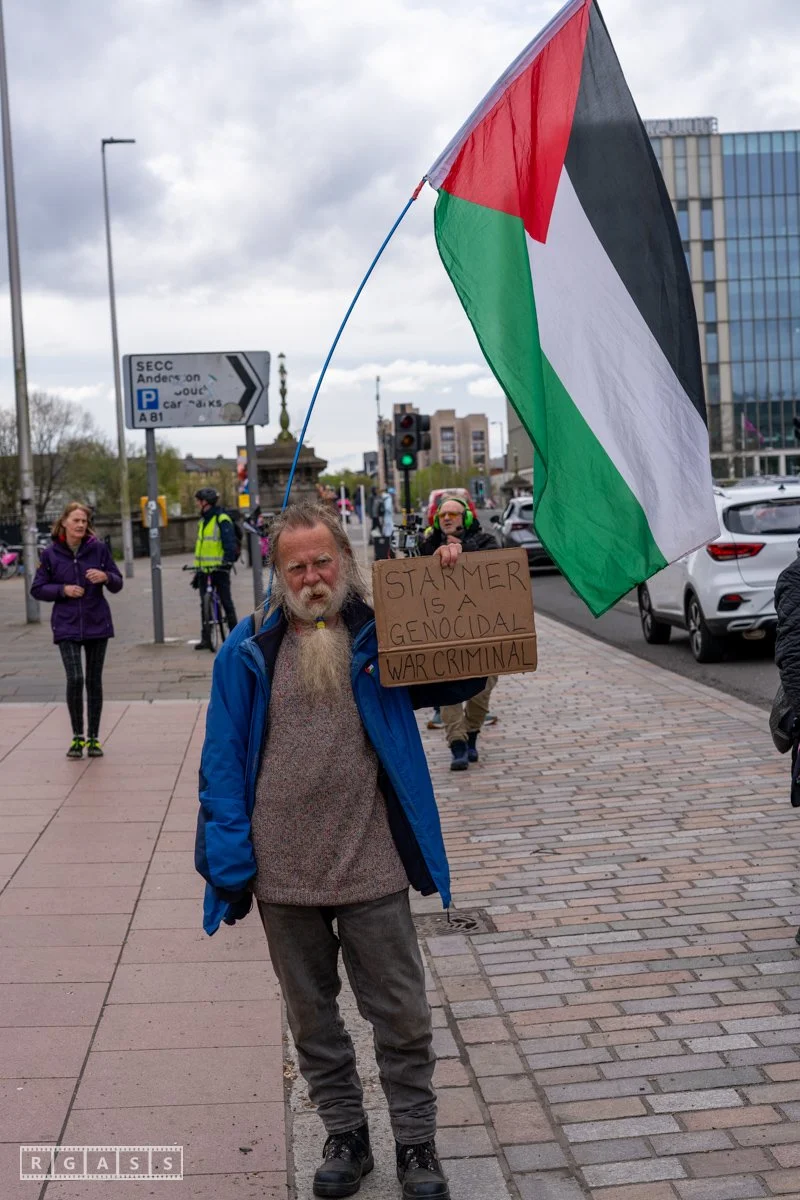 Glasgow Scotland UK. 19 April 2025. Gaza Genocide Emergency Committee (GGEC) national march and rally for Palestine from Glasgow Green to the Buchanan Steps. To protest the continued killing of Palestinians in Gaza
