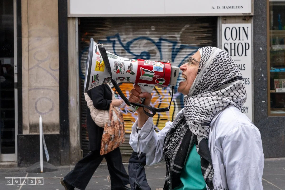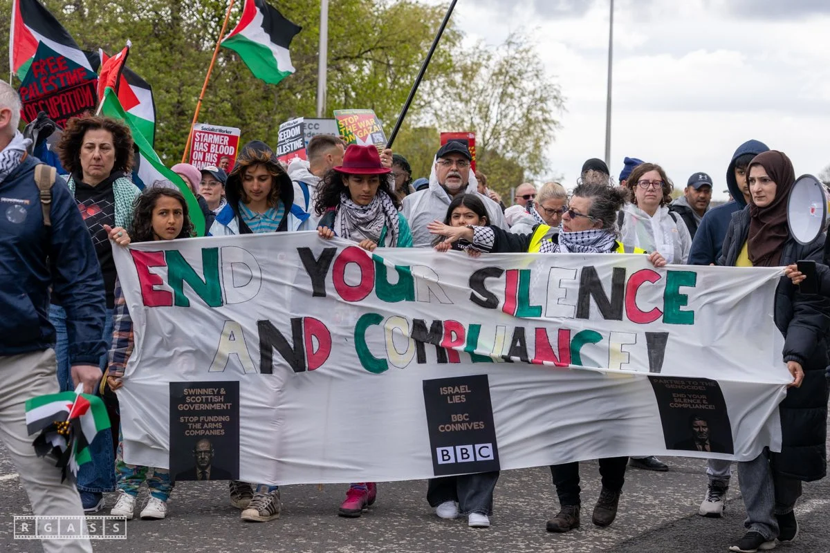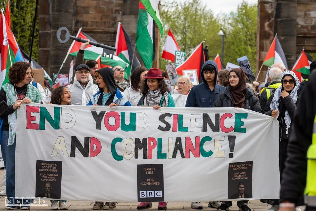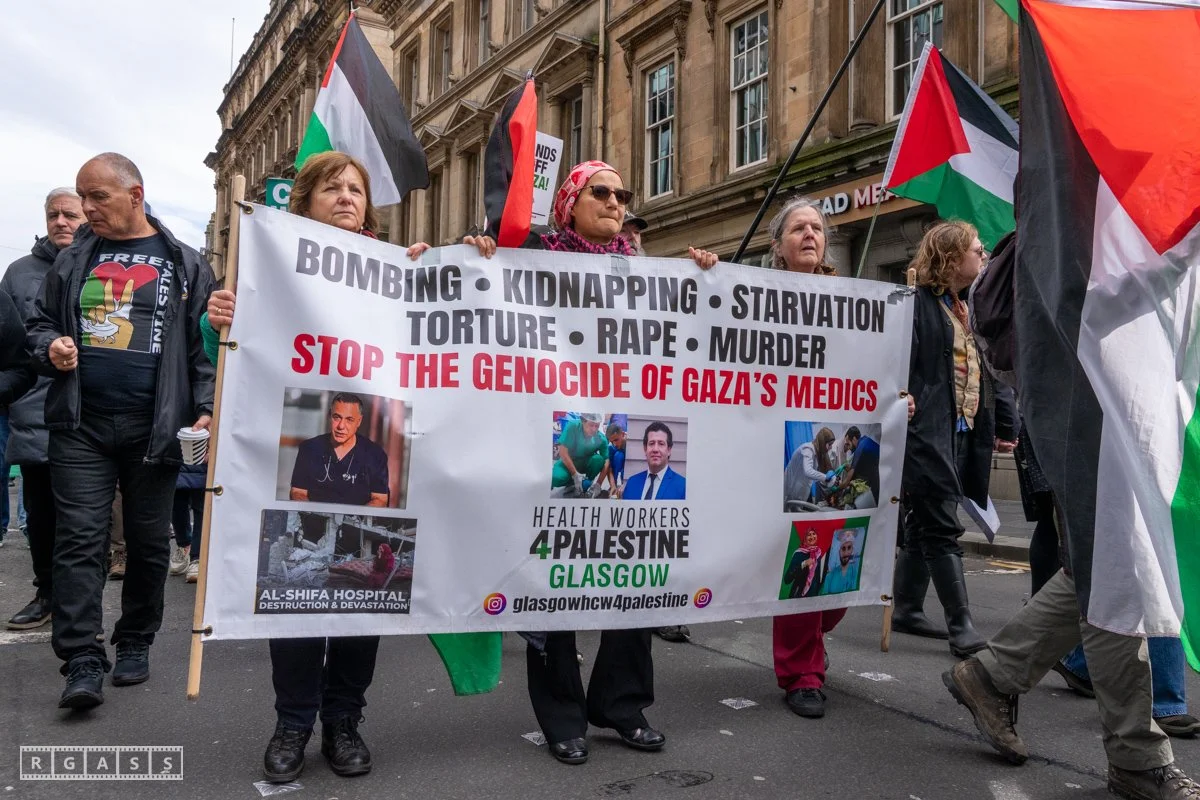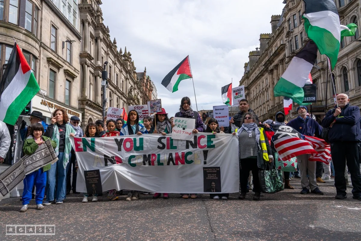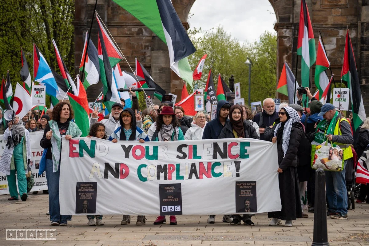 Glasgow Scotland UK. 19 April 2025. Gaza Genocide Emergency Committee (GGEC) national march and rally for Palestine from Glasgow Green to the Buchanan Steps. To protest the continued killing of Palestinians in Gaza