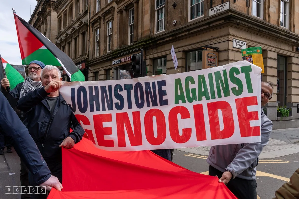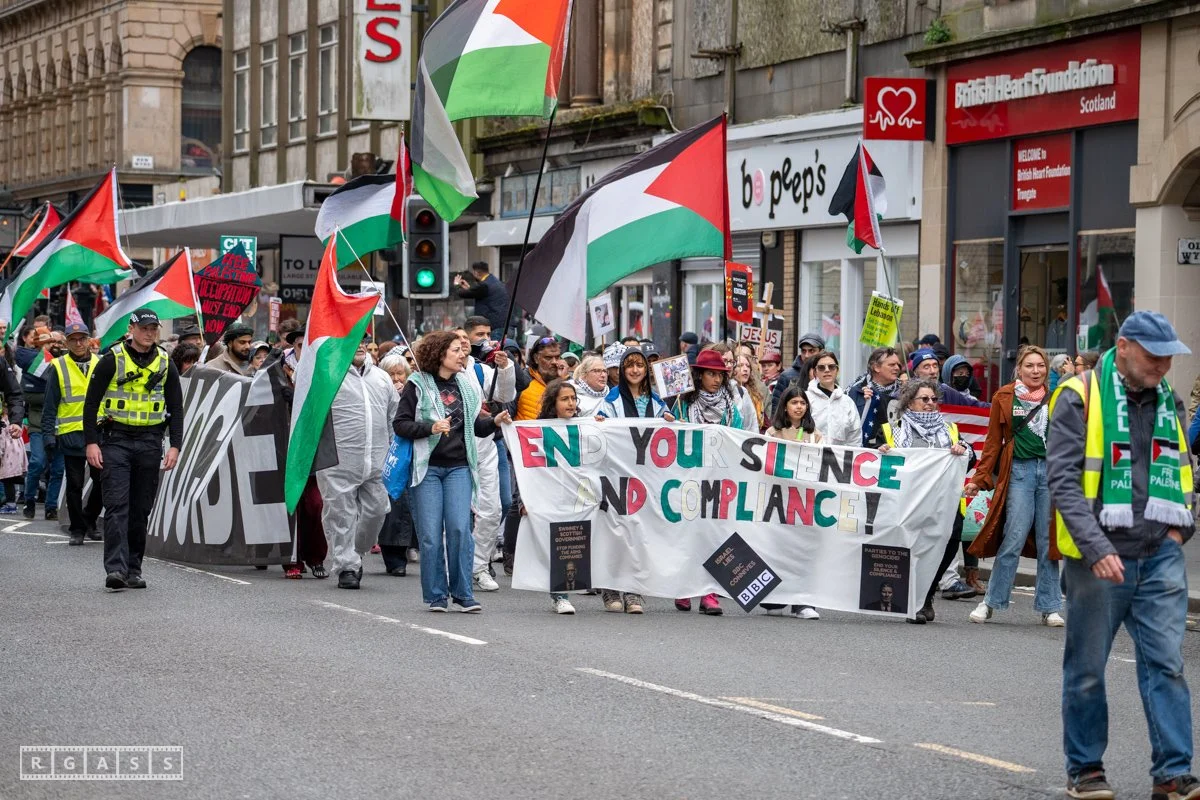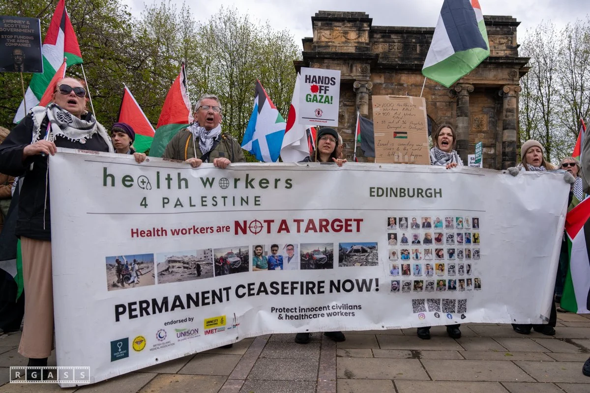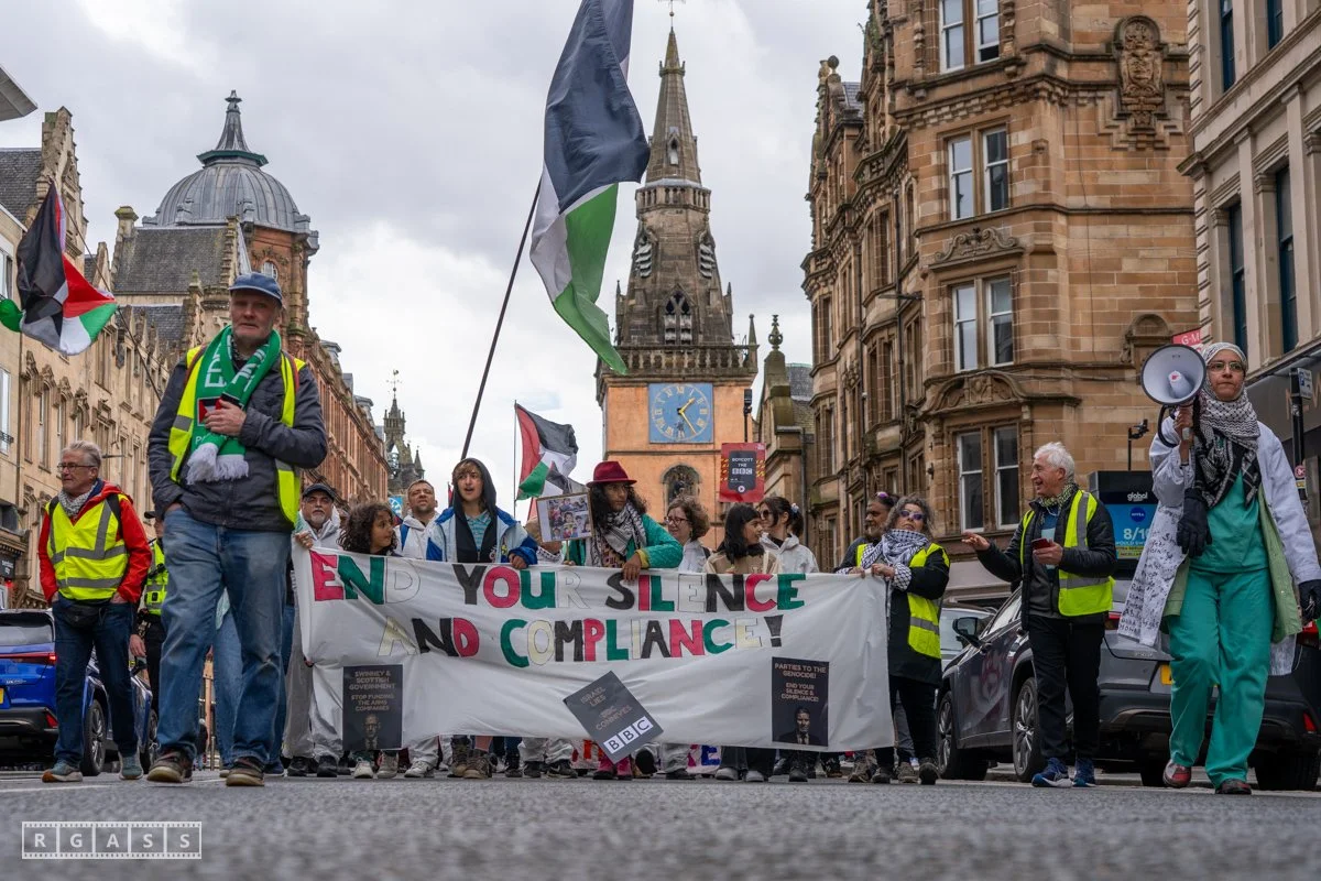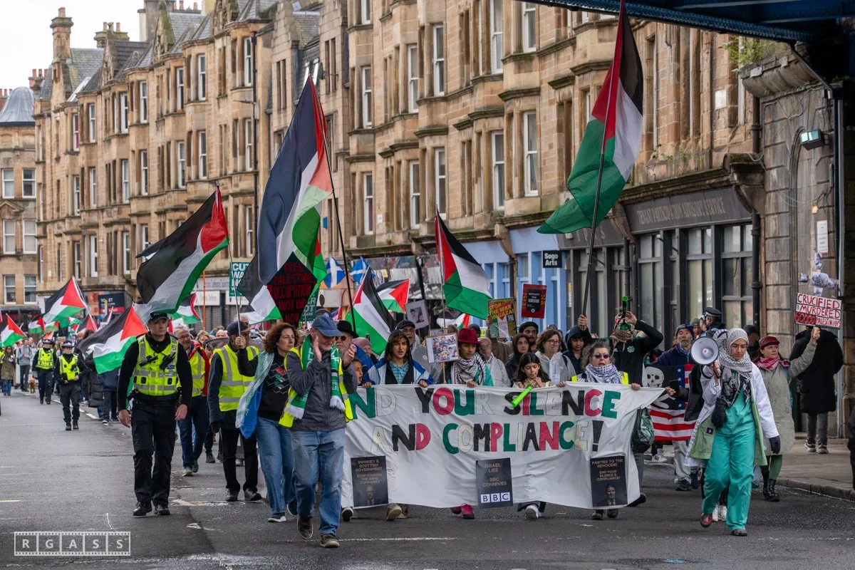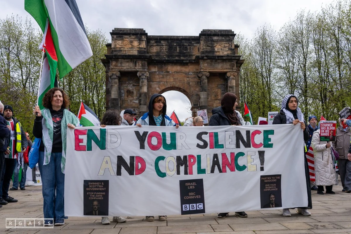 Glasgow Scotland UK. 19 April 2025. Gaza Genocide Emergency Committee (GGEC) national march and rally for Palestine from Glasgow Green to the Buchanan Steps. To protest the continued killing of Palestinians in Gaza