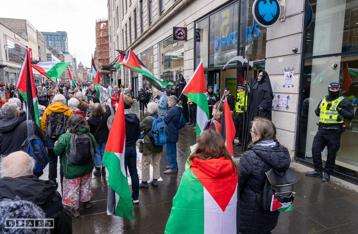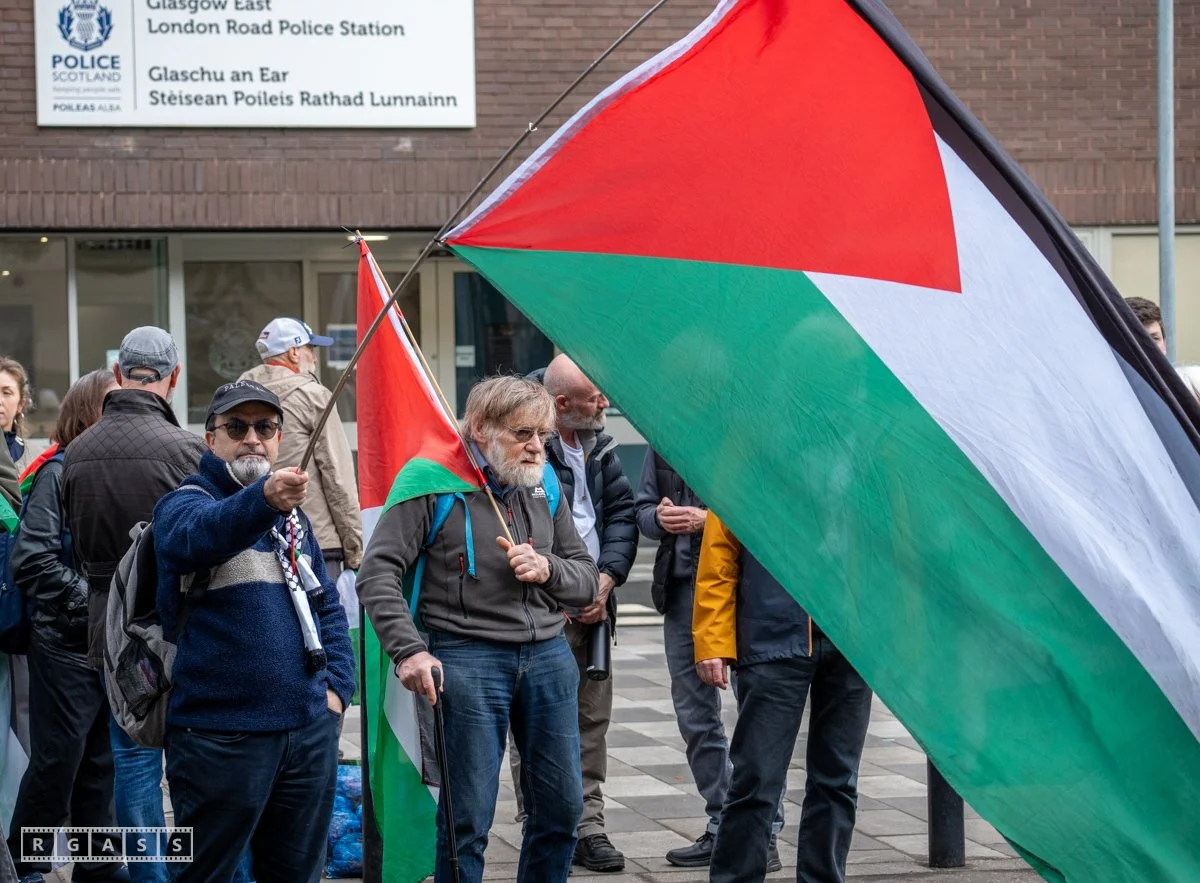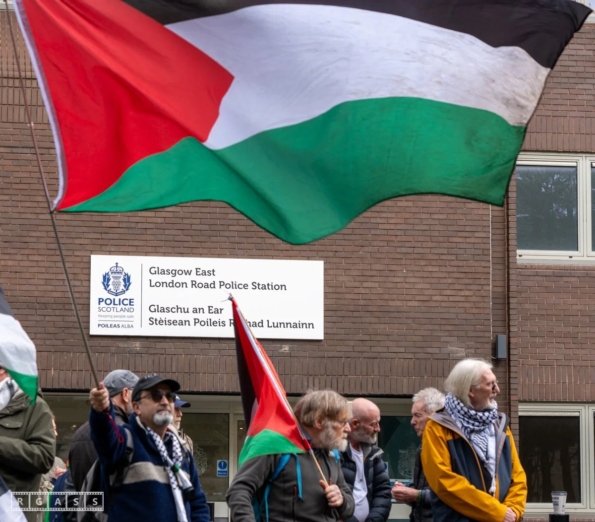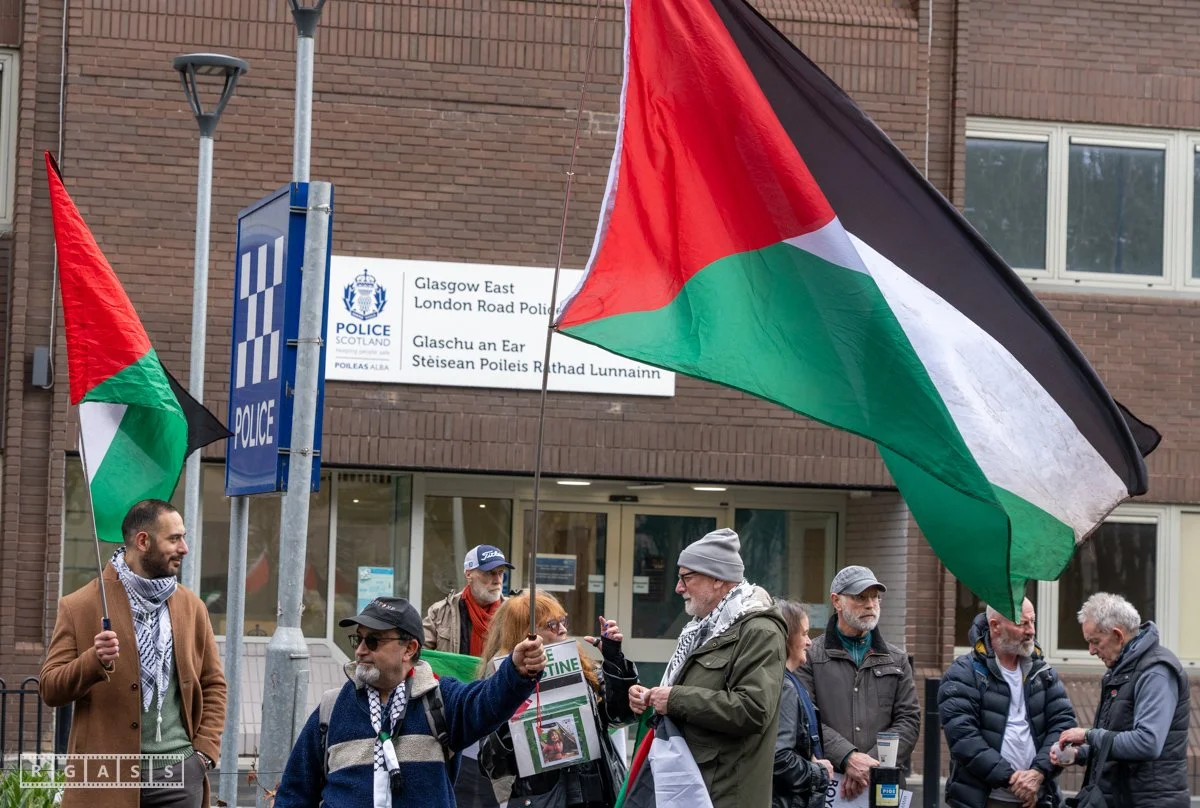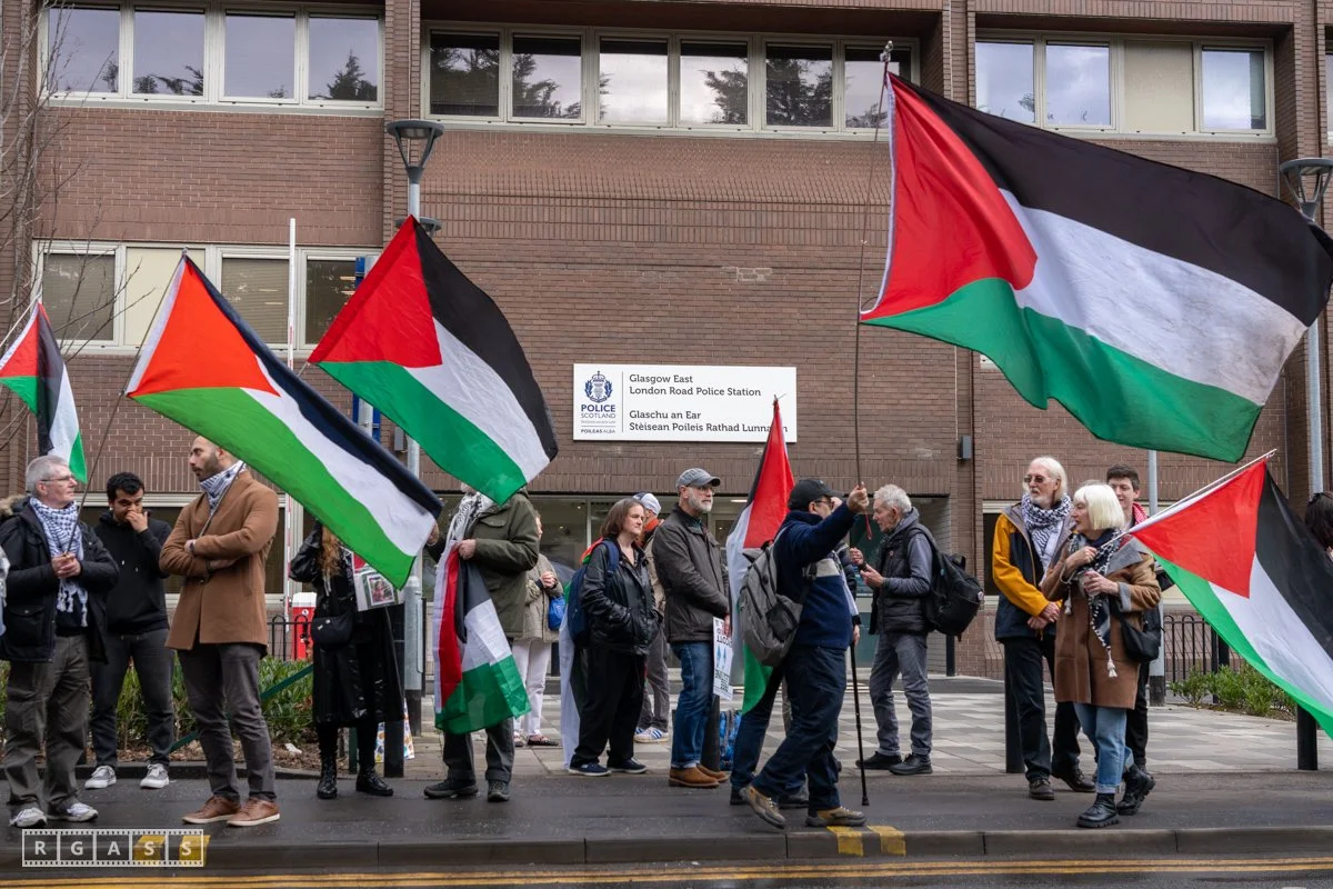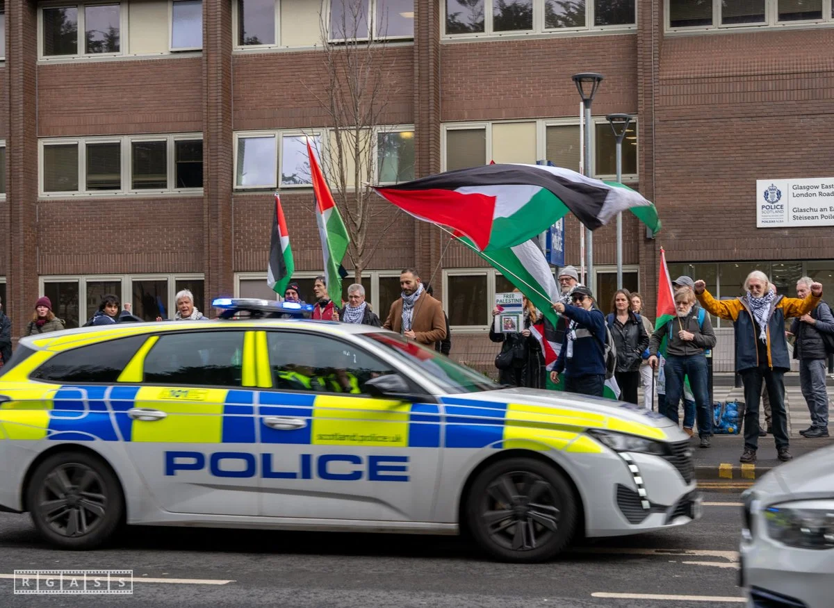 Glasgow UK. 22 March 2025. Pro-Palestine protesters outside Barclays Bank and then outside London Road Police Station, with an incidental scooter club drive past.