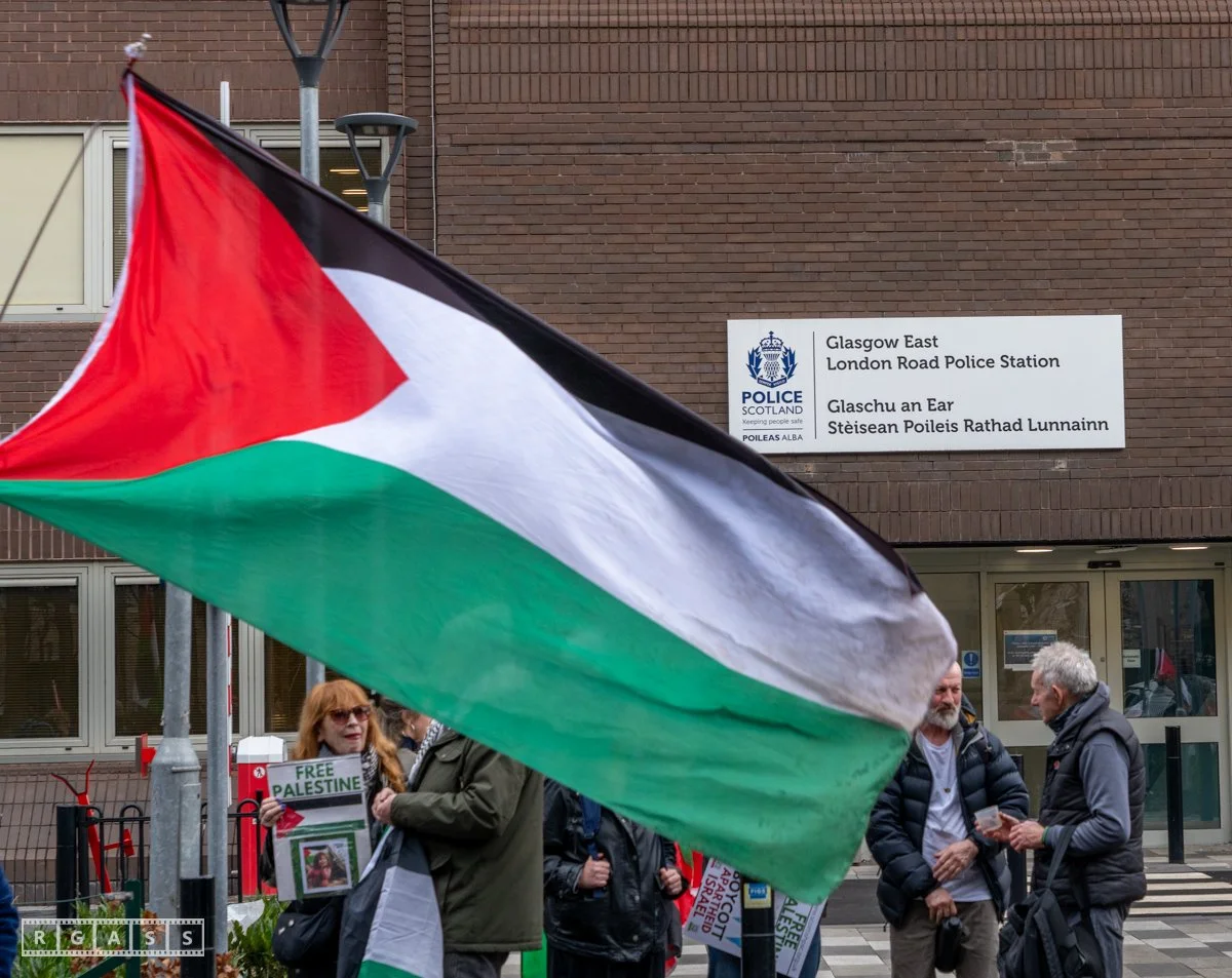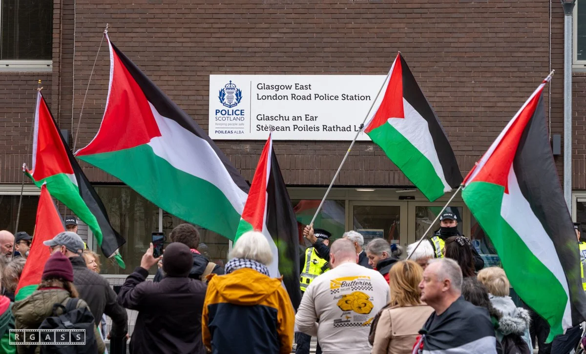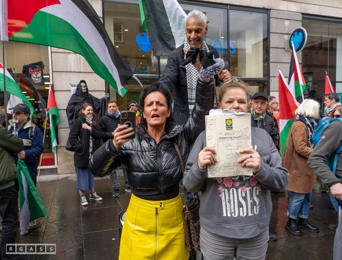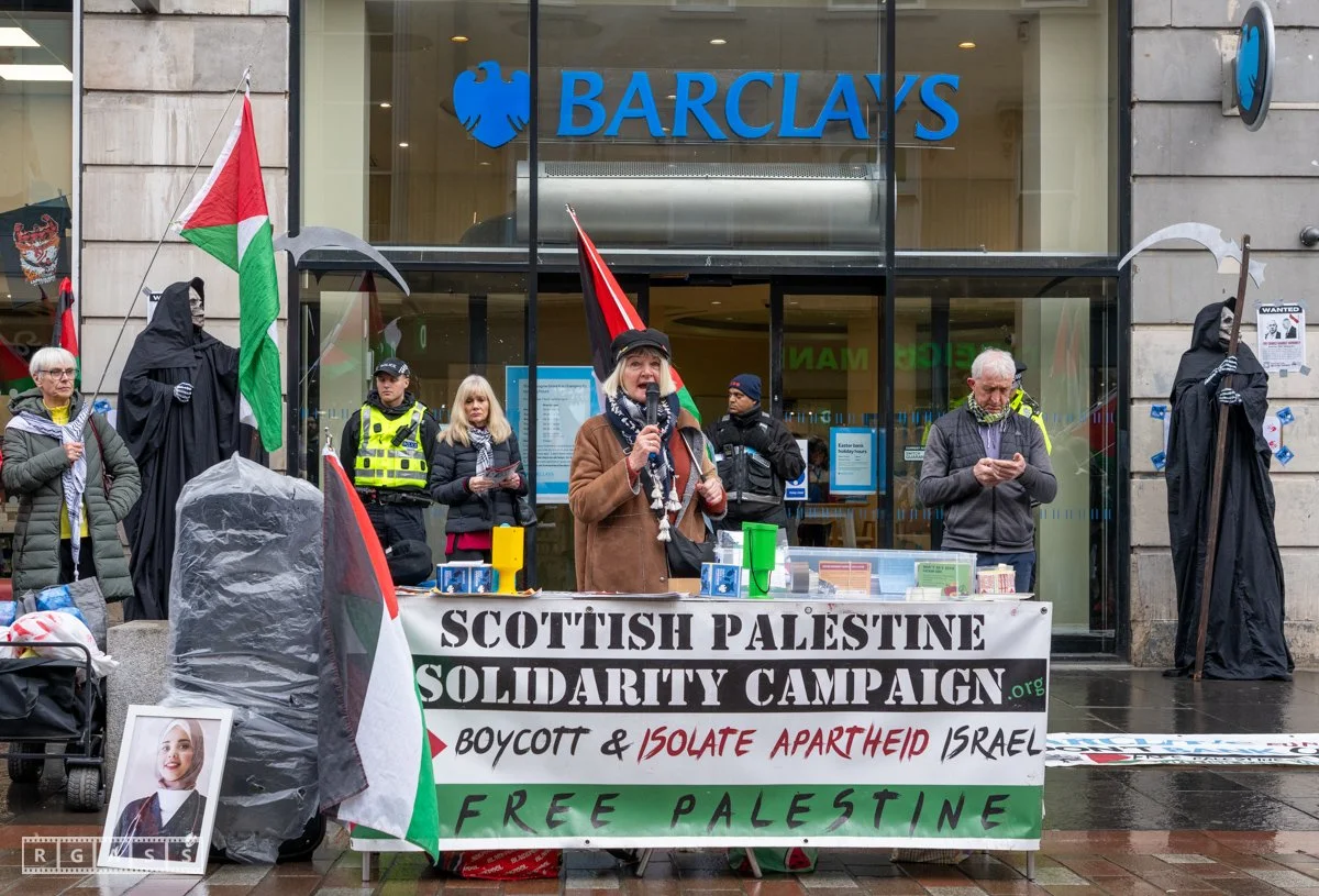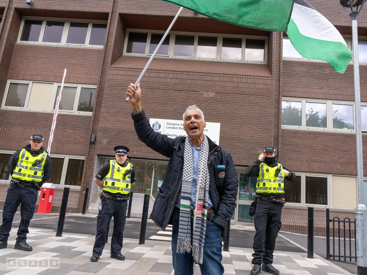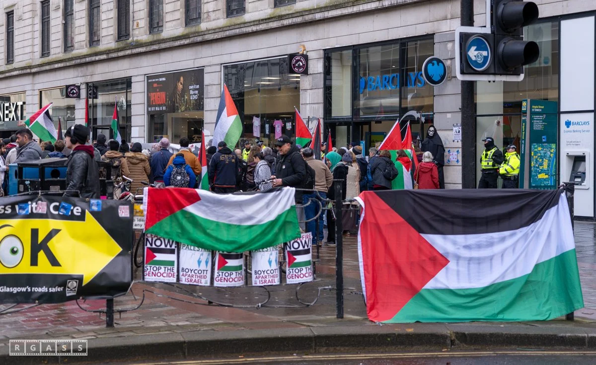 Glasgow UK. 22 March 2025. Pro-Palestine protesters outside Barclays Bank and then outside London Road Police Station, with an incidental scooter club drive past.