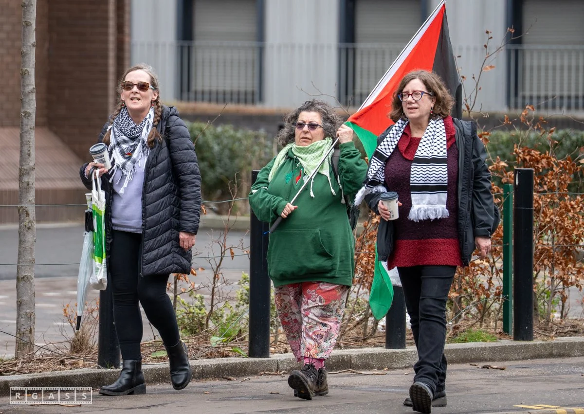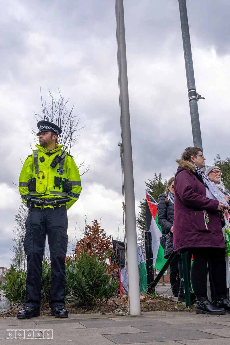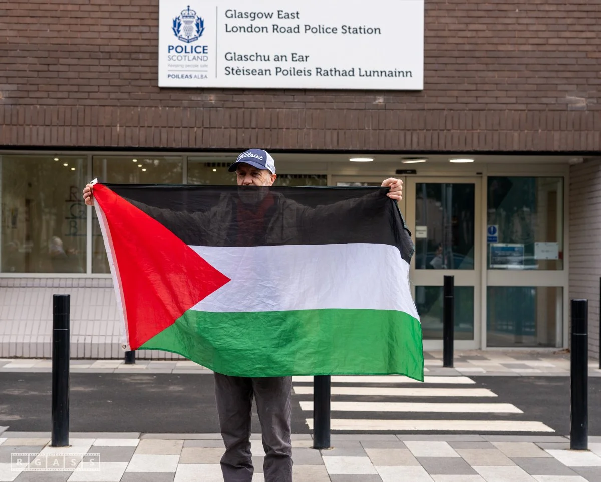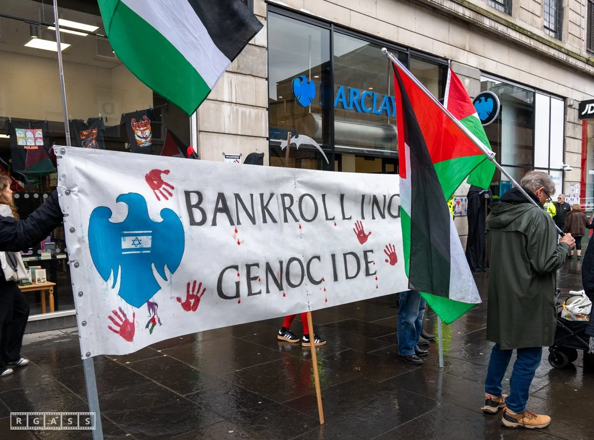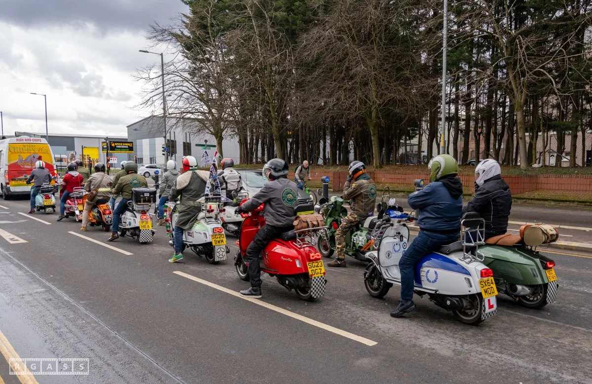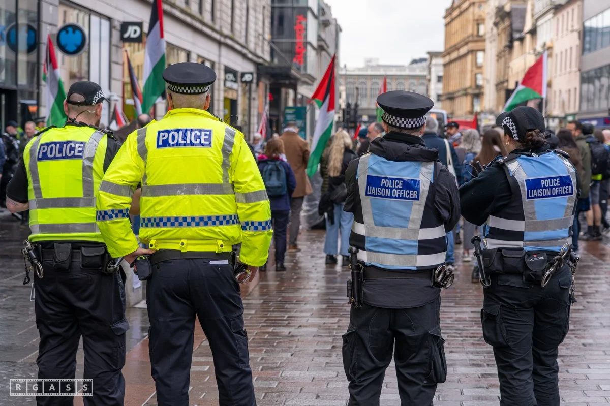 Glasgow UK. 22 March 2025. Pro-Palestine protesters outside Barclays Bank and then outside London Road Police Station, with an incidental scooter club drive past.