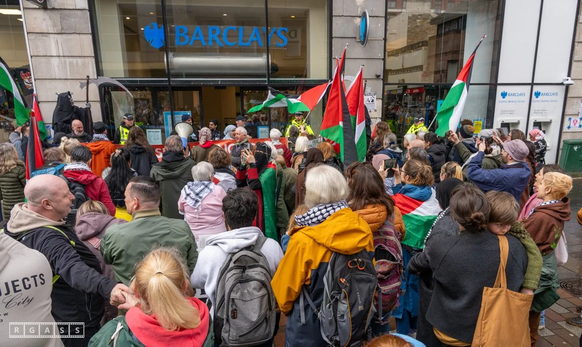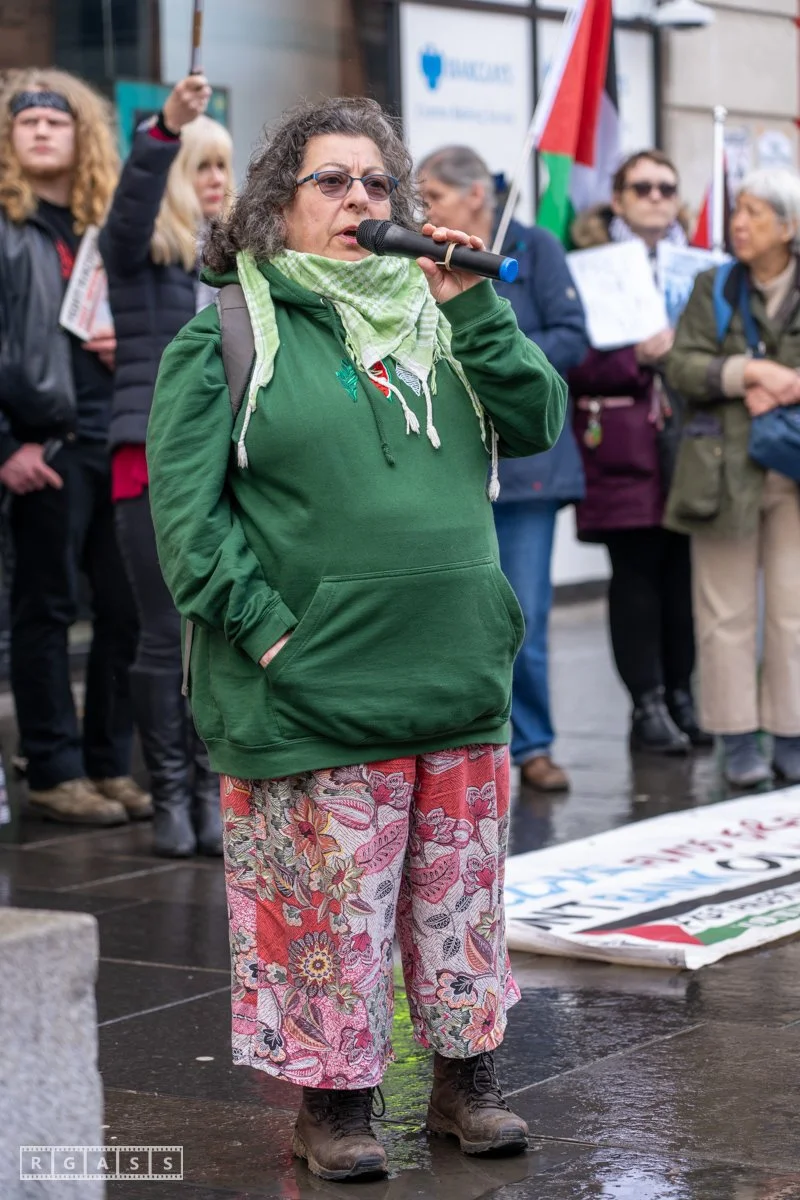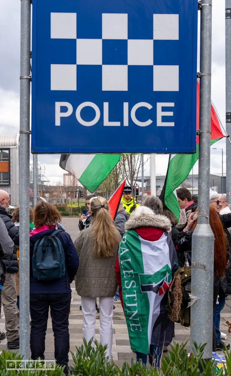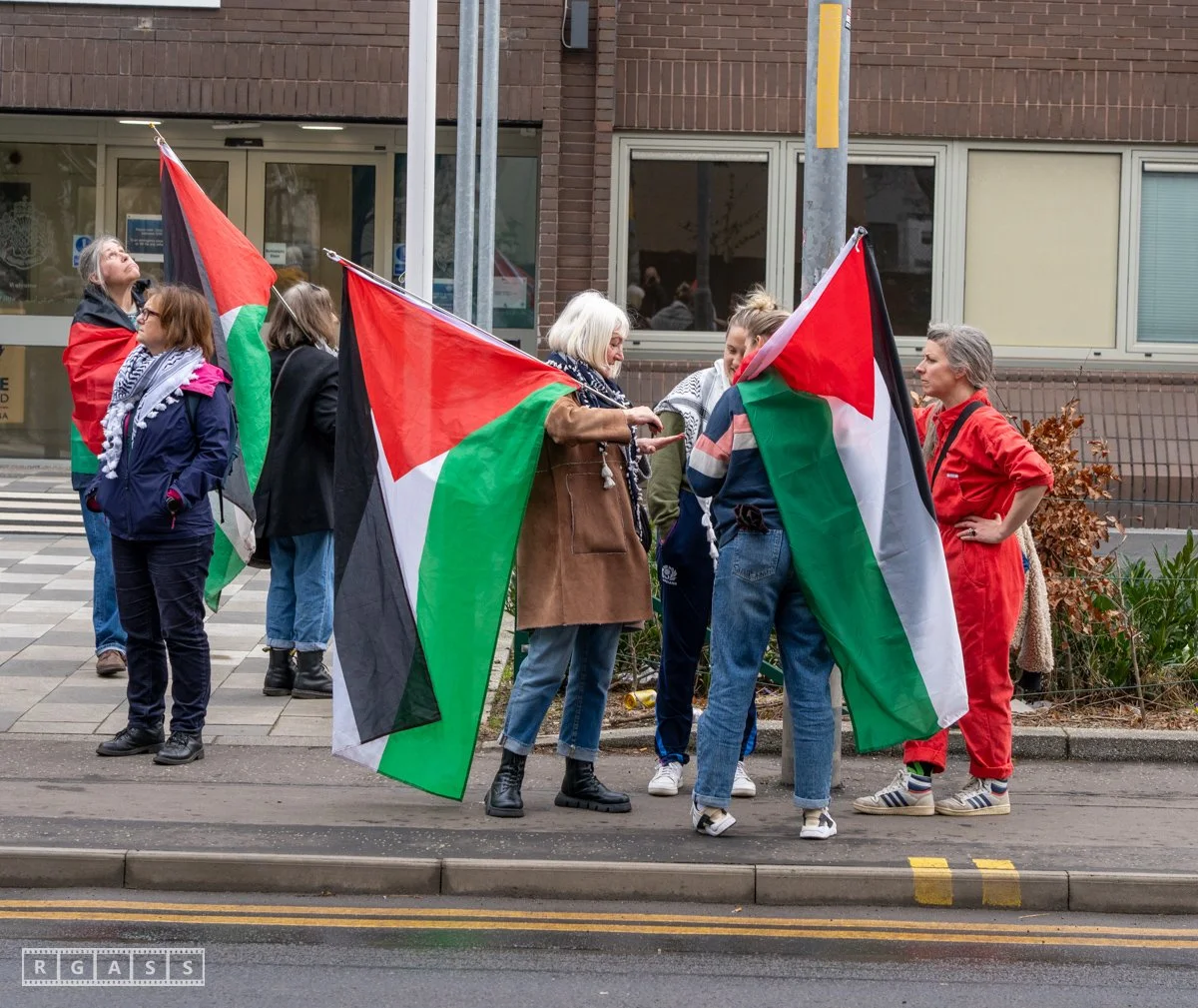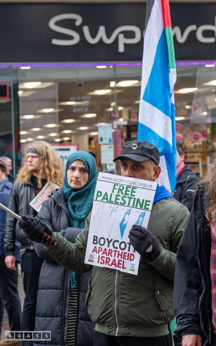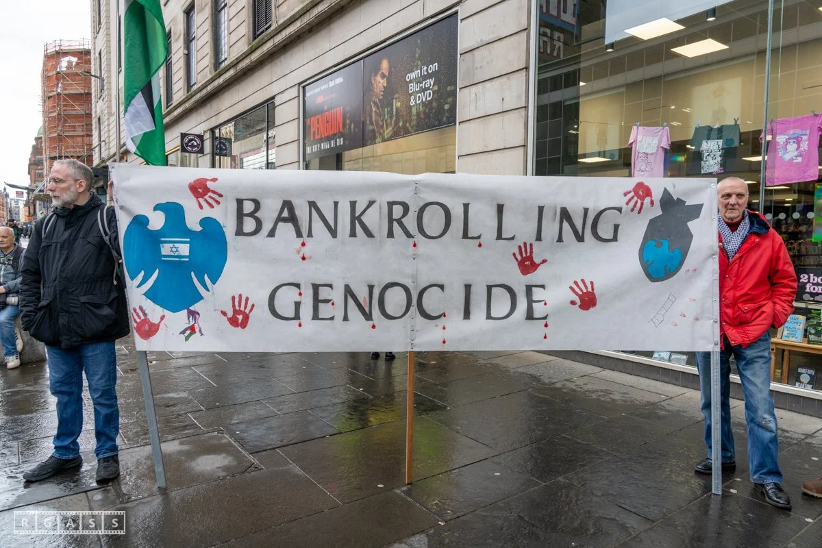 Glasgow UK. 22 March 2025. Pro-Palestine protesters outside Barclays Bank and then outside London Road Police Station, with an incidental scooter club drive past.