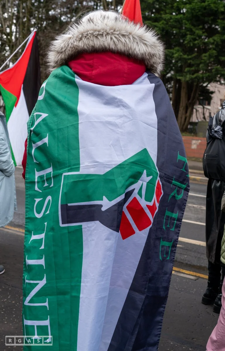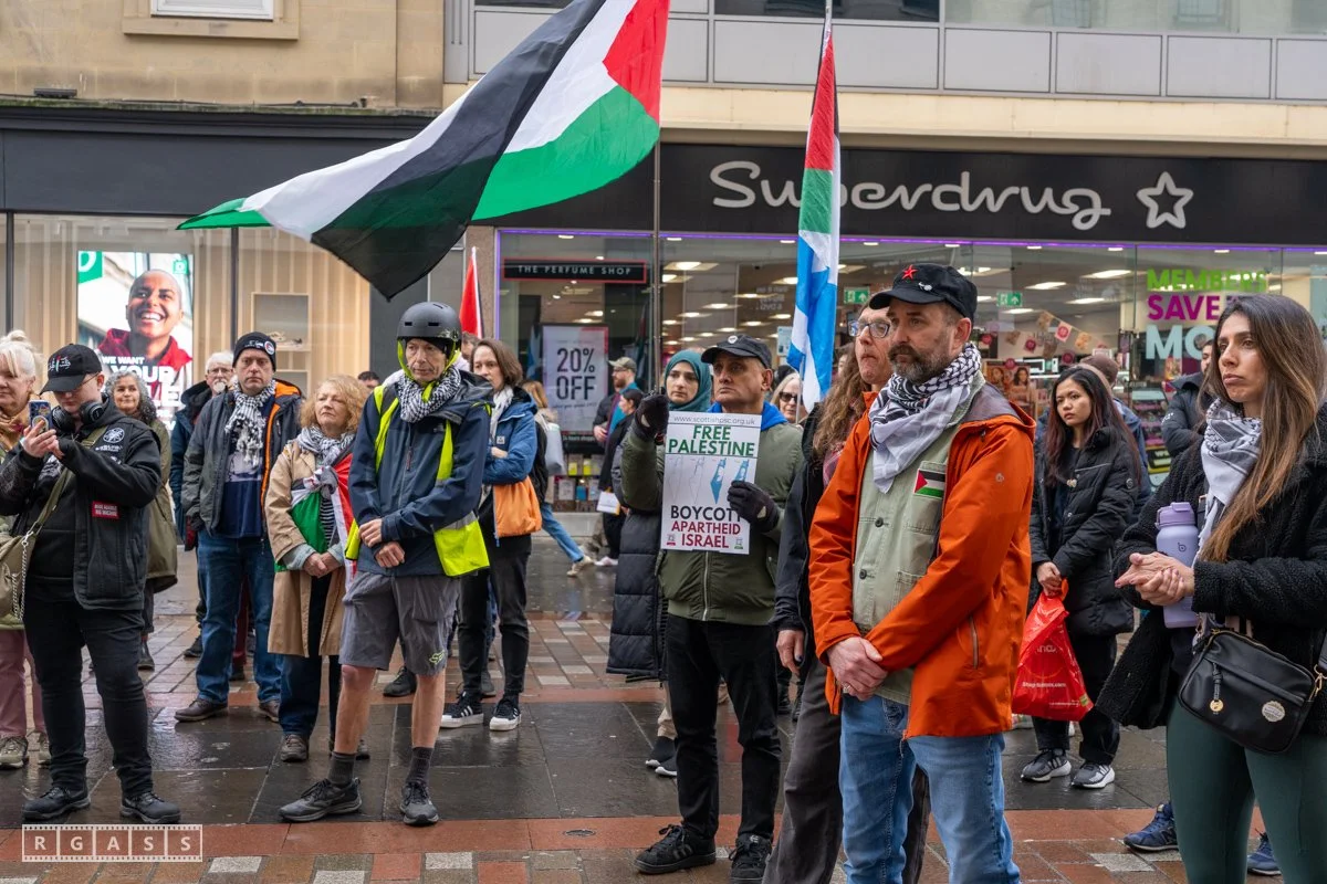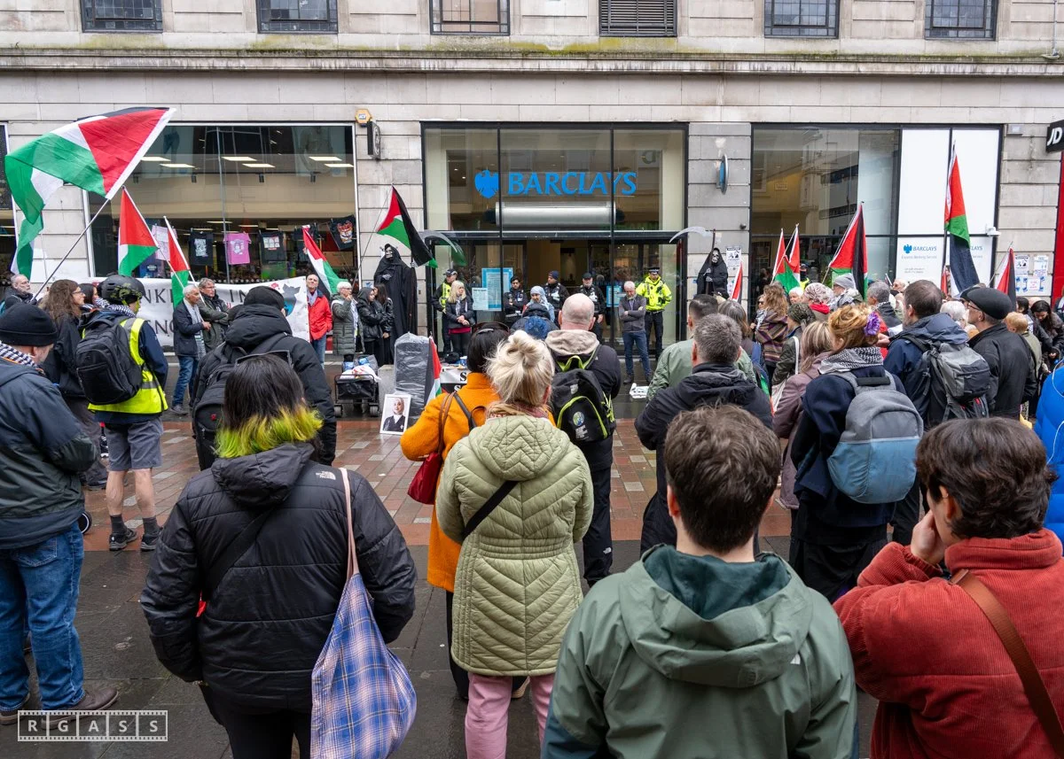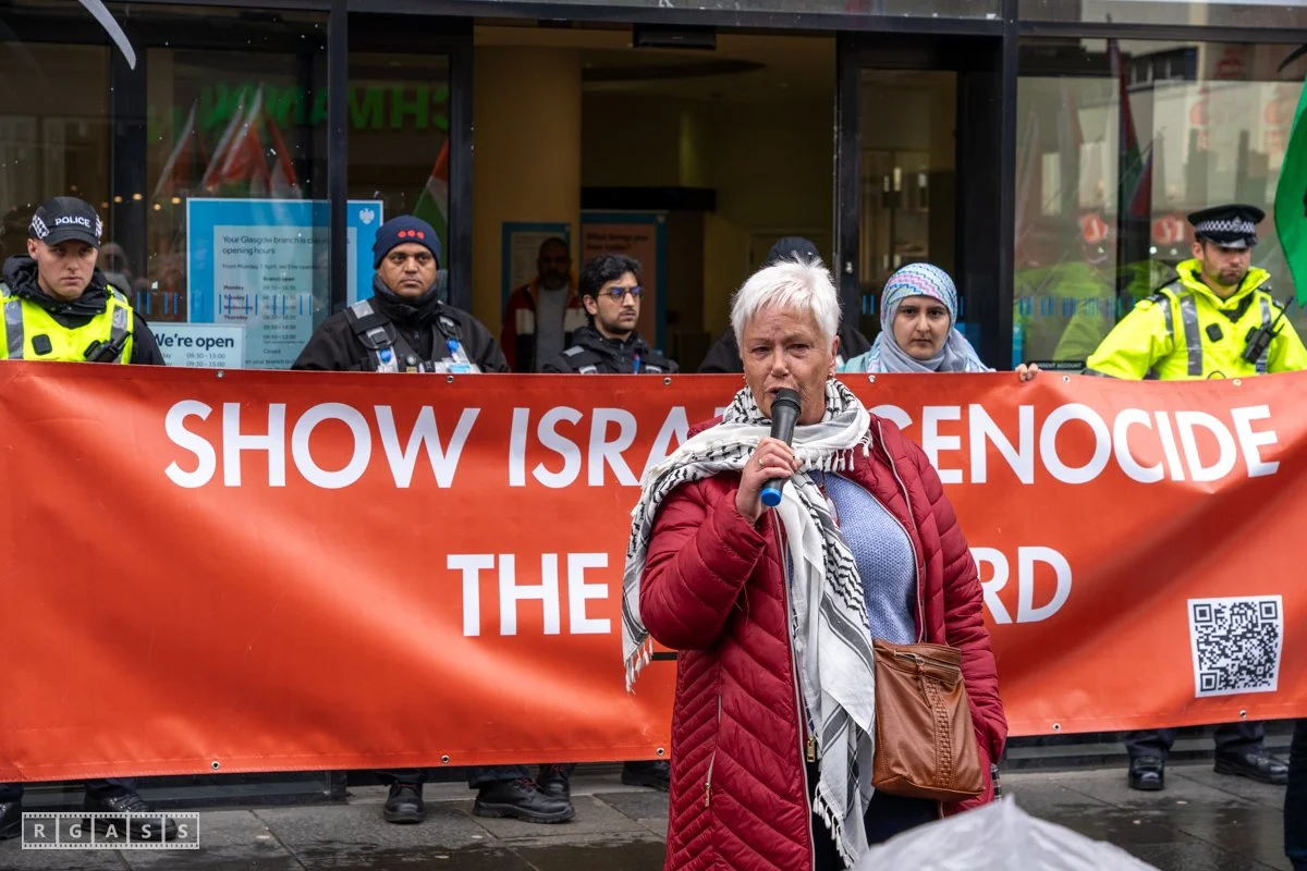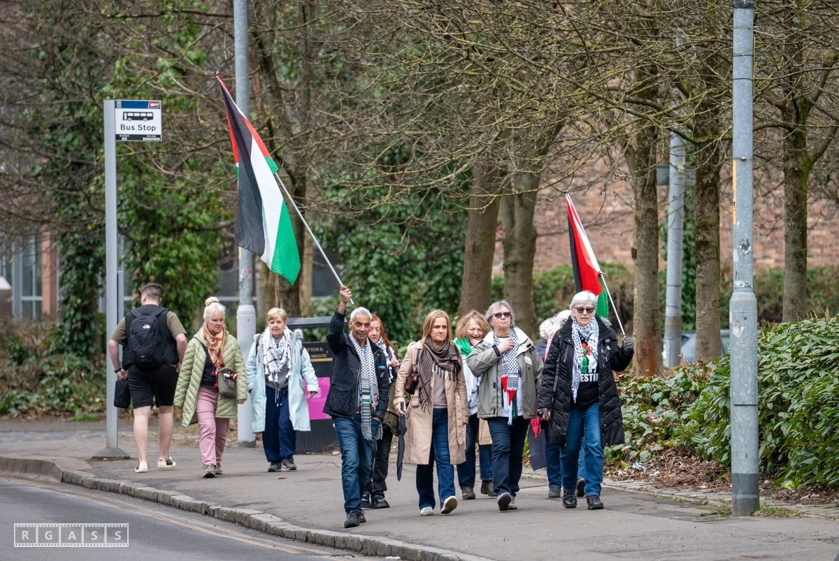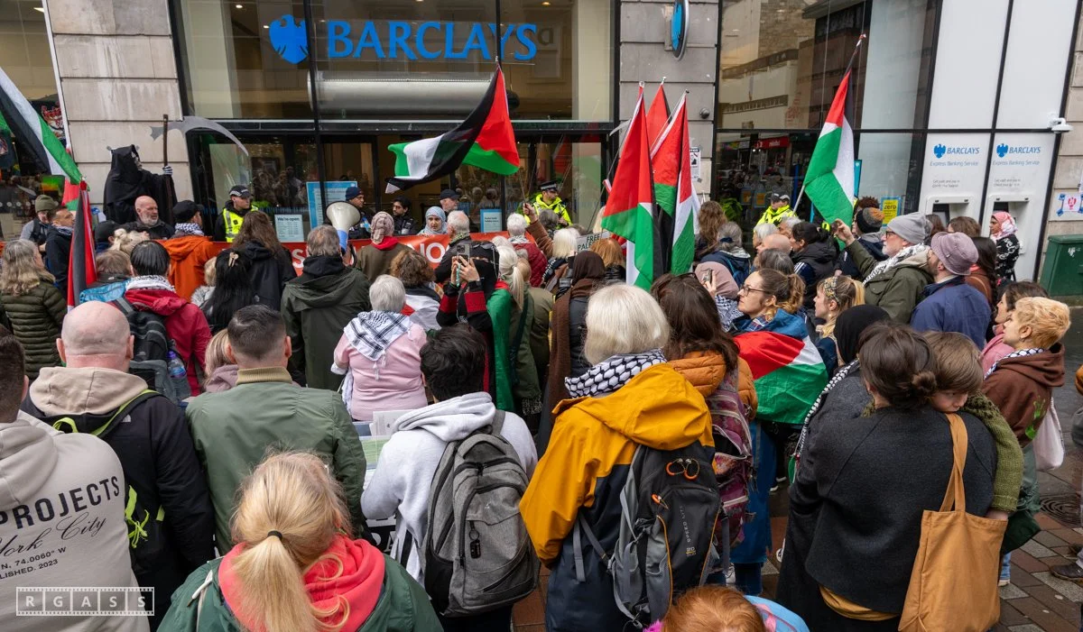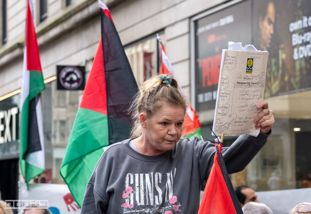 Glasgow UK. 22 March 2025. Pro-Palestine protesters outside Barclays Bank and then outside London Road Police Station, with an incidental scooter club drive past.