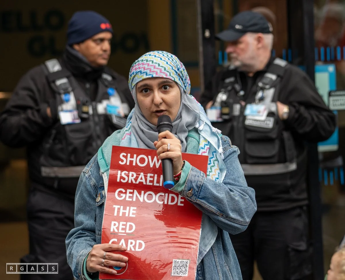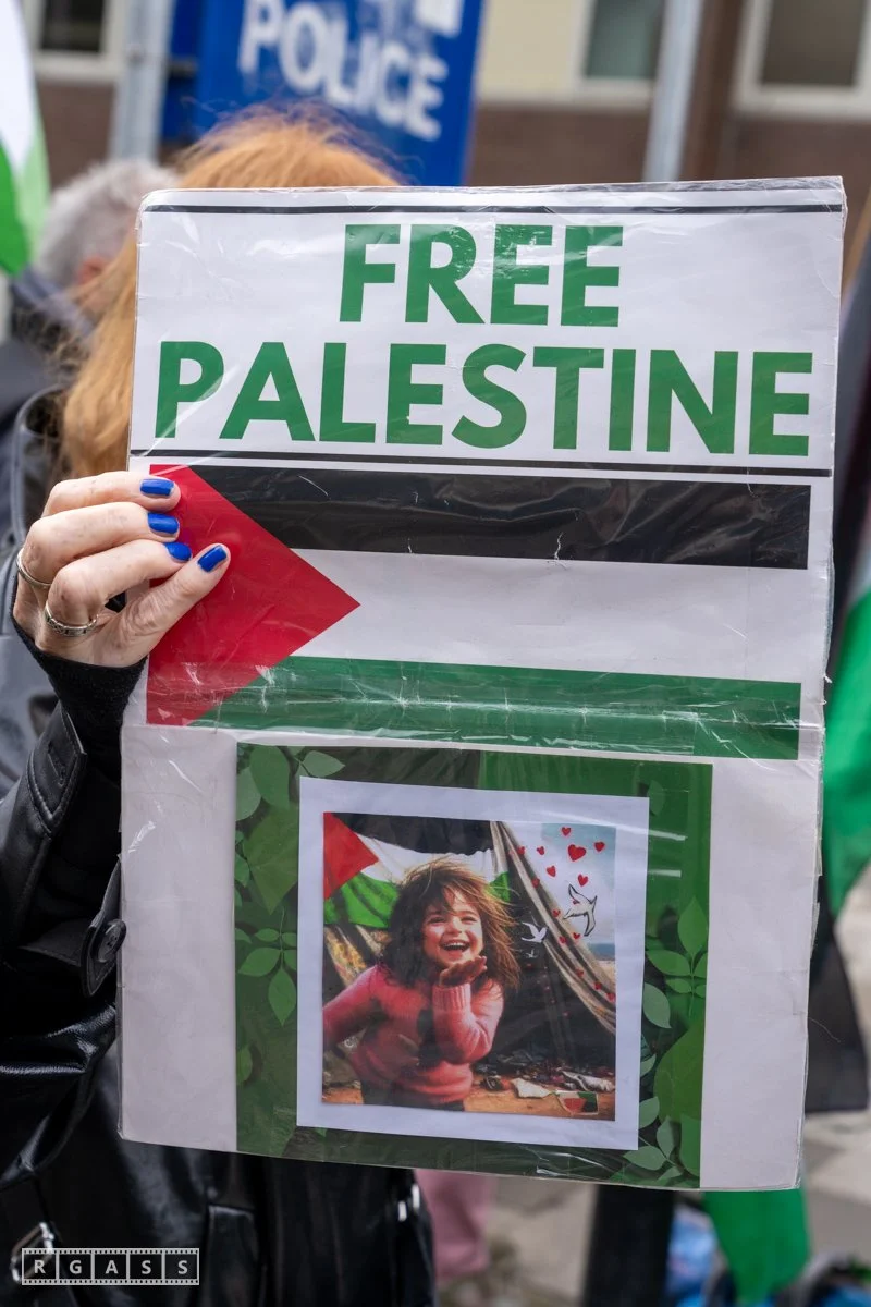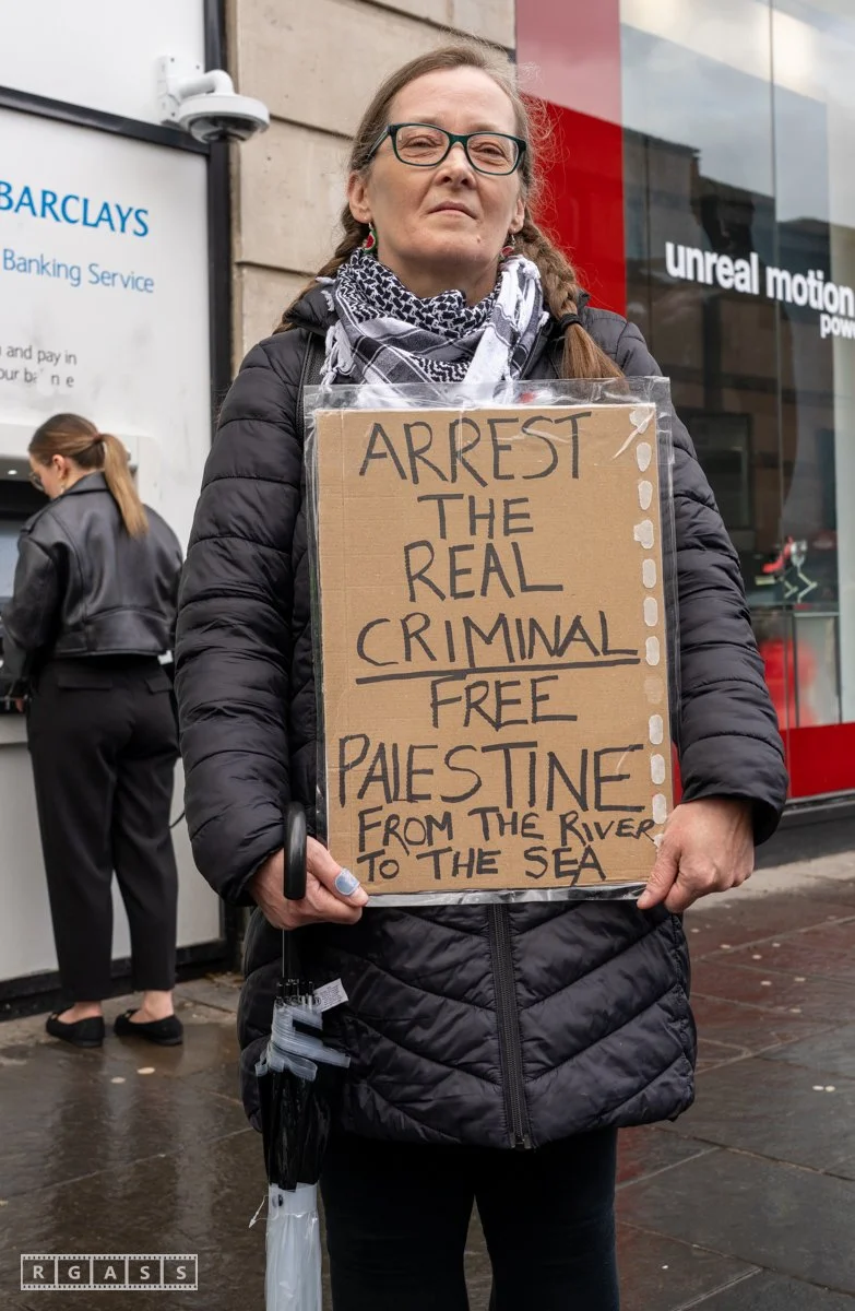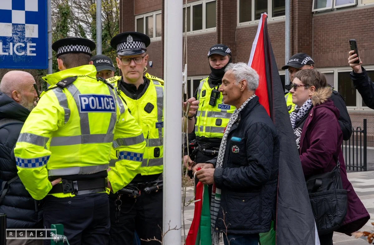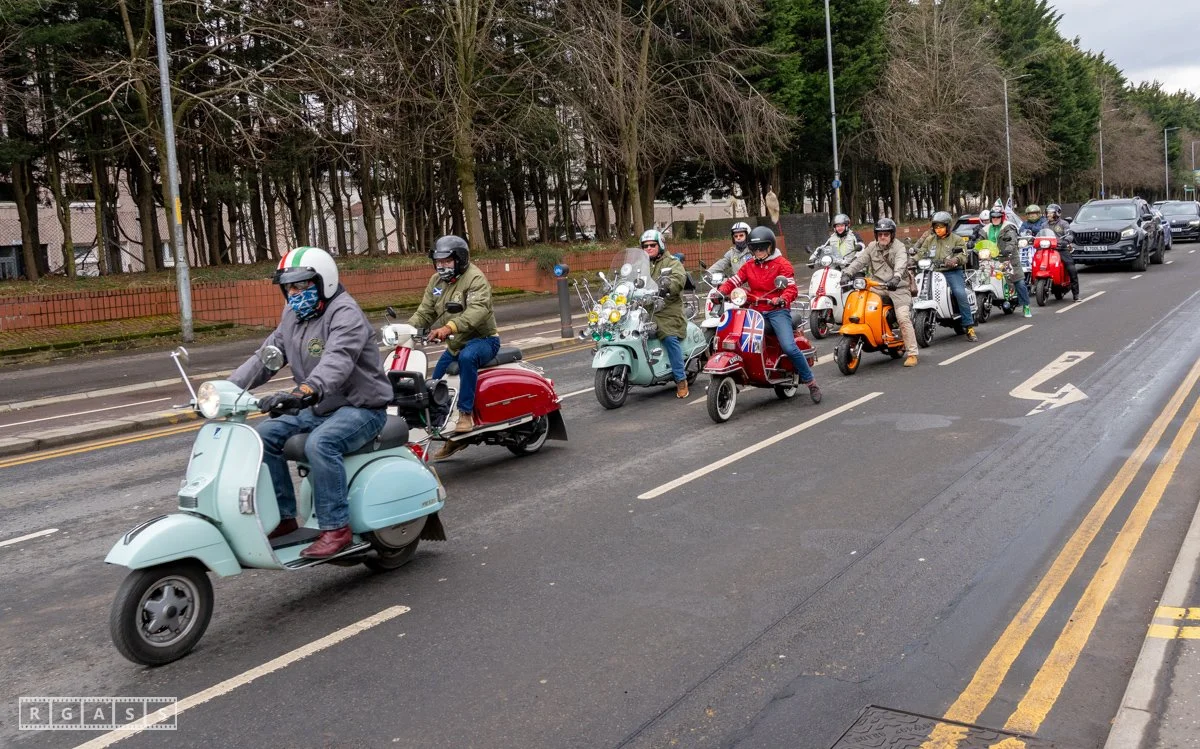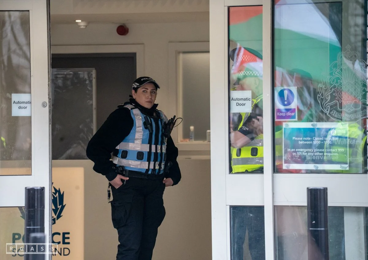 Glasgow UK. 22 March 2025. Pro-Palestine protesters outside Barclays Bank and then outside London Road Police Station, with an incidental scooter club drive past.