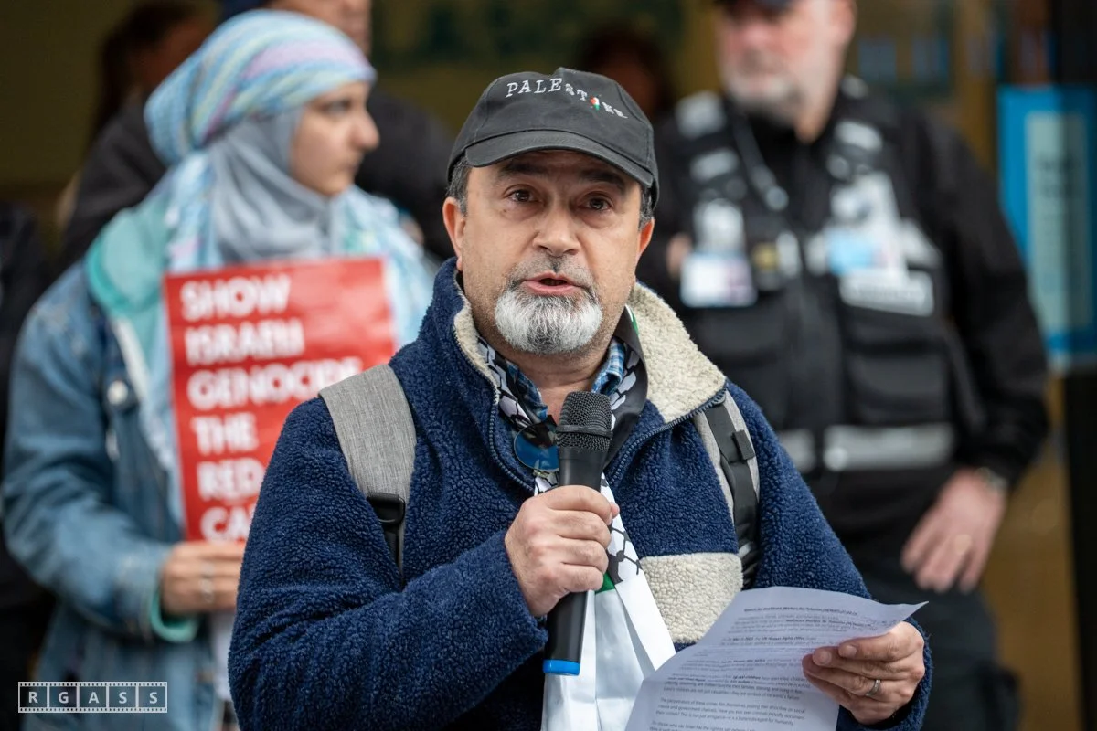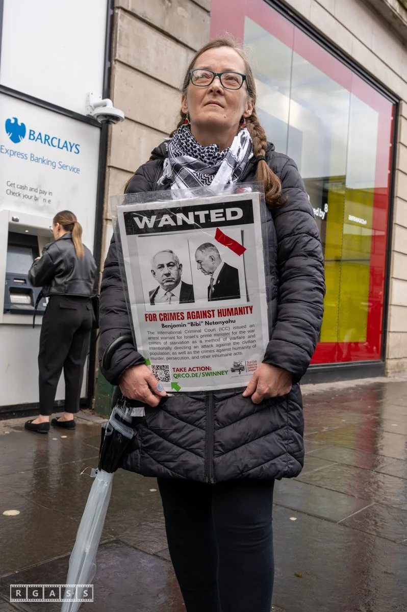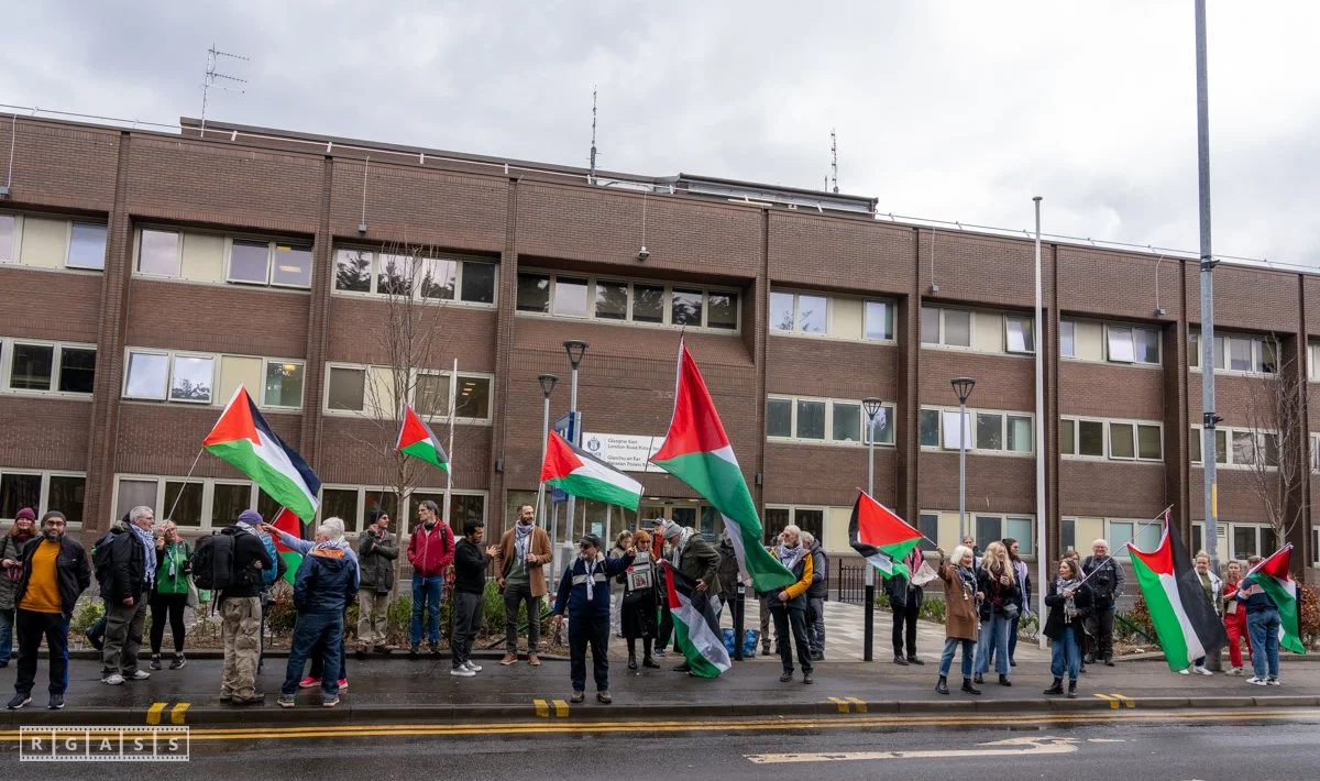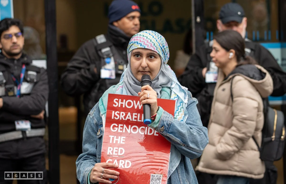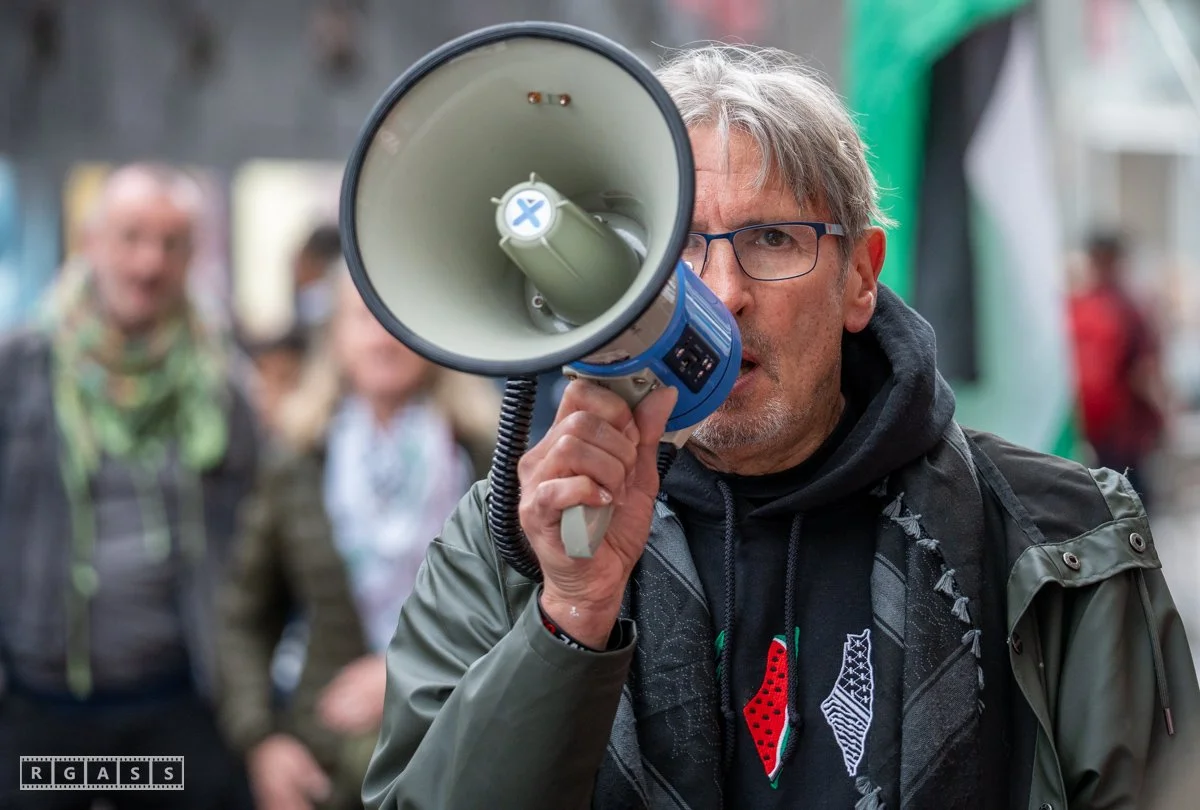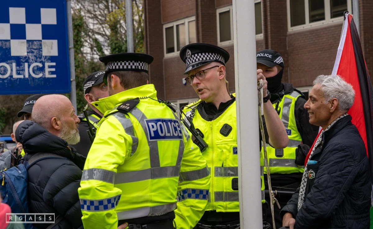 Glasgow UK. 22 March 2025. Pro-Palestine protesters outside Barclays Bank and then outside London Road Police Station, with an incidental scooter club drive past.