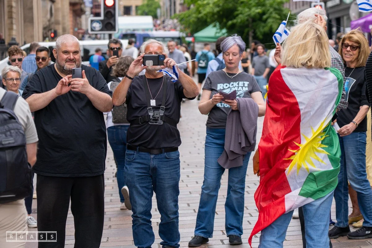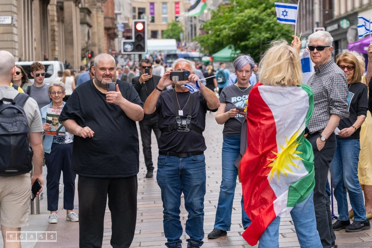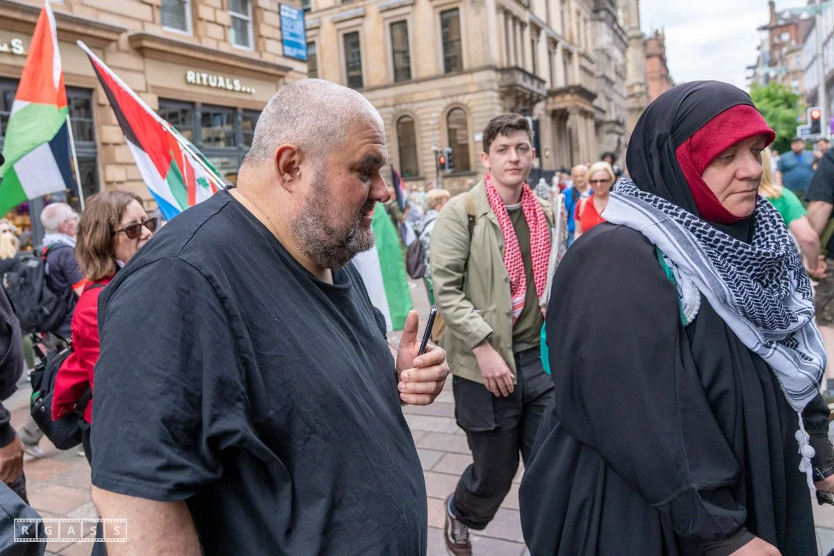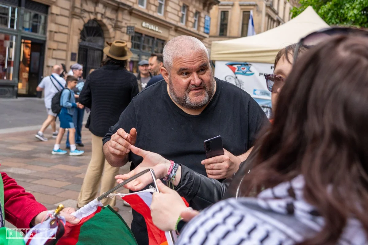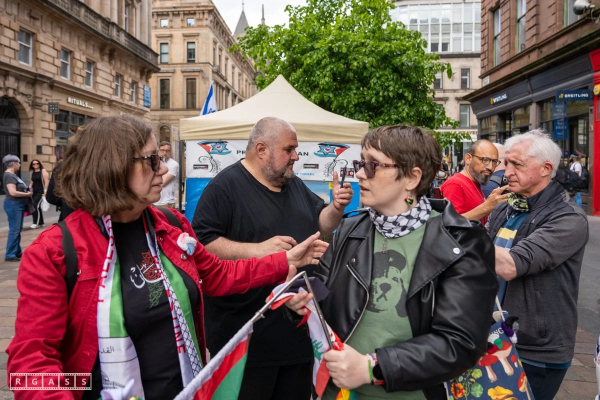 Glasgow UK. 10 May 2025. Palestinian protesters pass Glasgow Friends of Israel Stall where a woman in a wheel chair is injured and then followed by stall holders