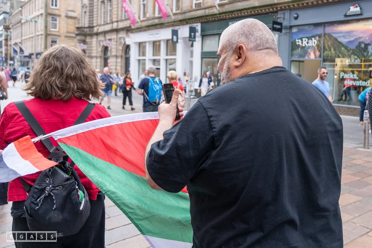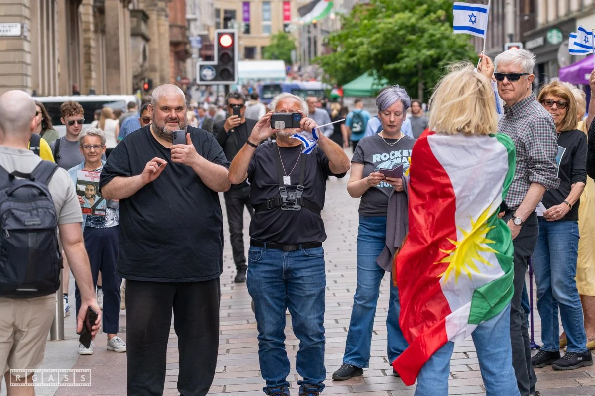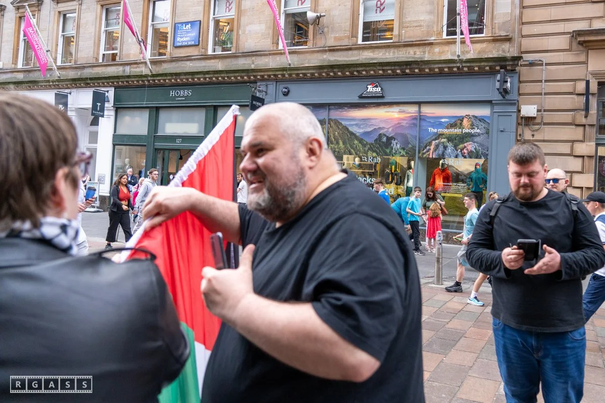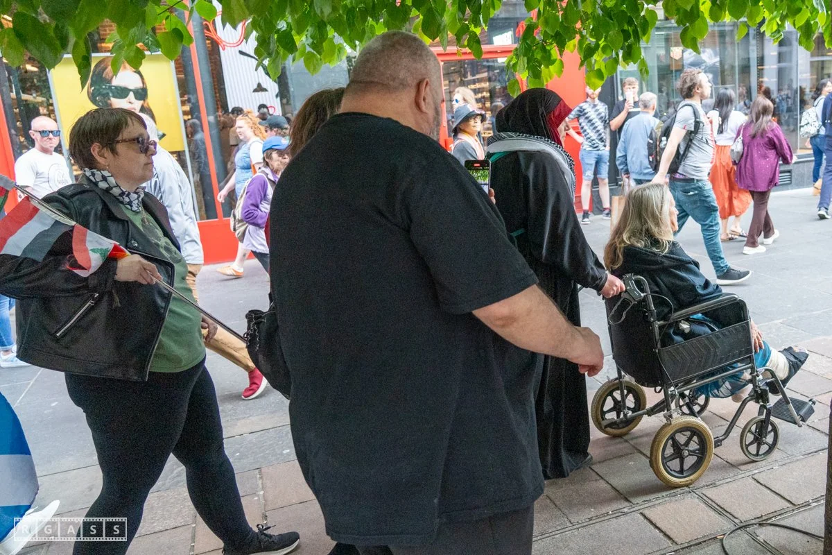Glasgow UK. 10 May 2025. Palestinian protesters pass Glasgow Friends of Israel Stall where a woman in a wheel chair is injured and then followed by stall holders