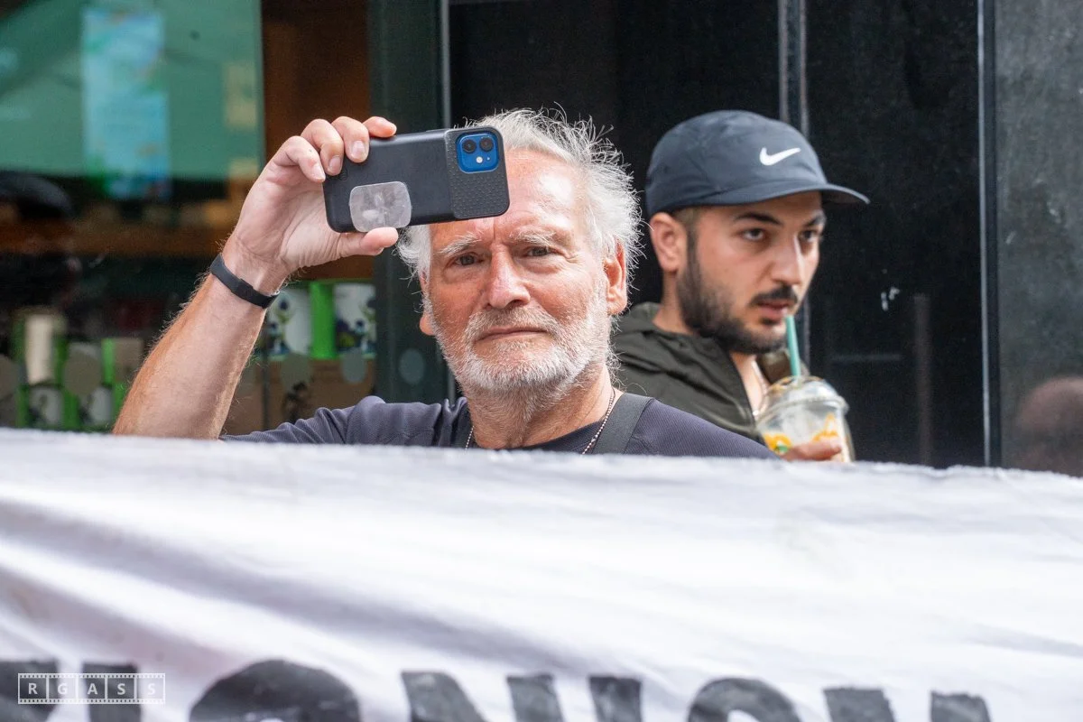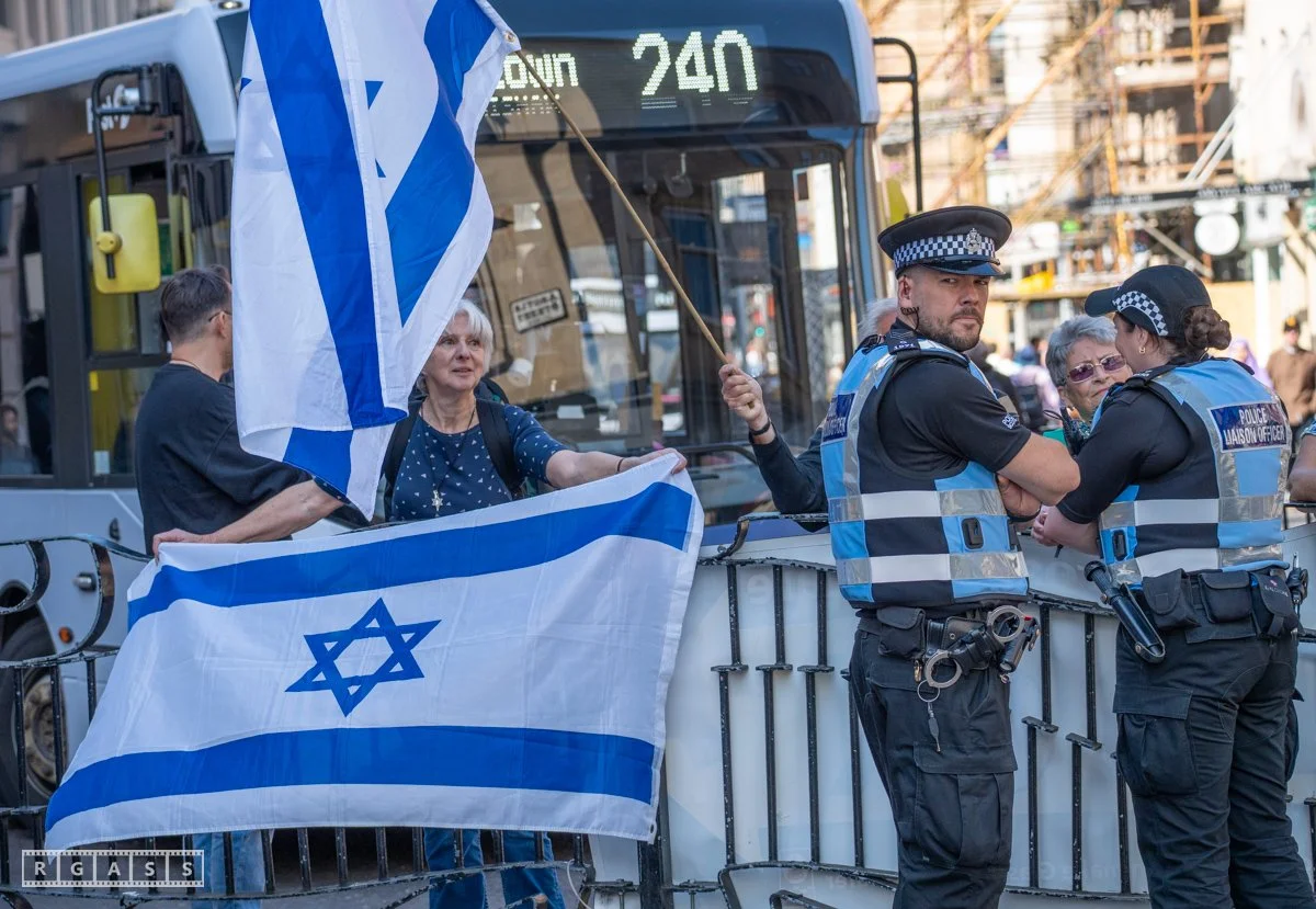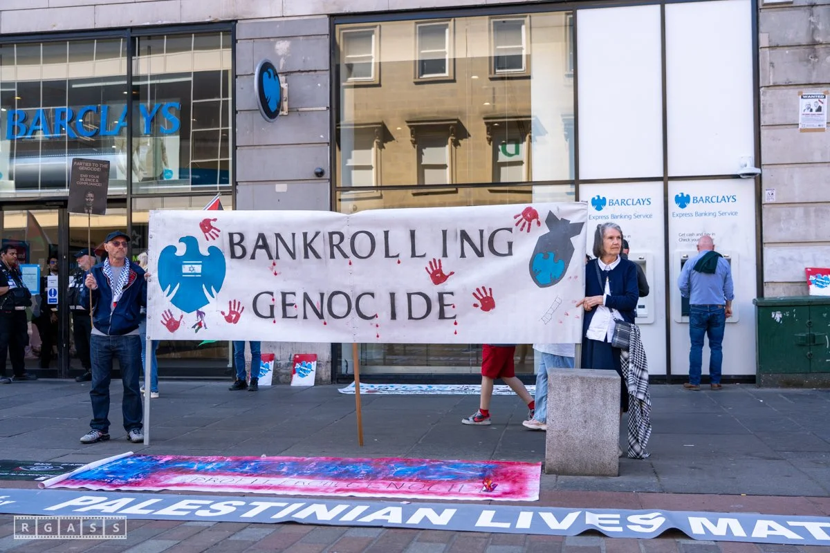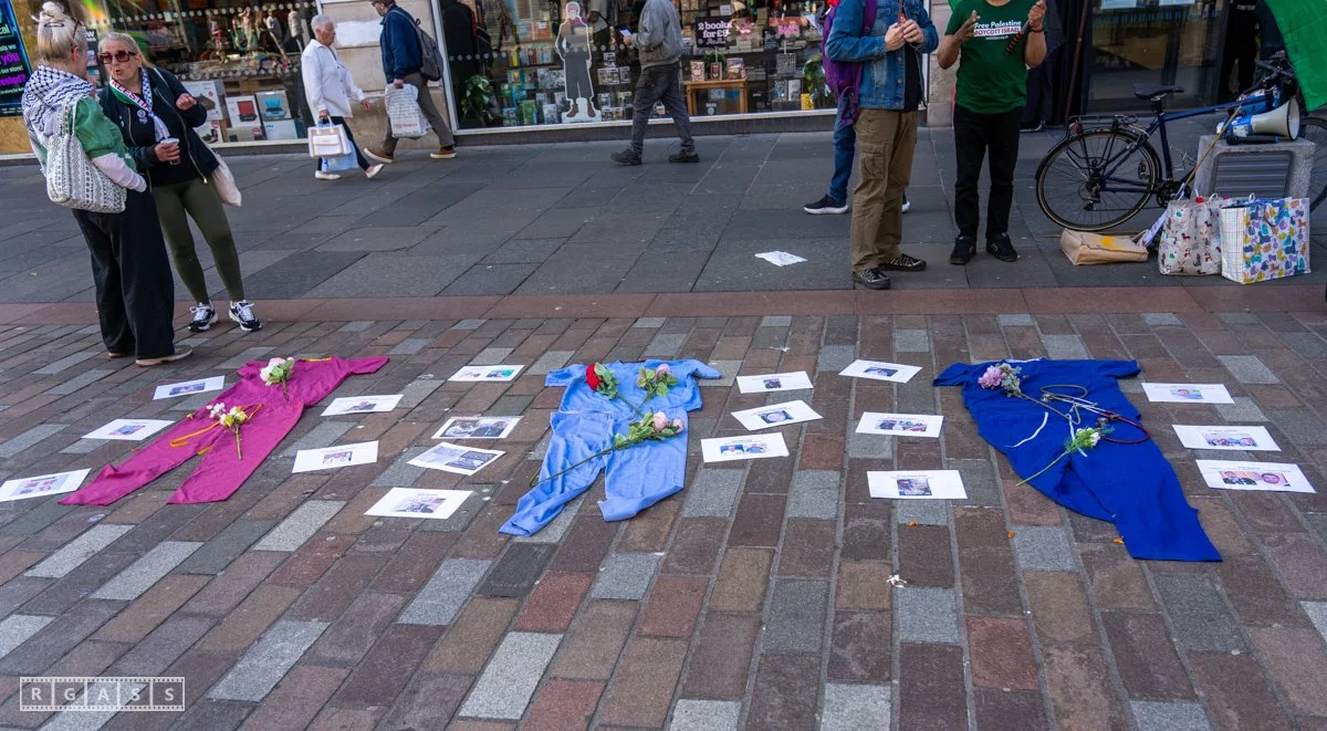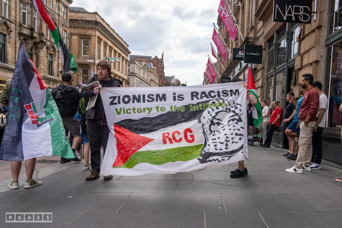 Glasgow UK. 10 May 2025. Palestinian protesters pass Glasgow Friends of Israel Stall where a woman in a wheel chair is injured and then followed by stall holders