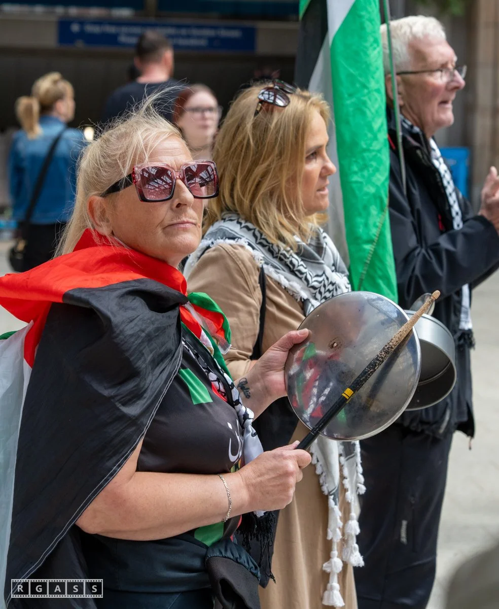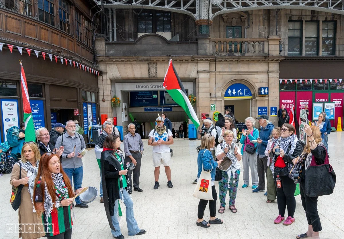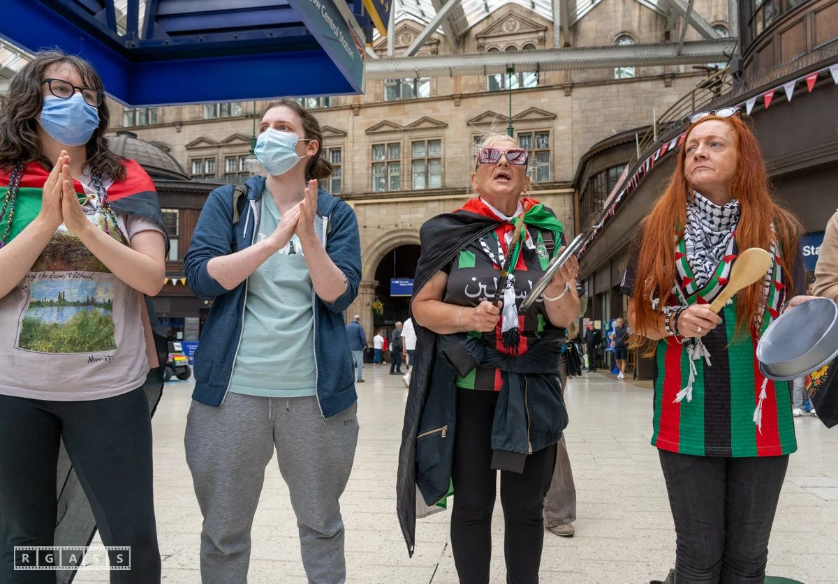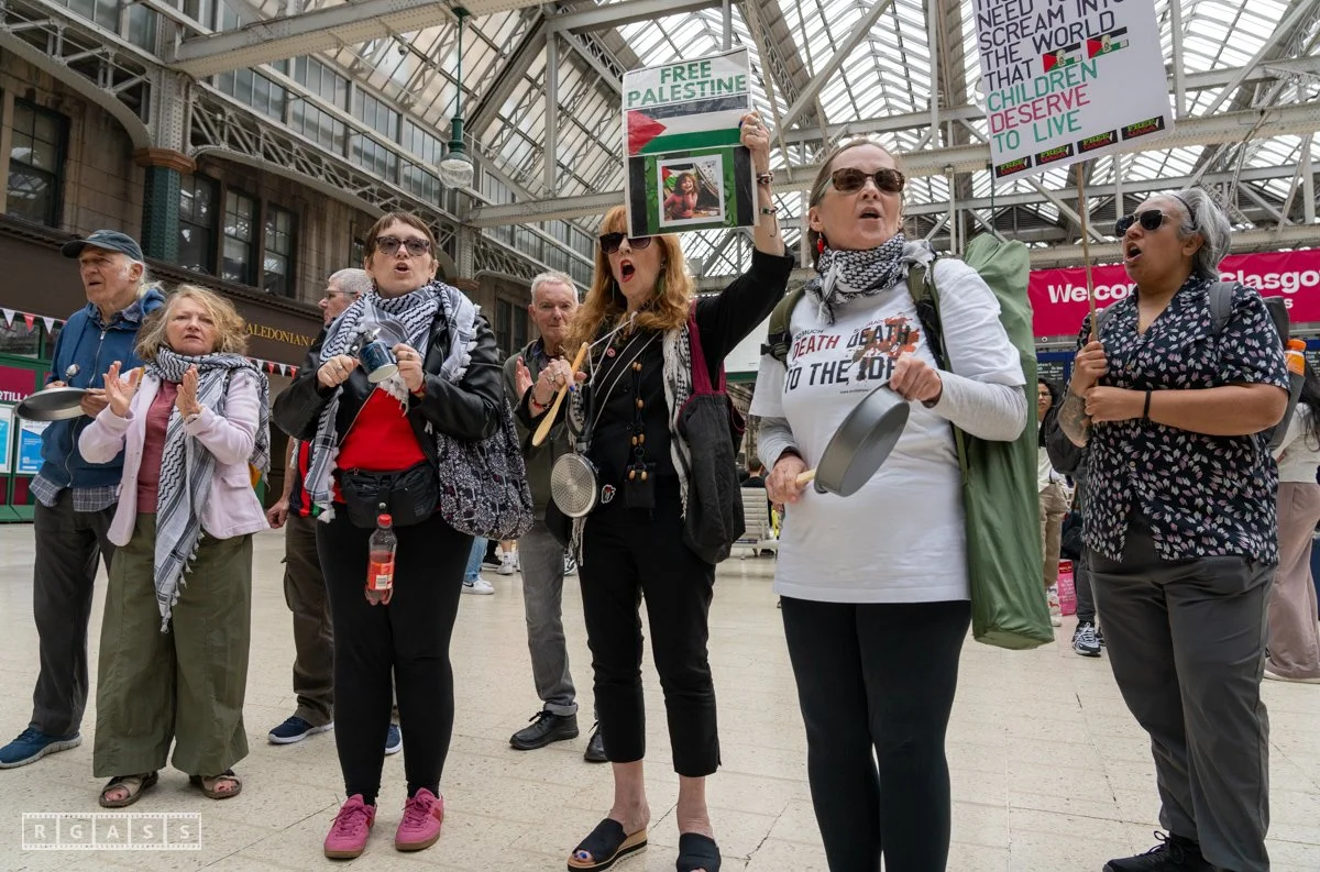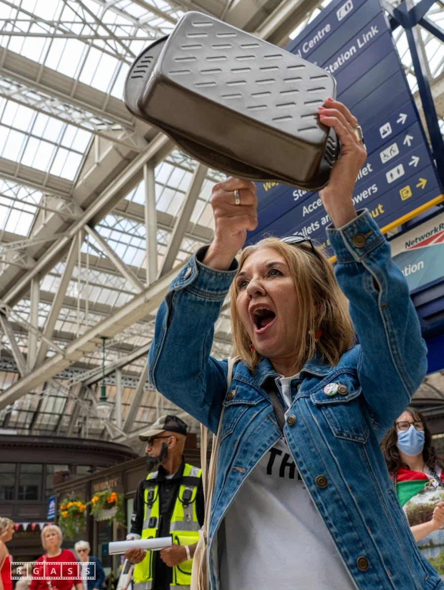 2nd August 2025, Glasgow UK: Palestine Protesters gather in Central Station banging ‘pots and pans’ to demand actions to halt the starvation of Palestinians in Gaza.