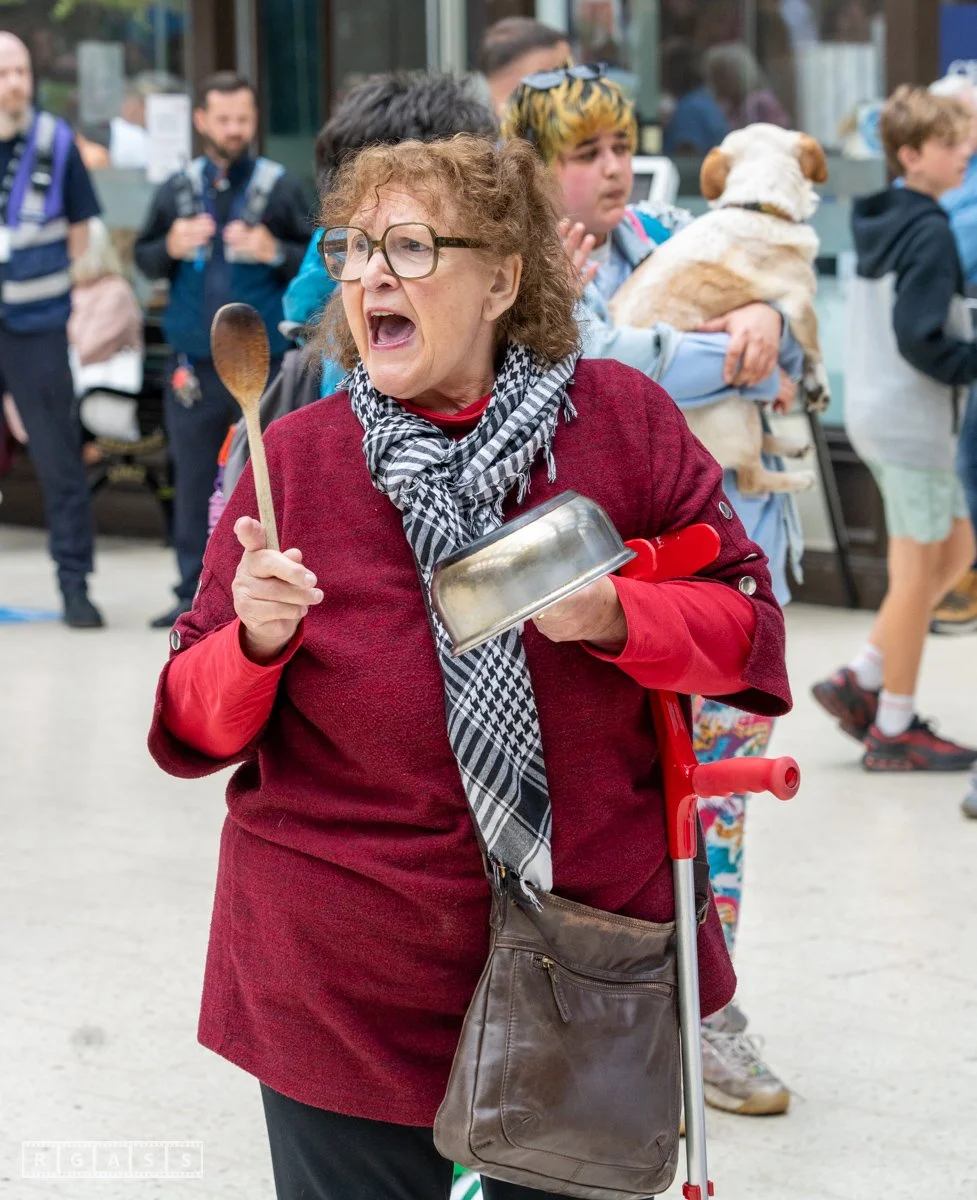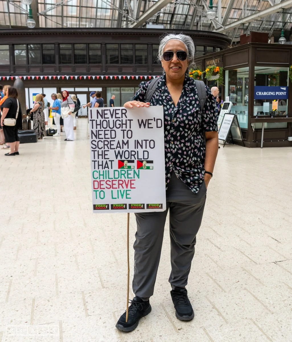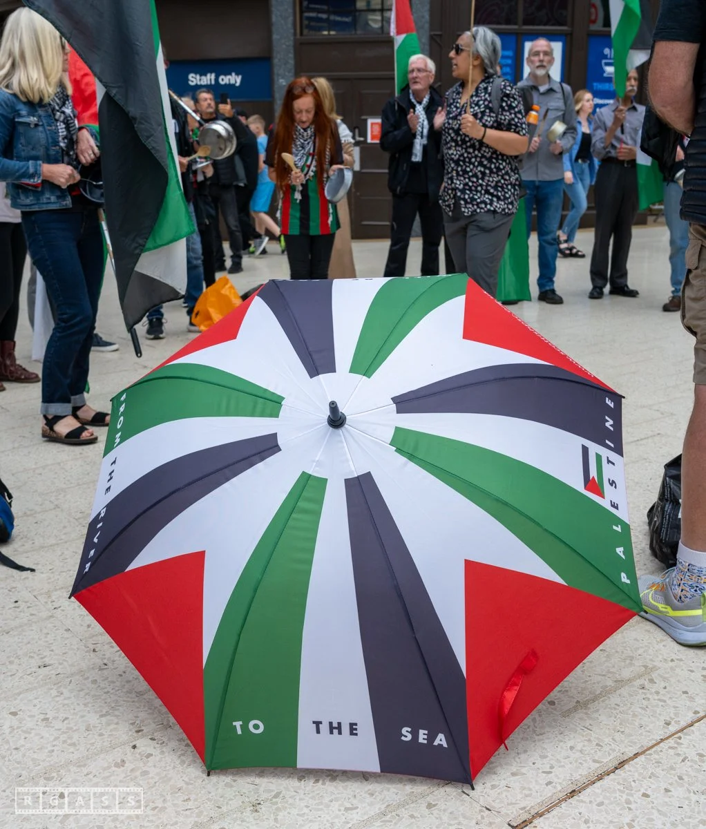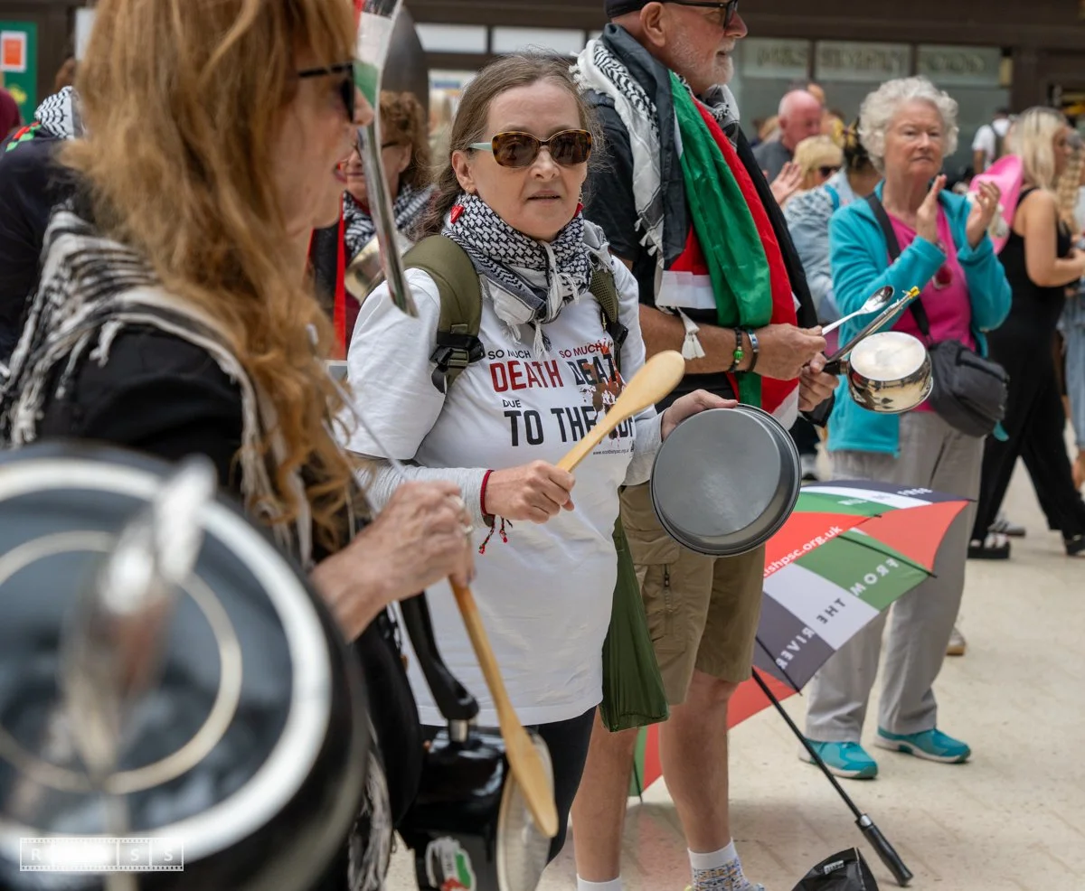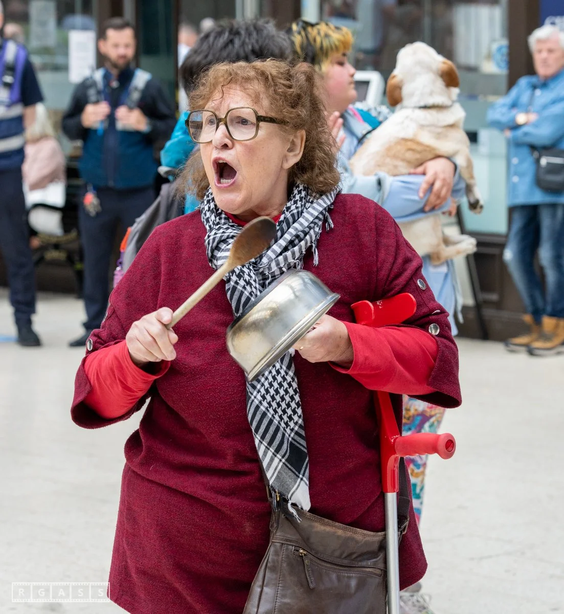 2nd August 2025, Glasgow UK: Palestine Protesters gather in Central Station banging ‘pots and pans’ to demand actions to halt the starvation of Palestinians in Gaza.