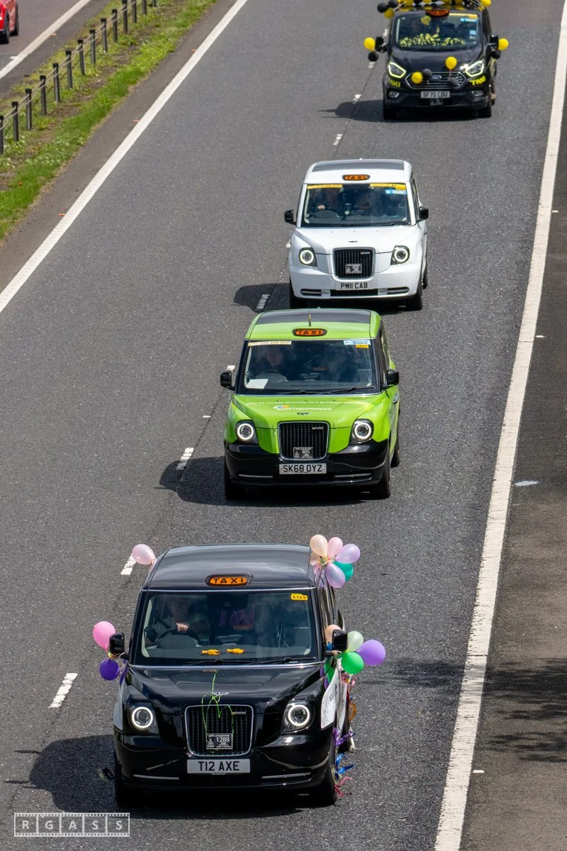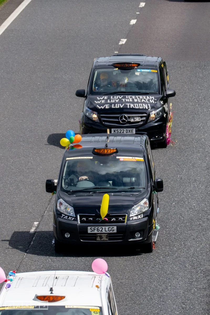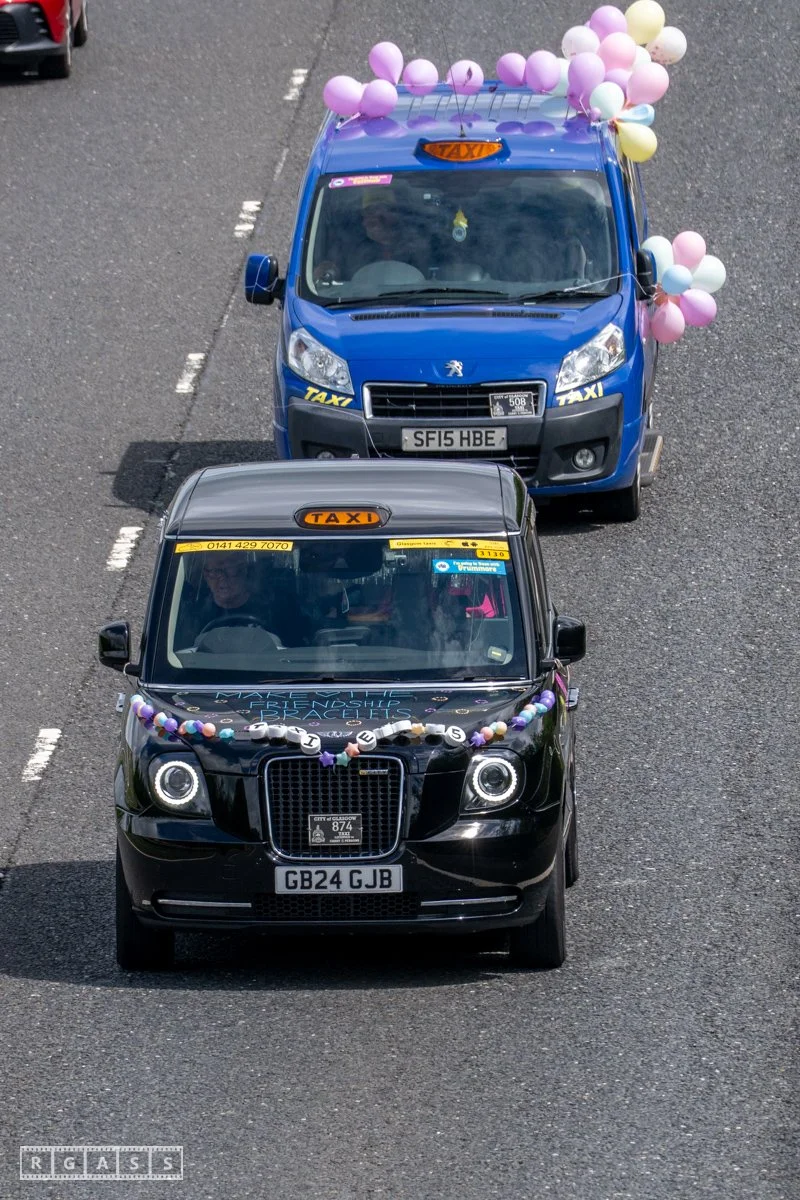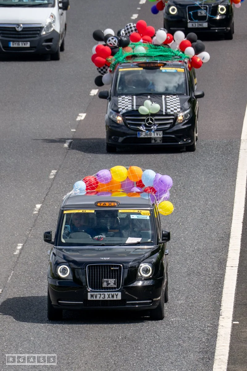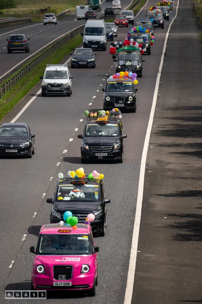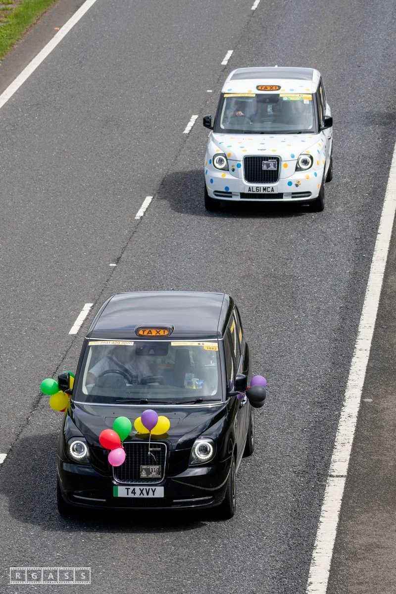 18 June 2025, Fenwick Scotland, UK. Approx 135 Glasgow taxis travelling to Troon in a convoy taking over 300 children with additional support needs for a day at the seaside.