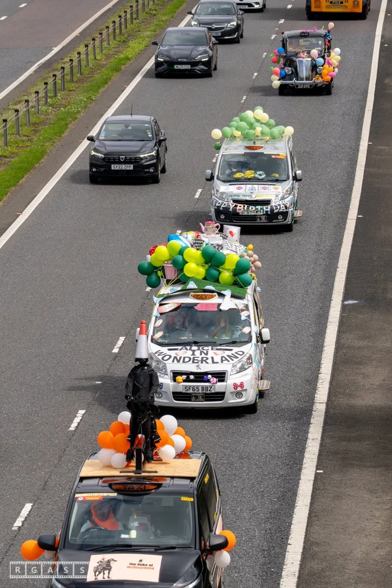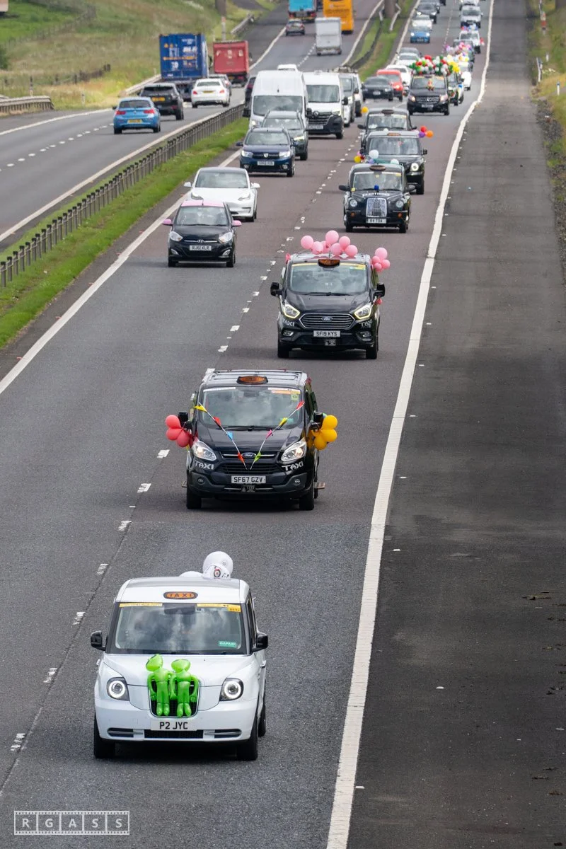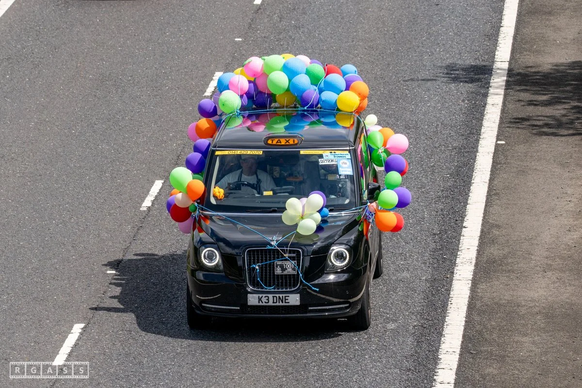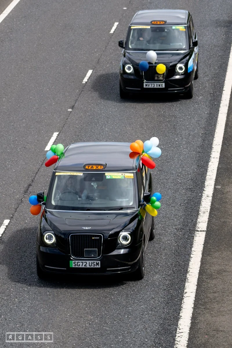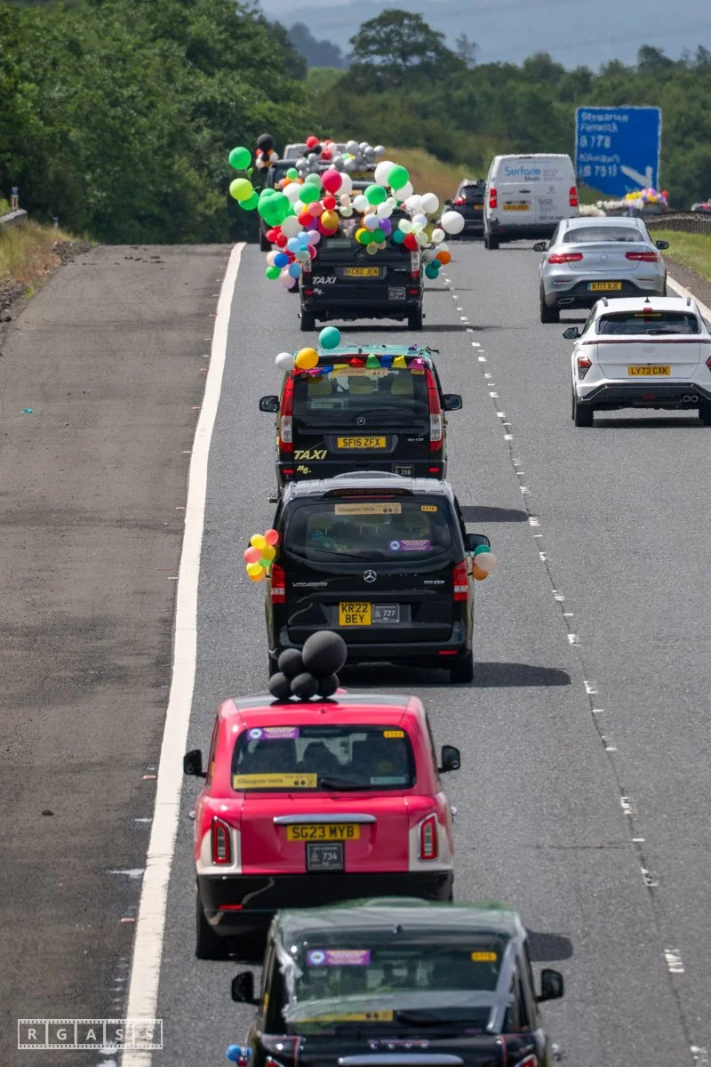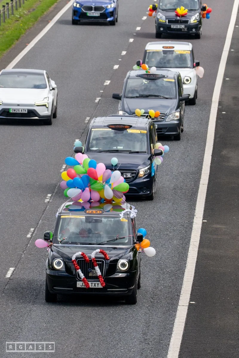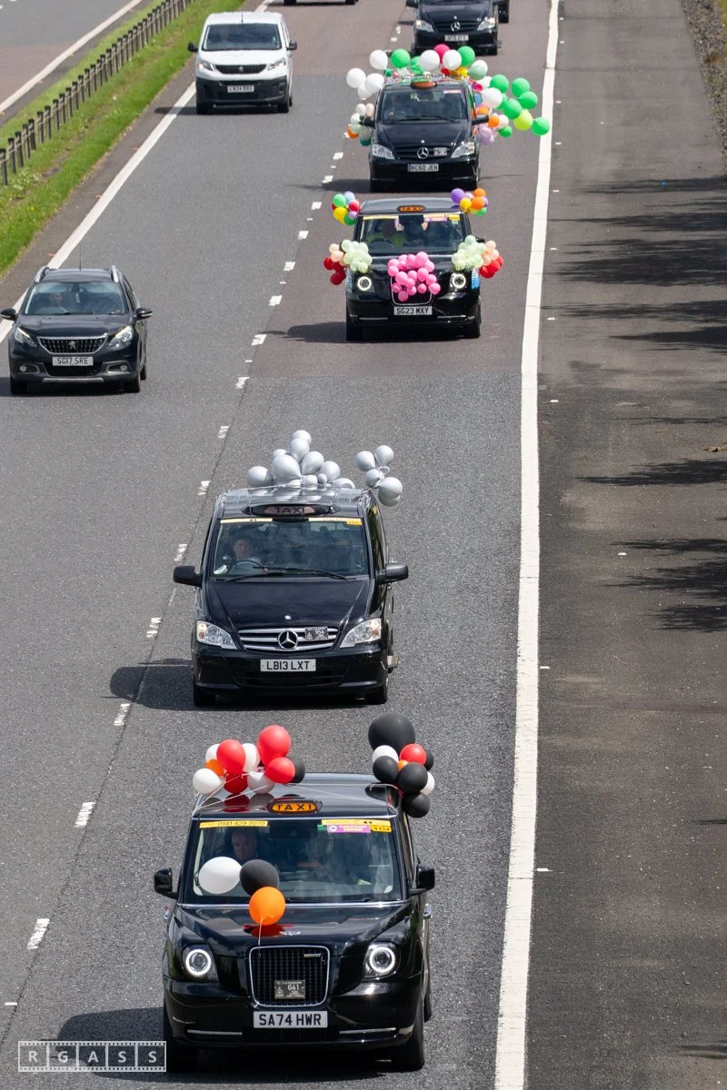 18 June 2025, Fenwick Scotland, UK. Approx 135 Glasgow taxis travelling to Troon in a convoy taking over 300 children with additional support needs for a day at the seaside.