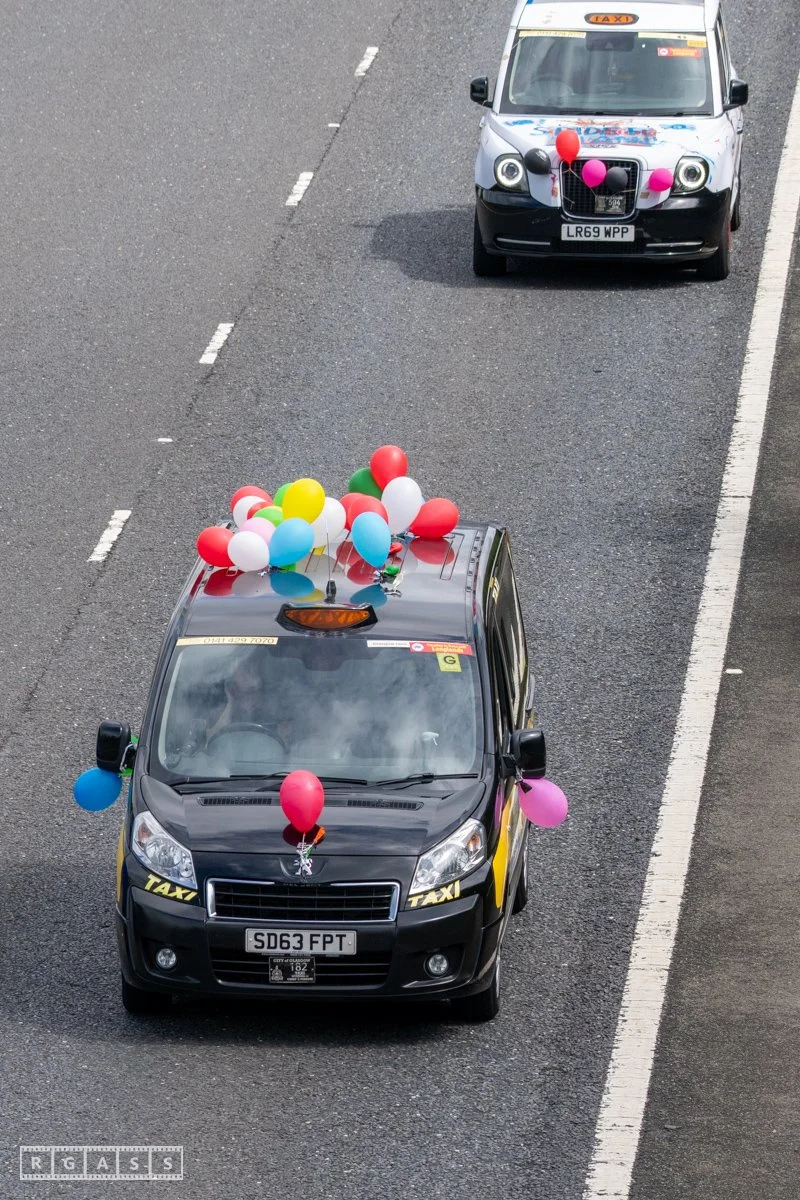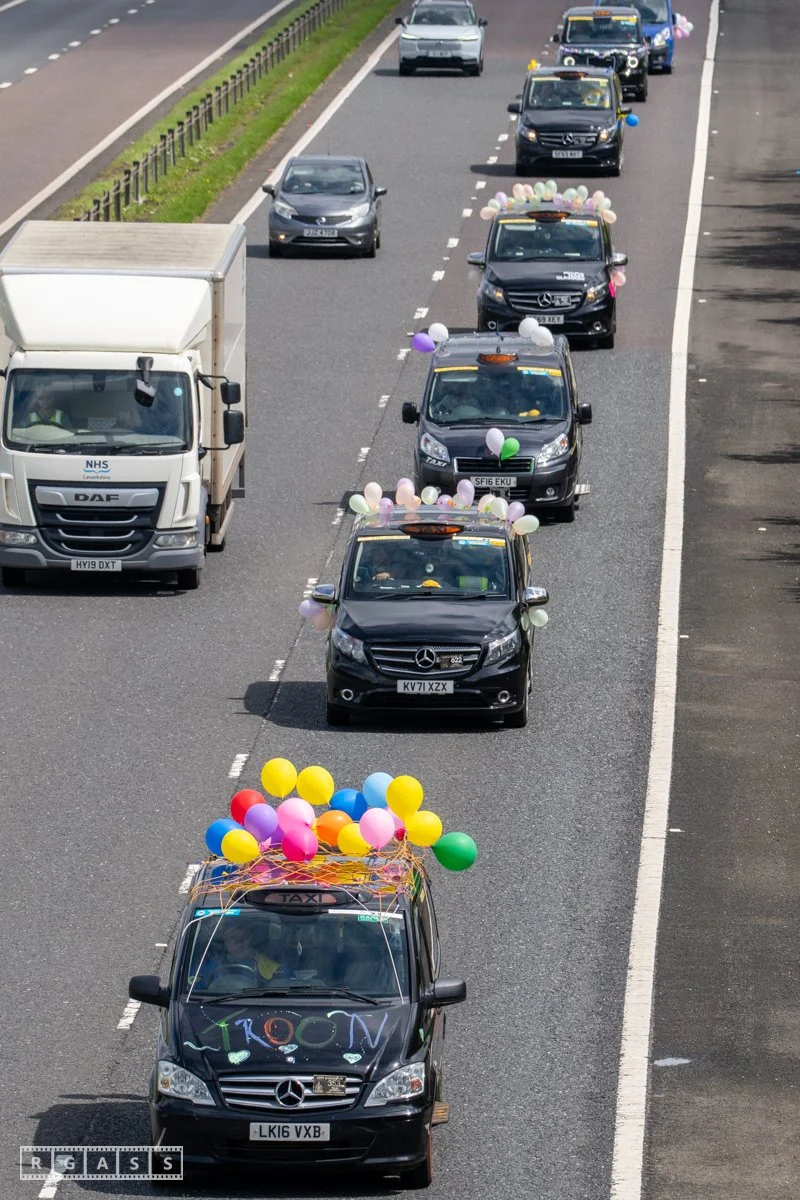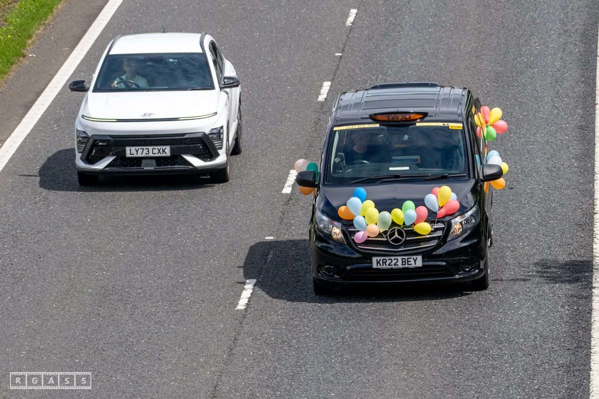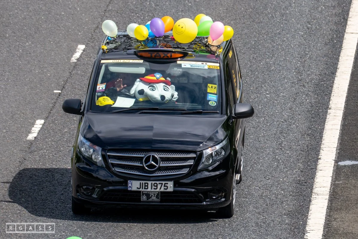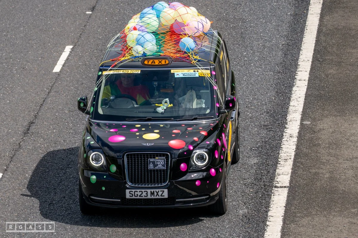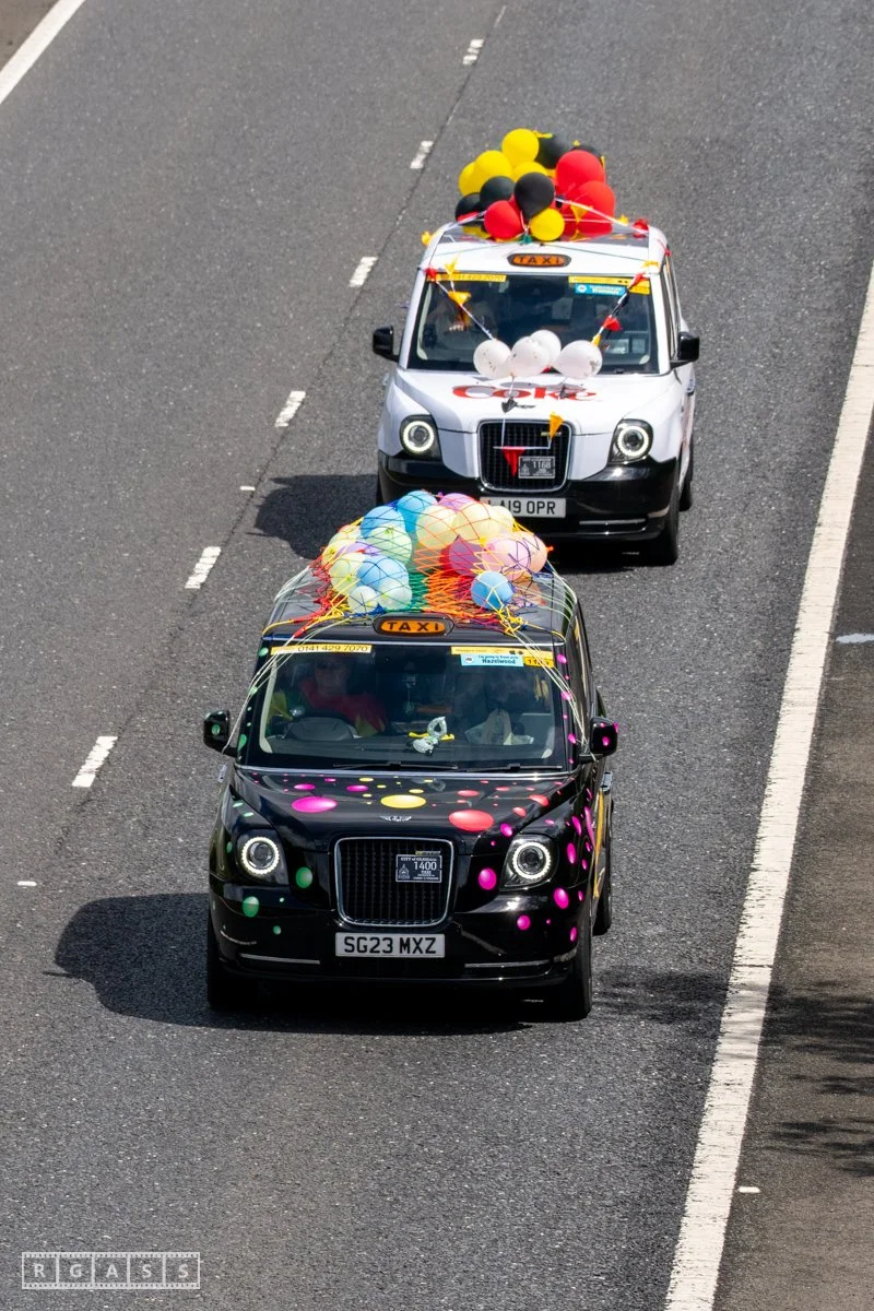 18 June 2025, Fenwick Scotland, UK. Approx 135 Glasgow taxis travelling to Troon in a convoy taking over 300 children with additional support needs for a day at the seaside.
