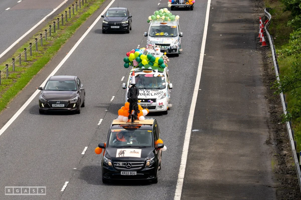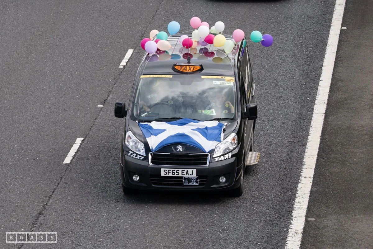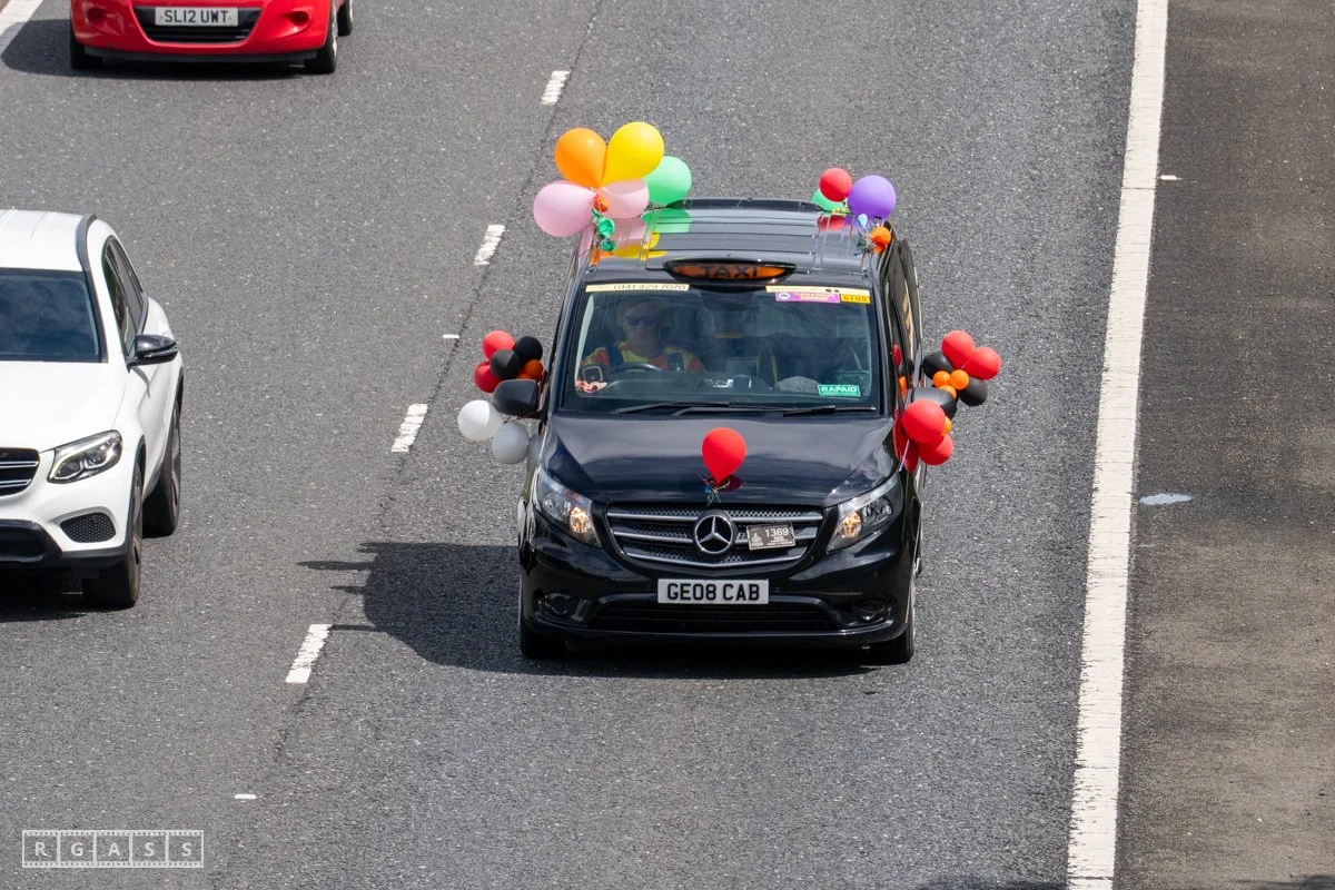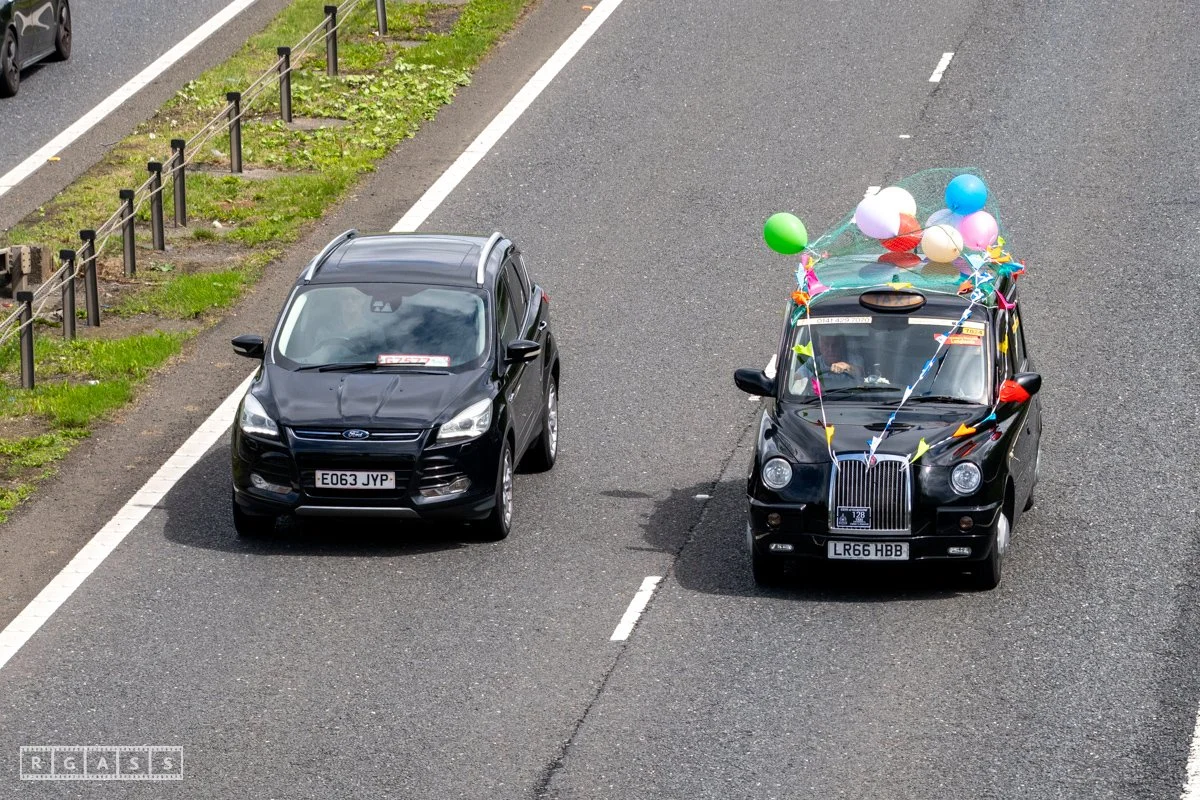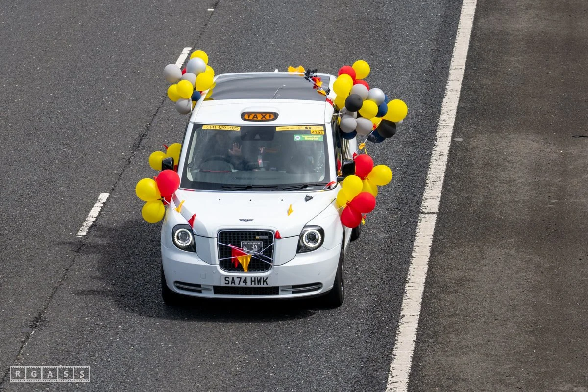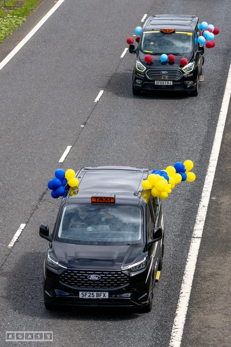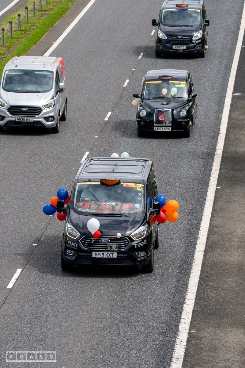 18 June 2025, Fenwick Scotland, UK. Approx 135 Glasgow taxis travelling to Troon in a convoy taking over 300 children with additional support needs for a day at the seaside.