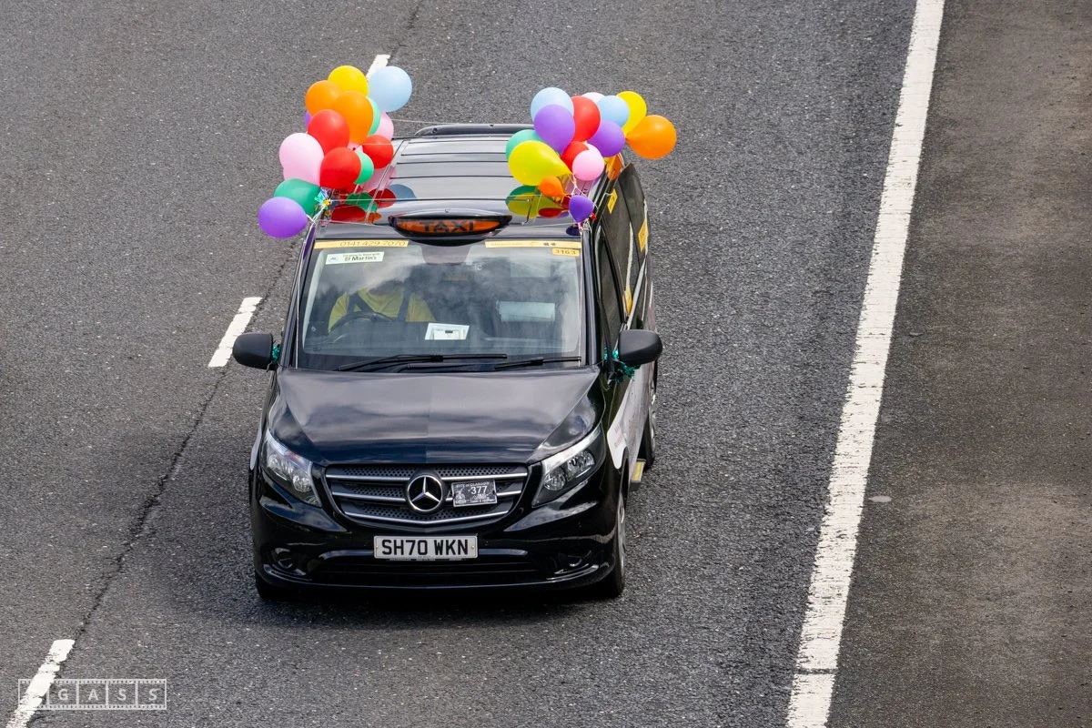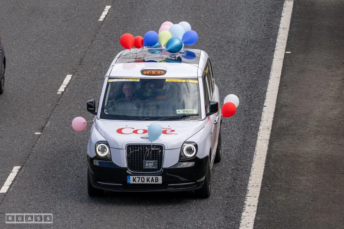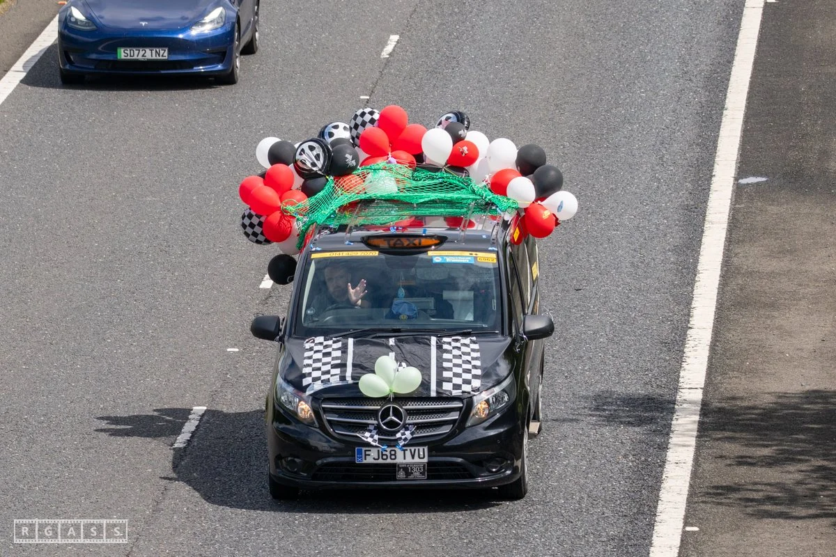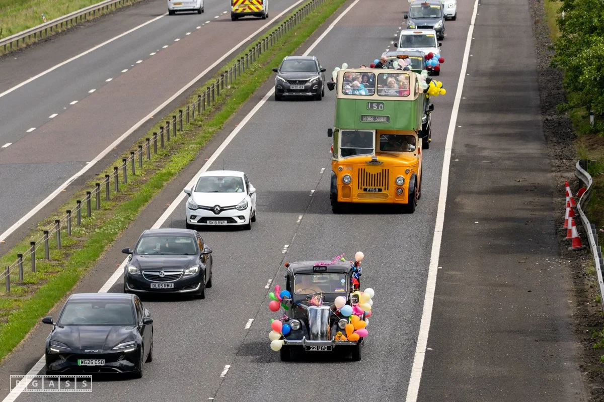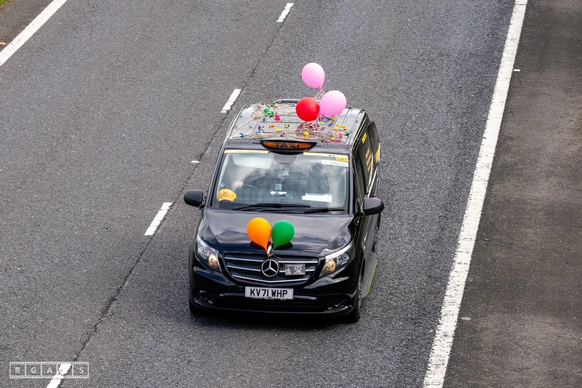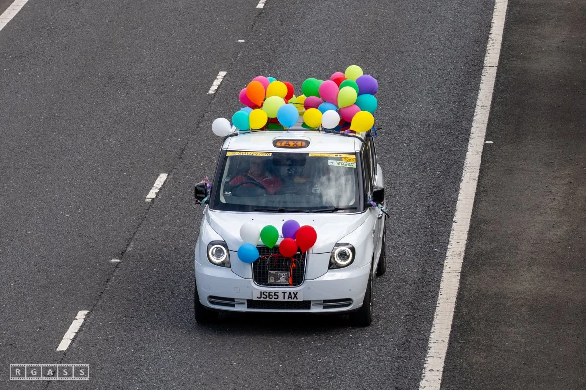 18 June 2025, Fenwick Scotland, UK. Approx 135 Glasgow taxis travelling to Troon in a convoy taking over 300 children with additional support needs for a day at the seaside.