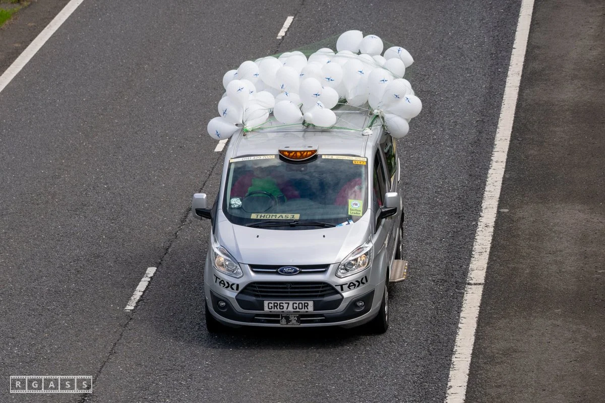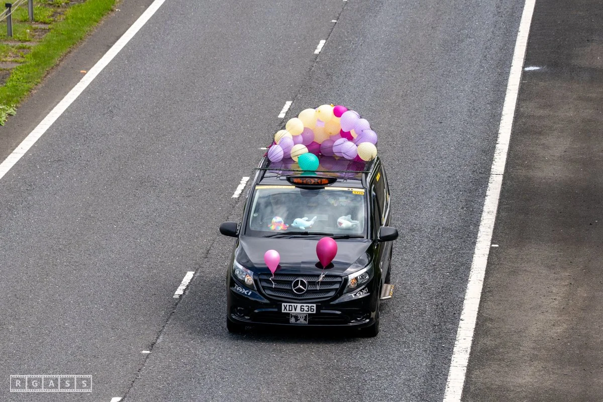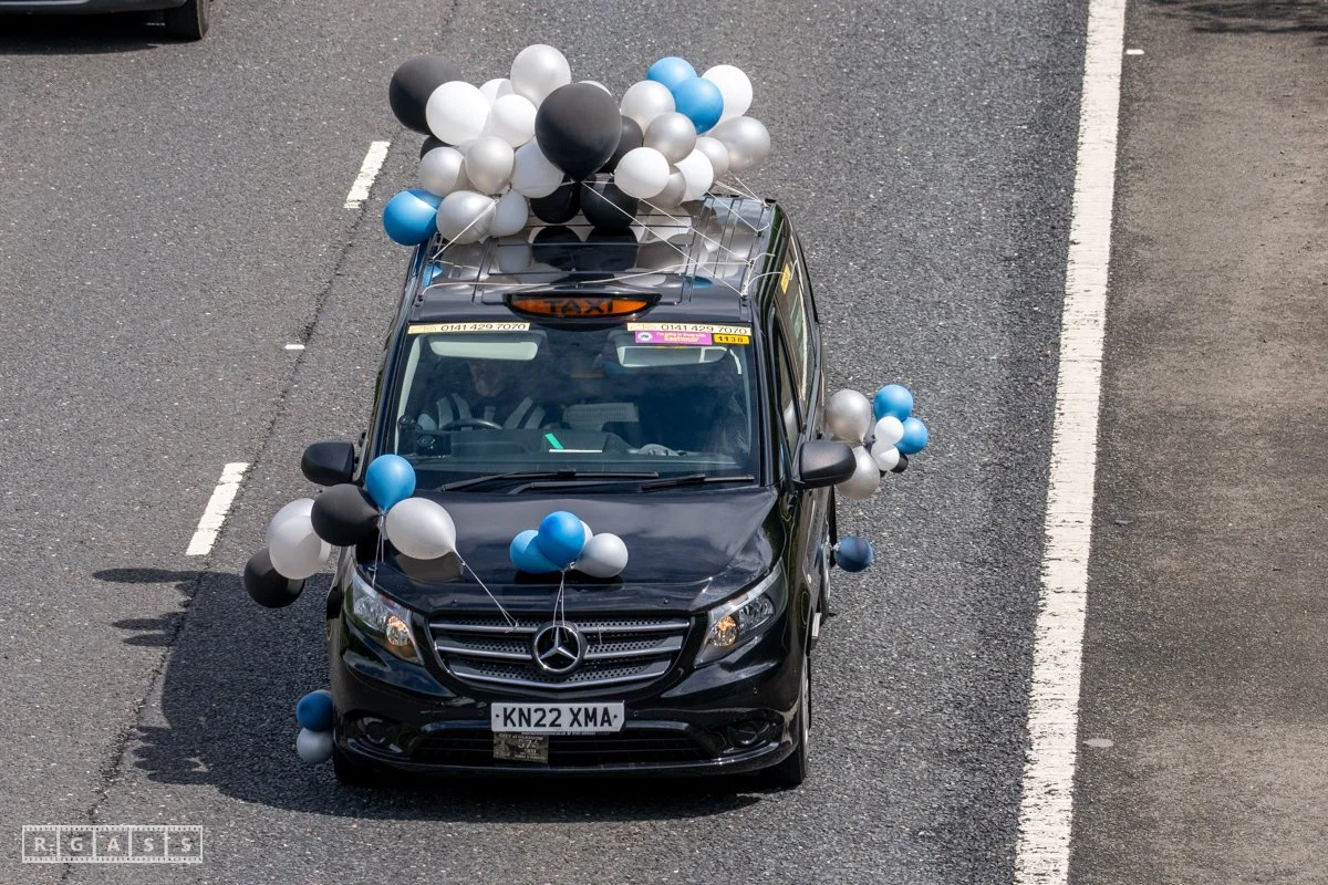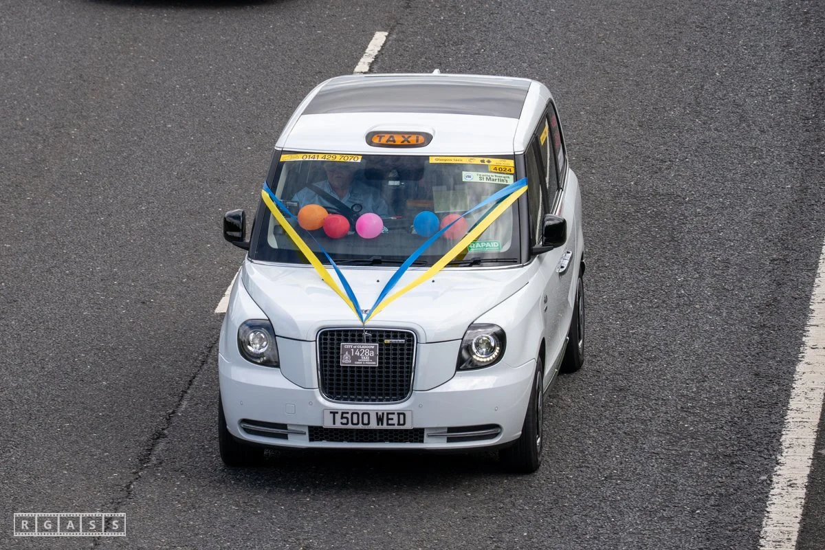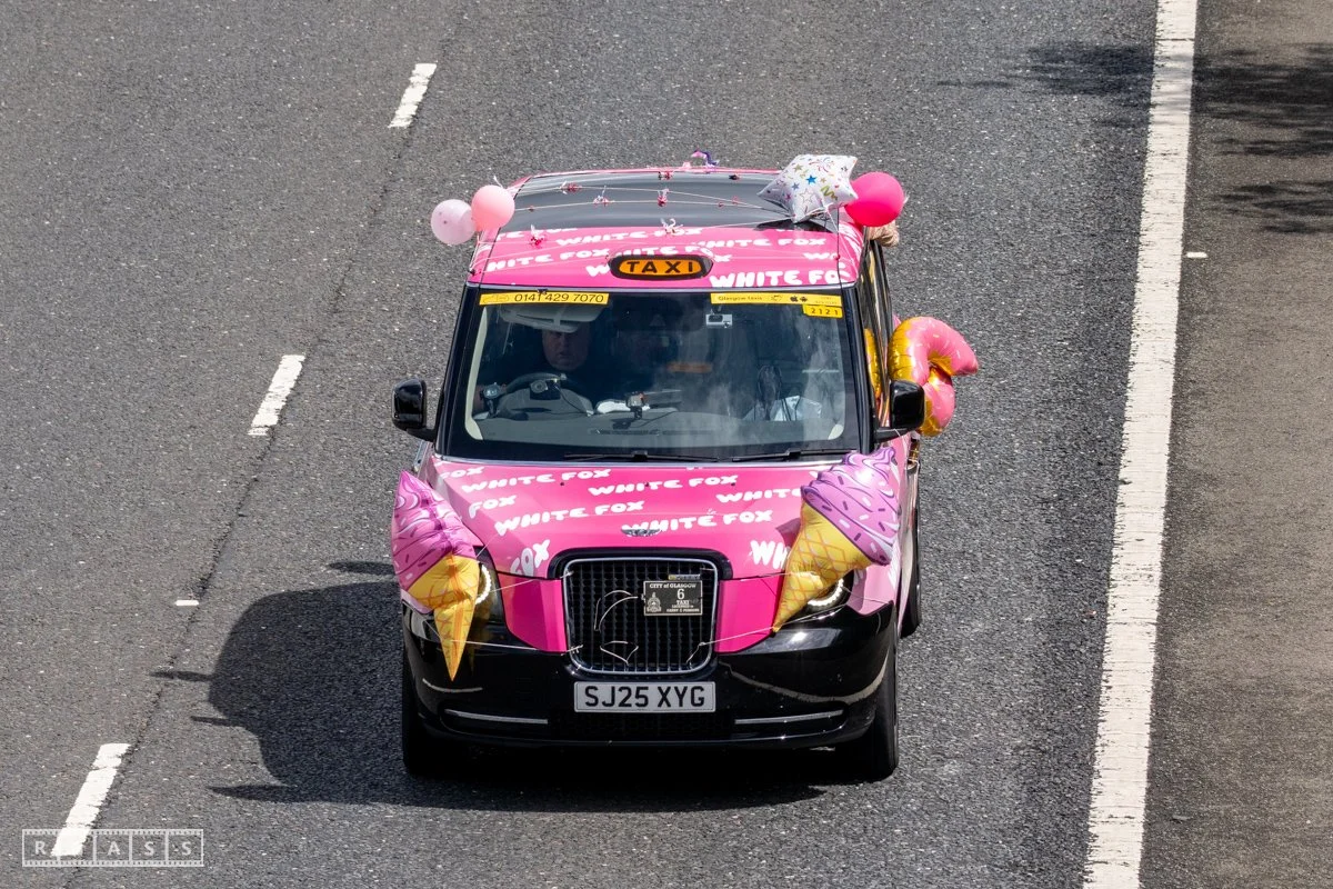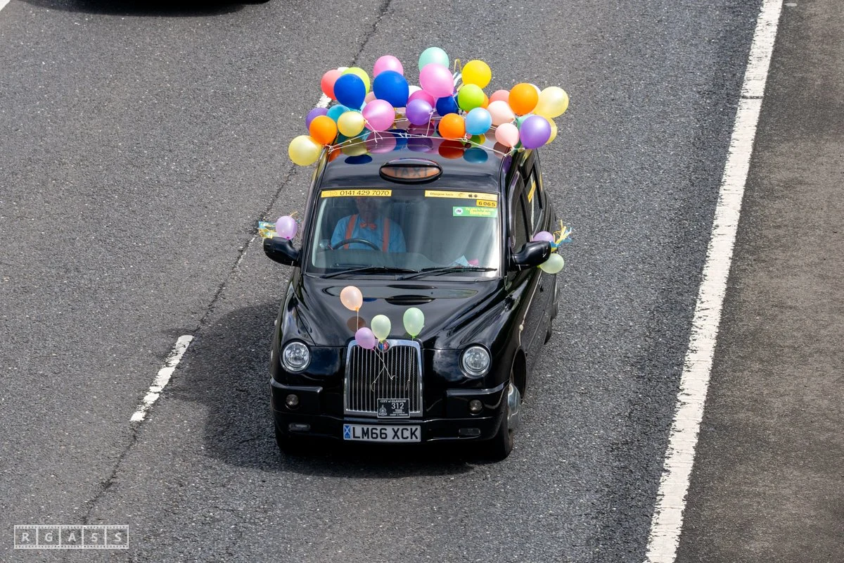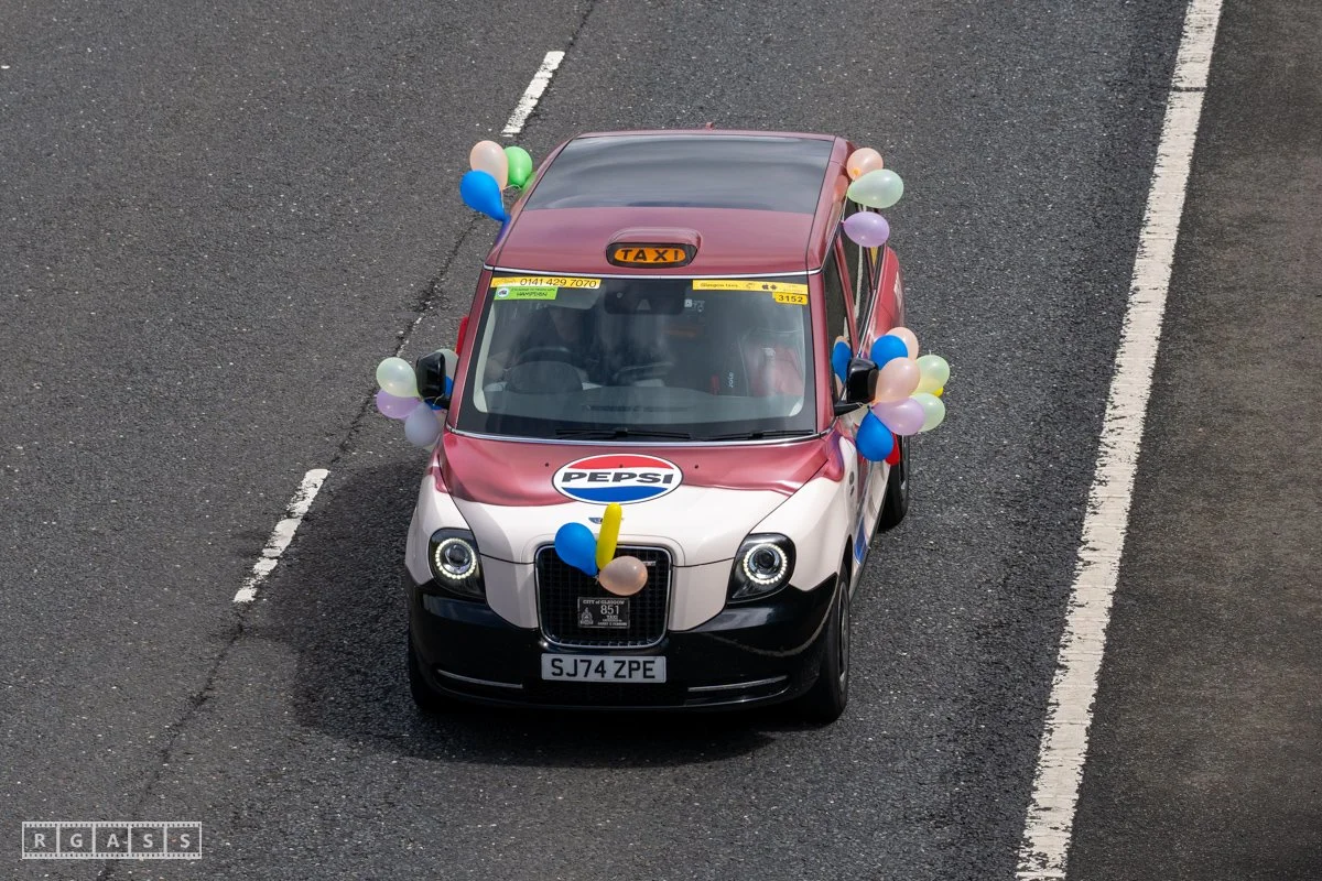 18 June 2025, Fenwick Scotland, UK. Approx 135 Glasgow taxis travelling to Troon in a convoy taking over 300 children with additional support needs for a day at the seaside.