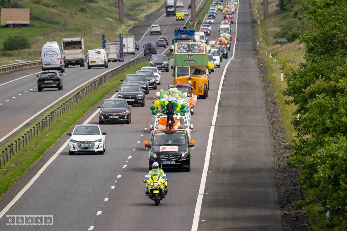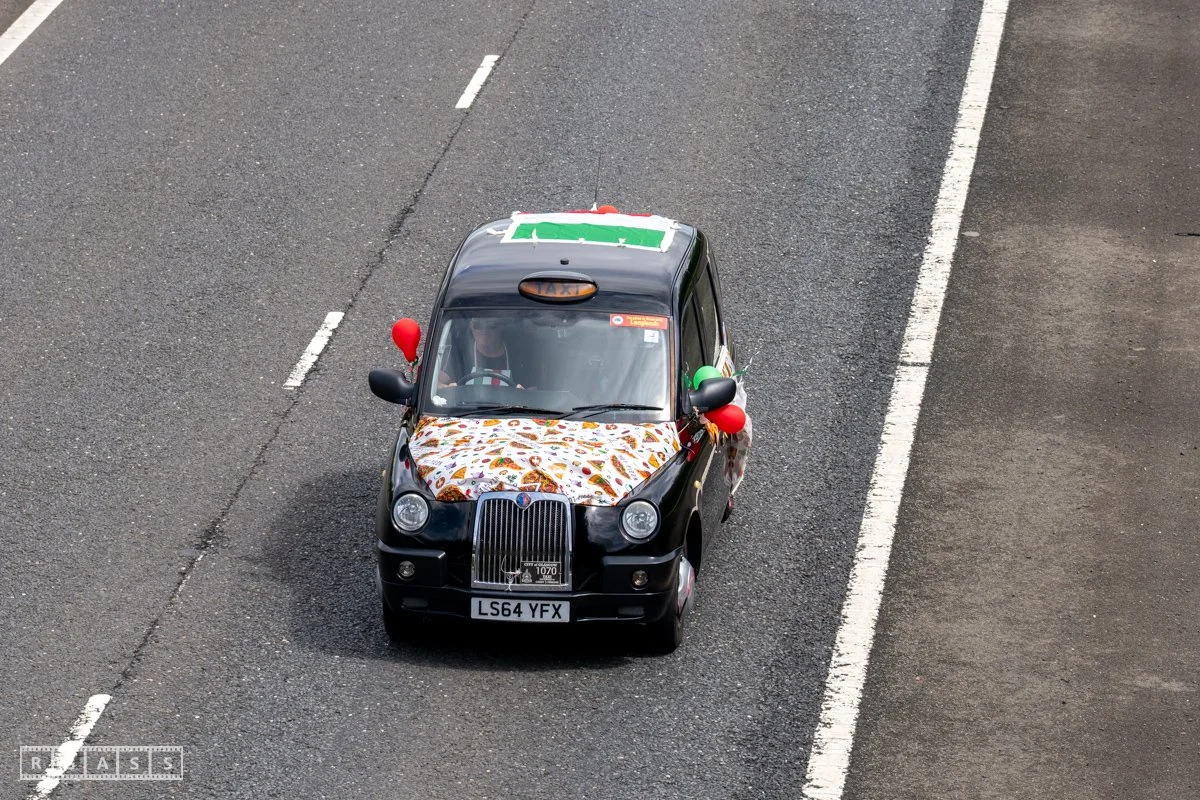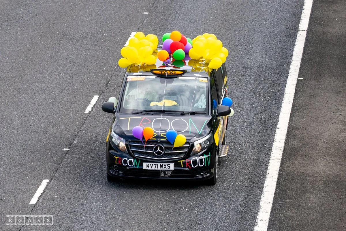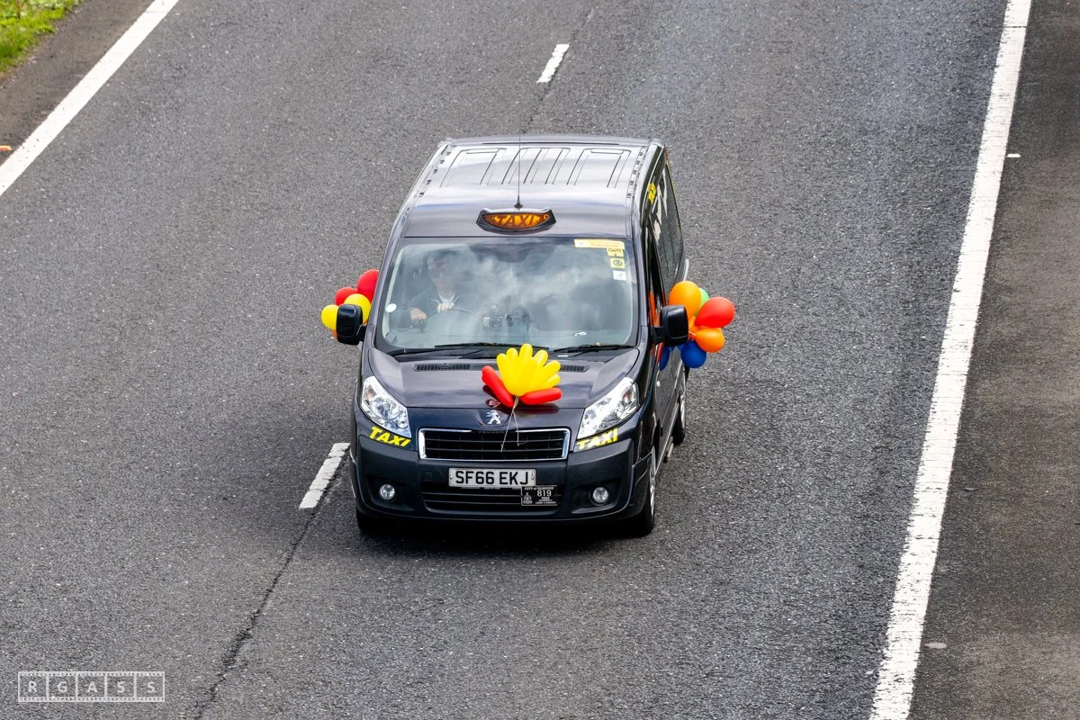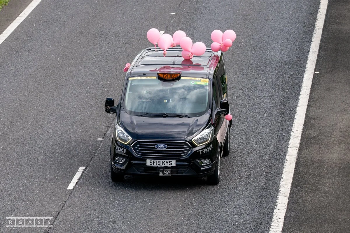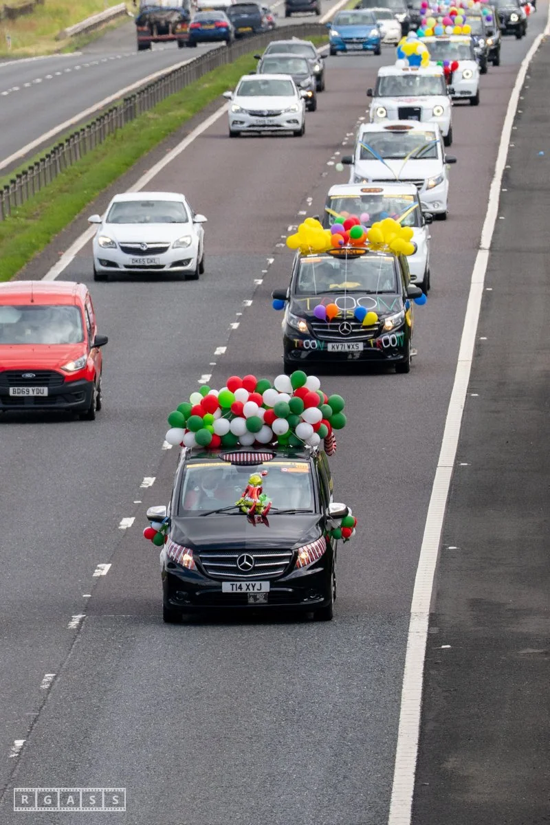 18 June 2025, Fenwick Scotland, UK. Approx 135 Glasgow taxis travelling to Troon in a convoy taking over 300 children with additional support needs for a day at the seaside.