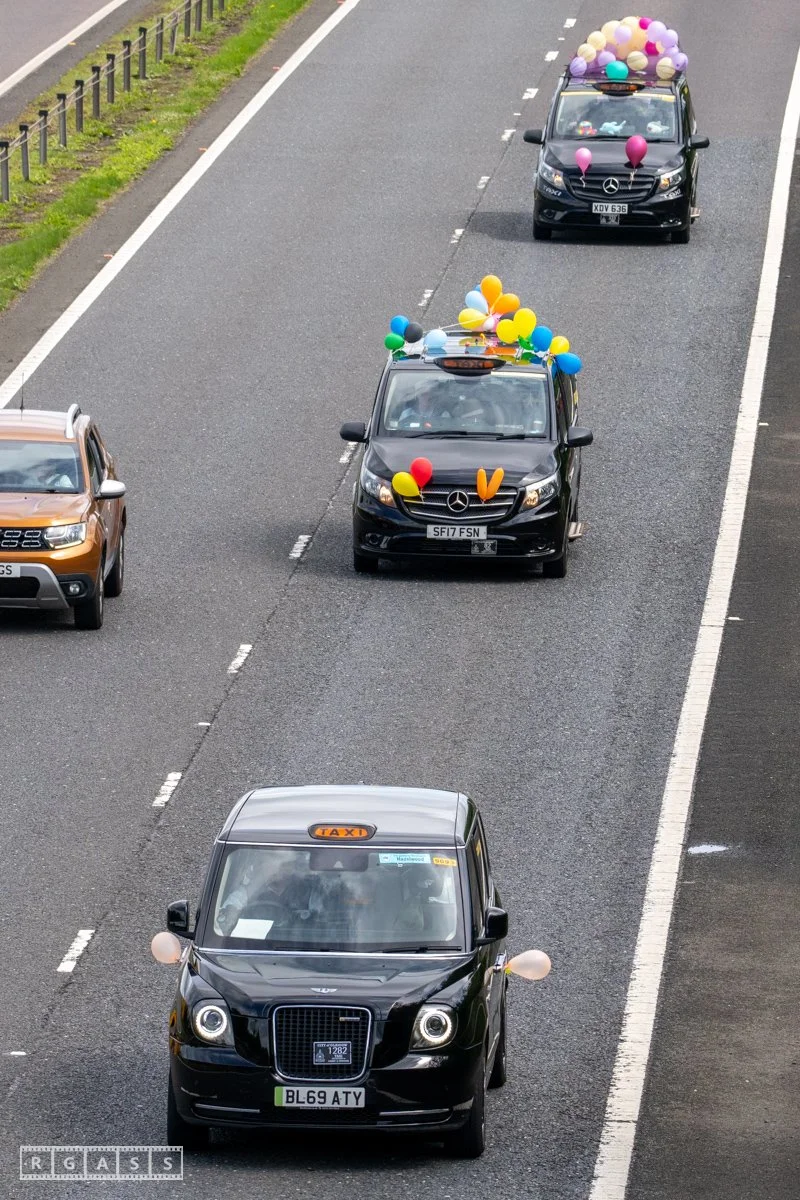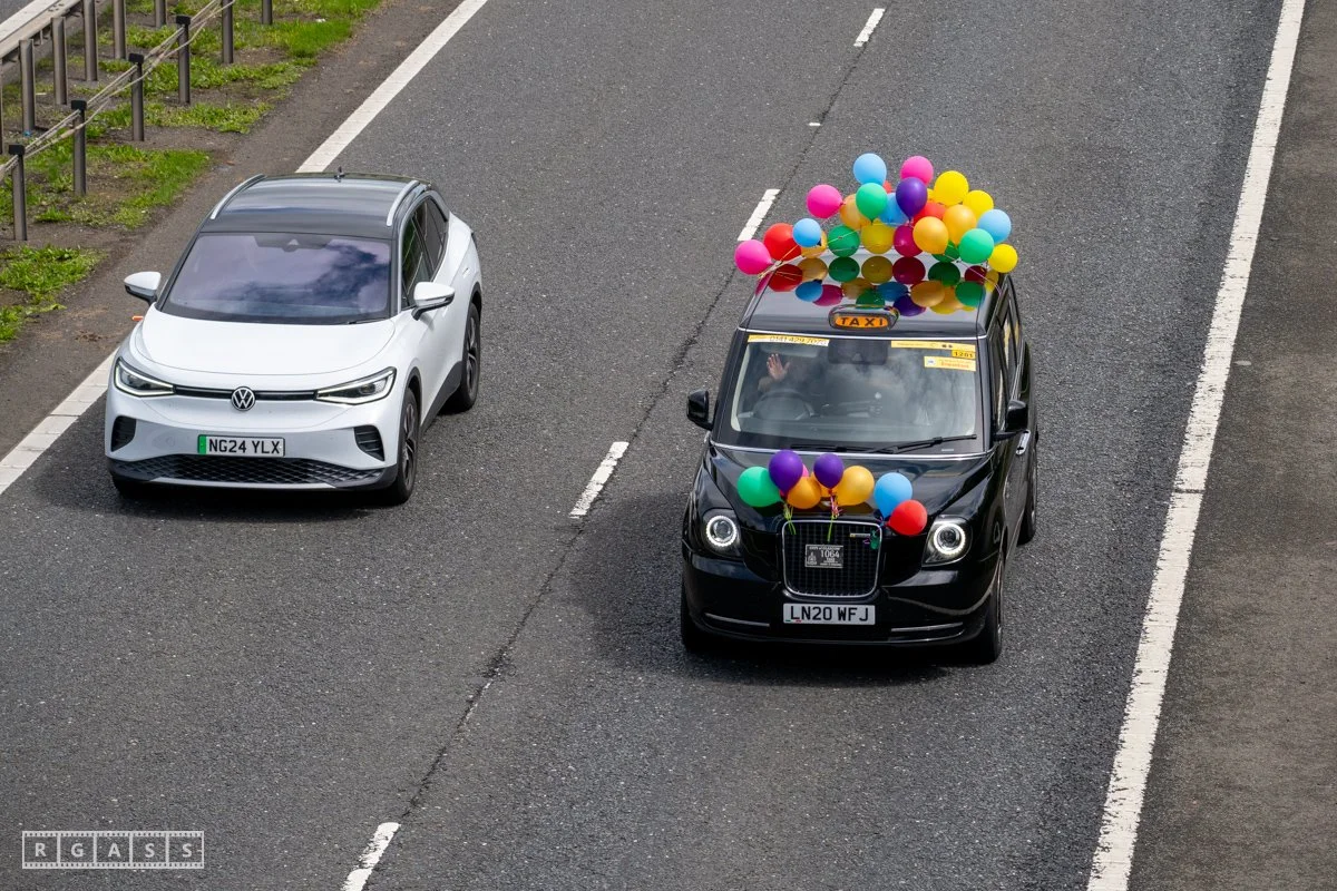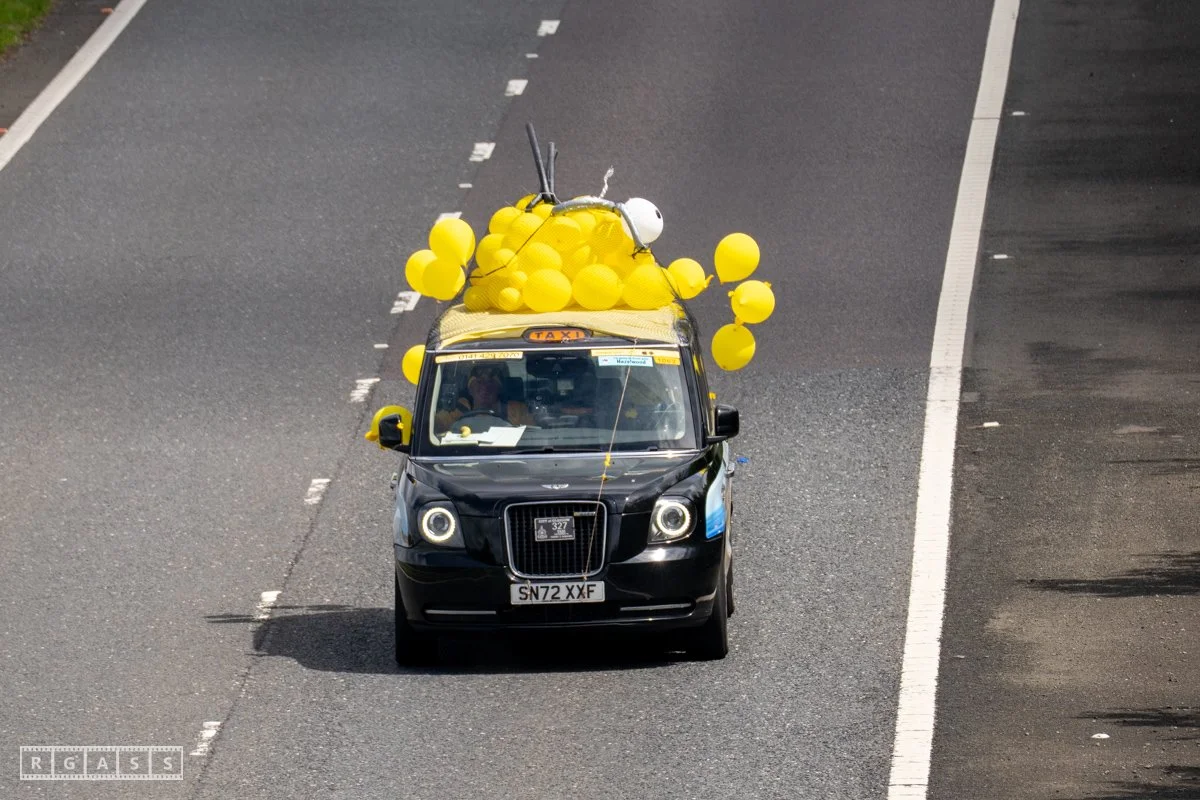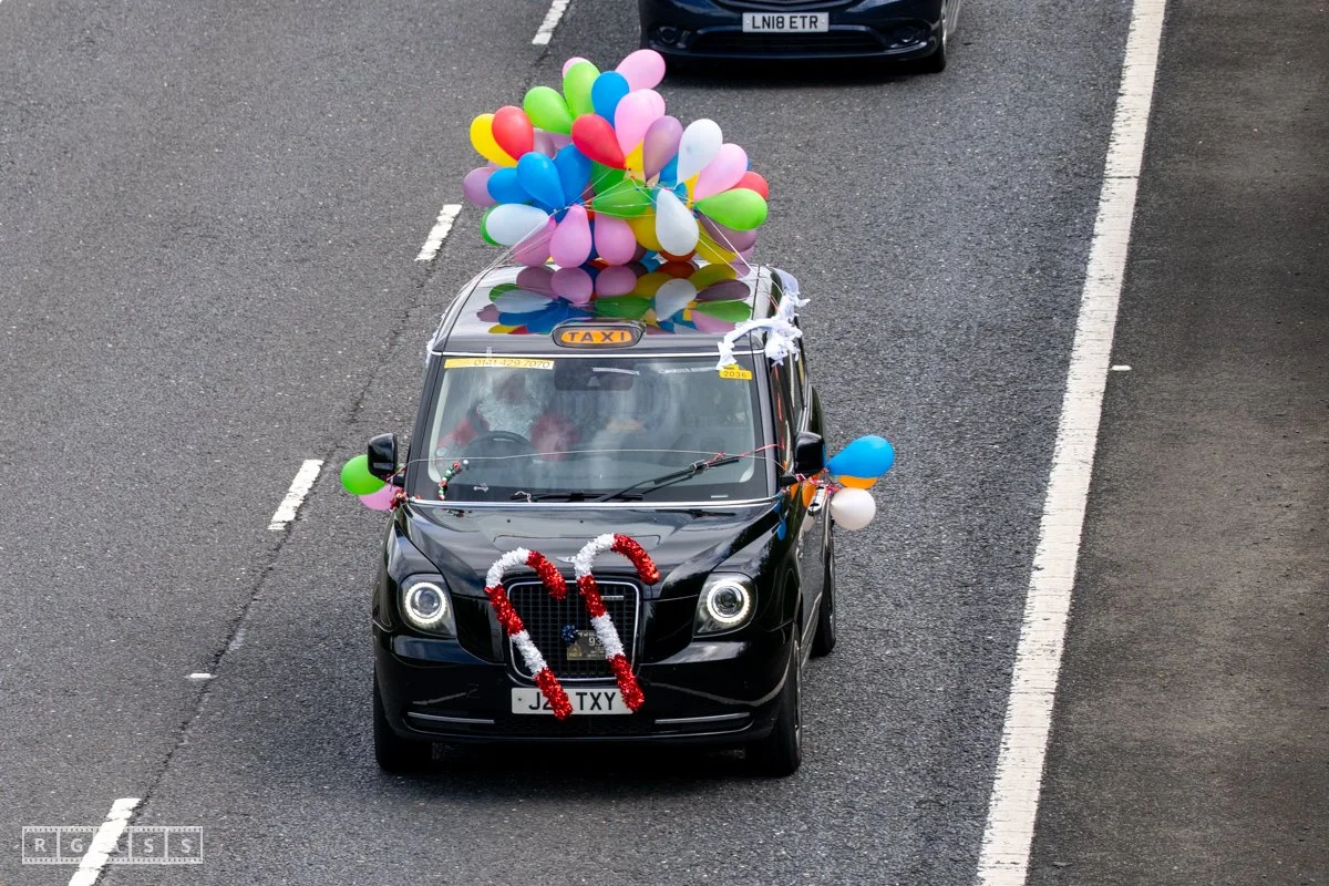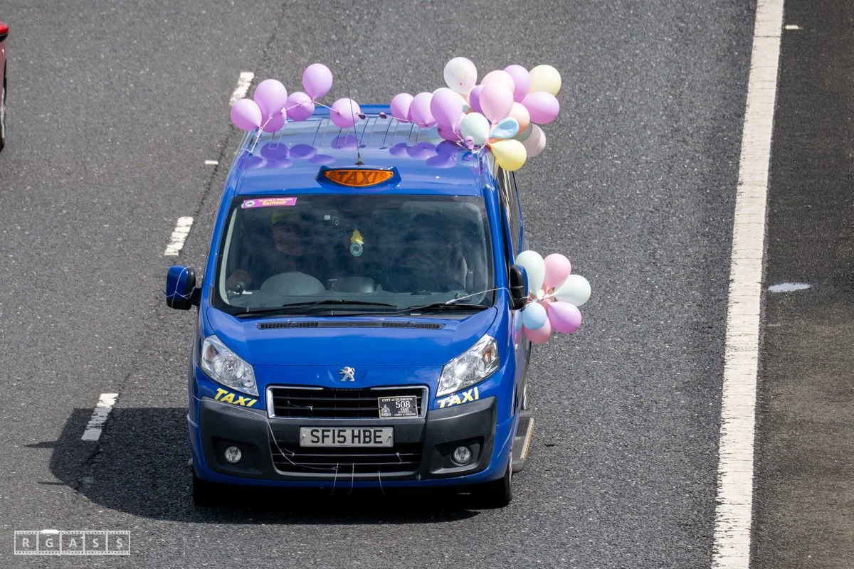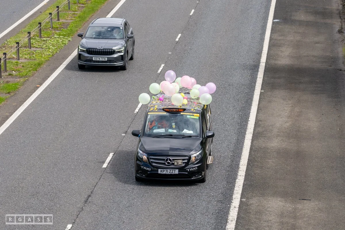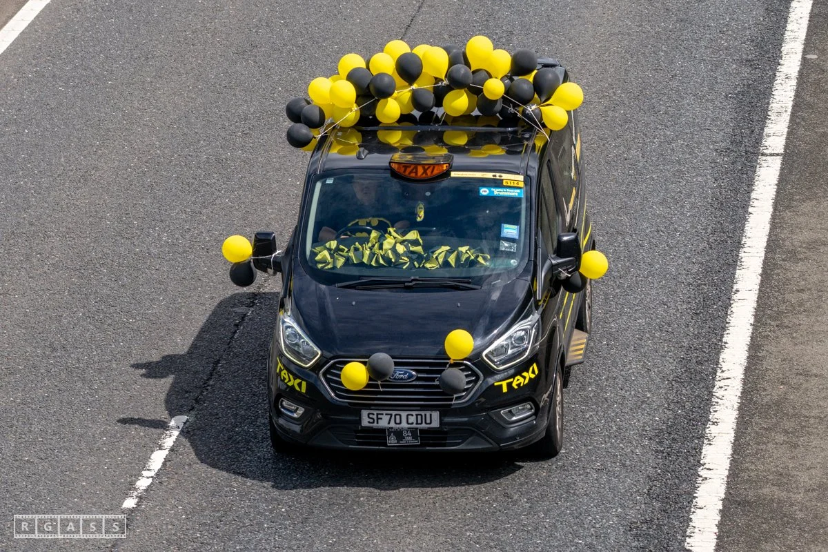 18 June 2025, Fenwick Scotland, UK. Approx 135 Glasgow taxis travelling to Troon in a convoy taking over 300 children with additional support needs for a day at the seaside.
