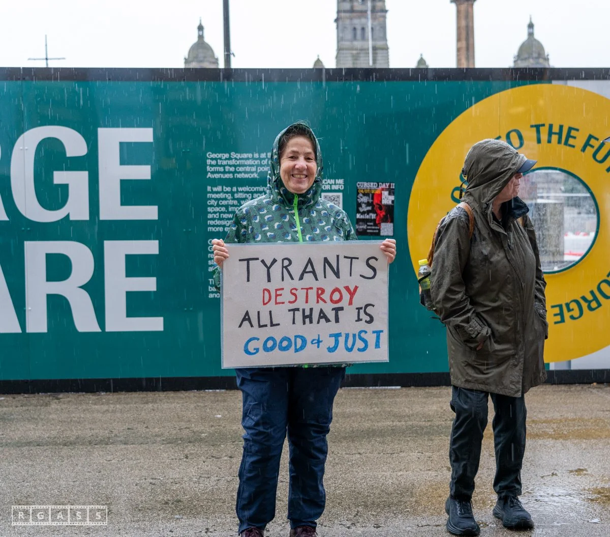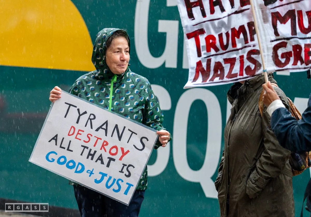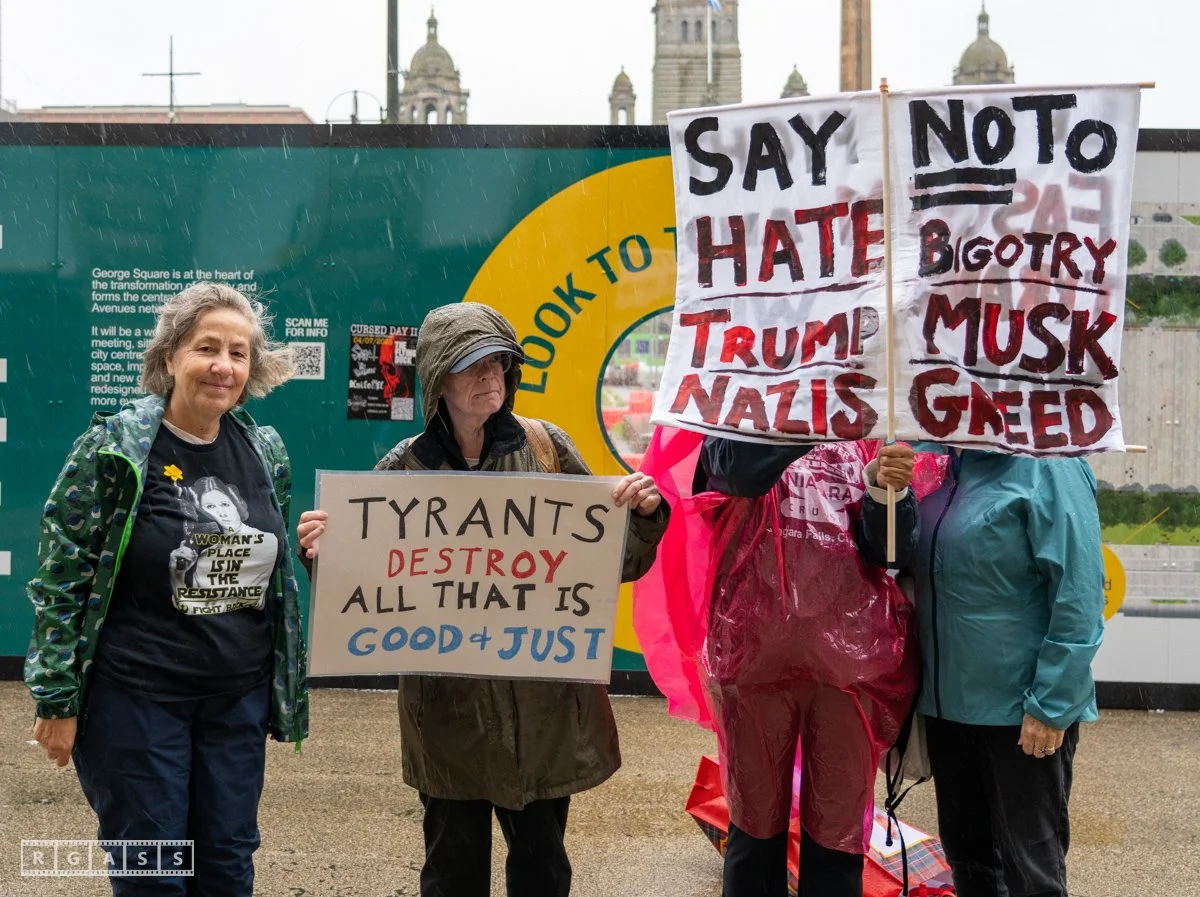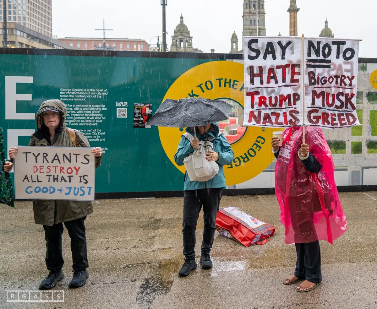 14 June 2025, Glasgow, Scotland, UK: A small group of demonstrators outside George Square for Tesla Takedown No Tyrants Day to encourage the boycott of Tesla cars due to Musk’ support for far-right politics.