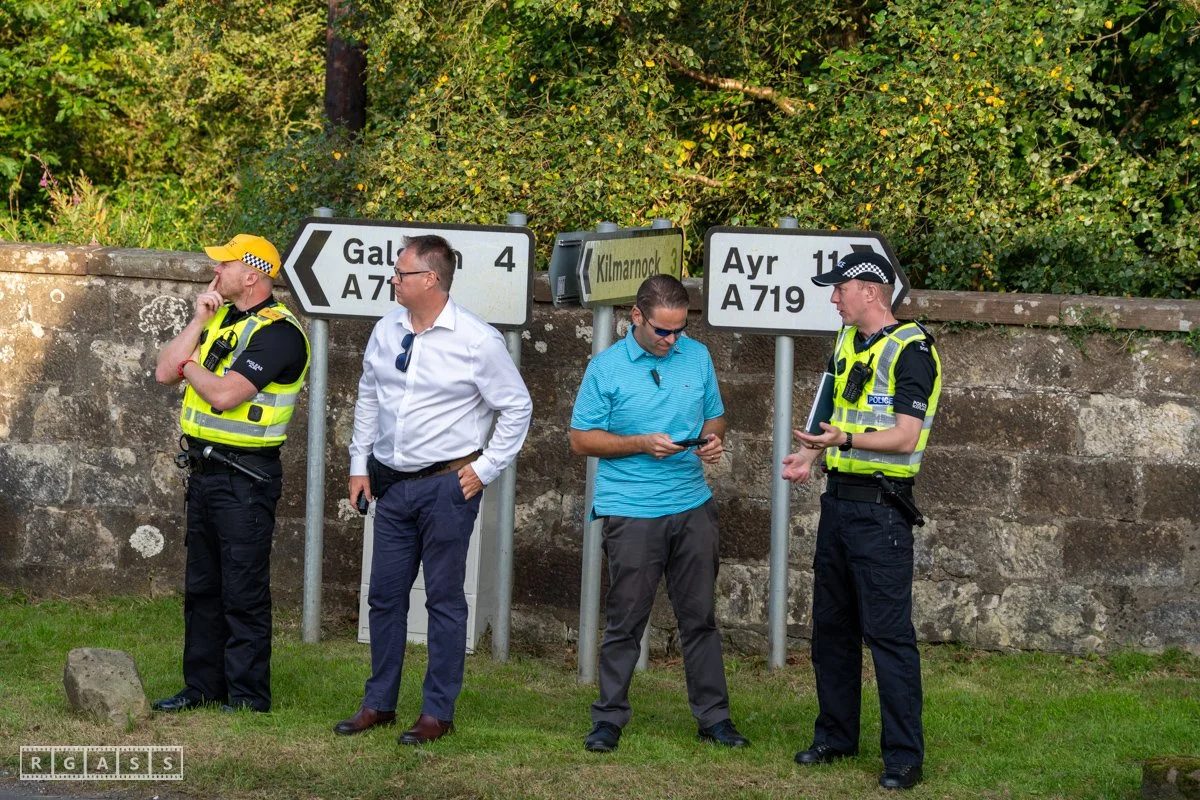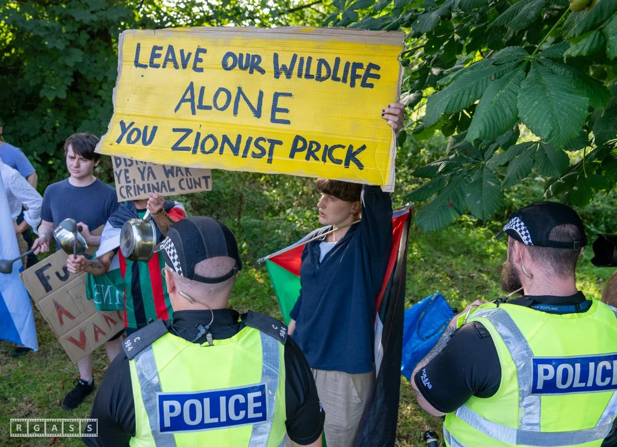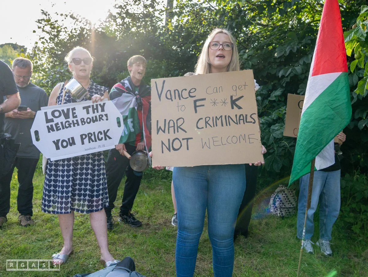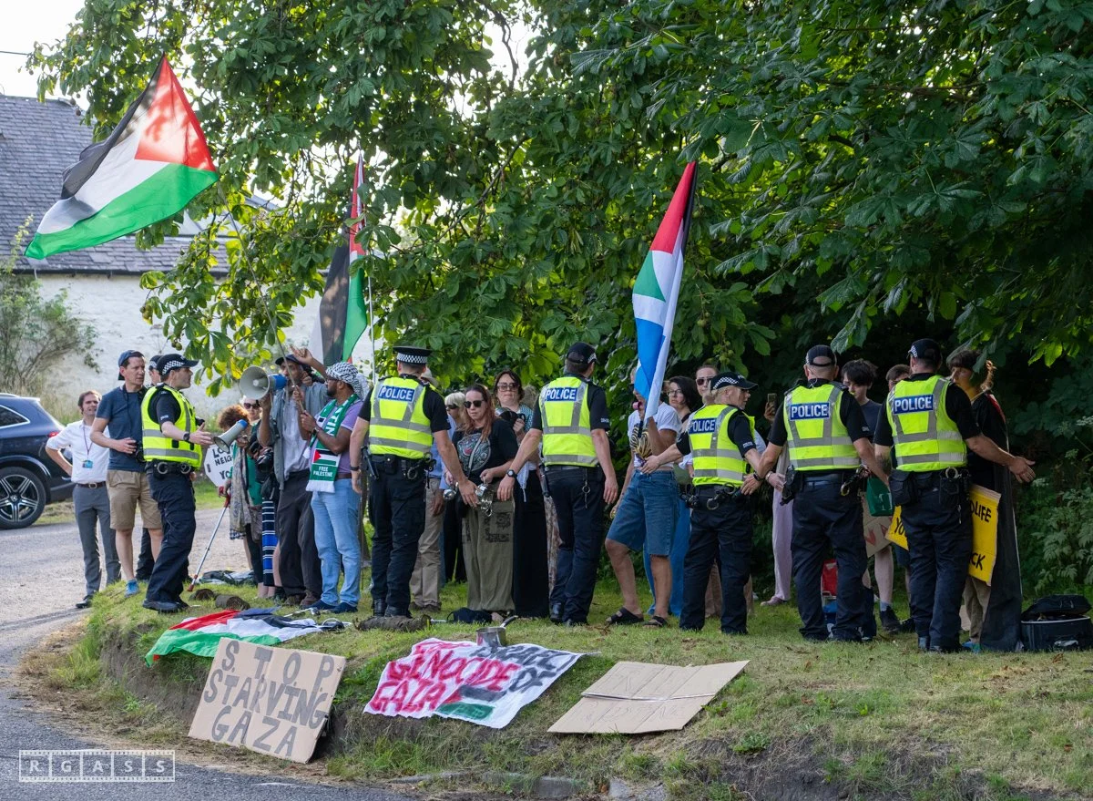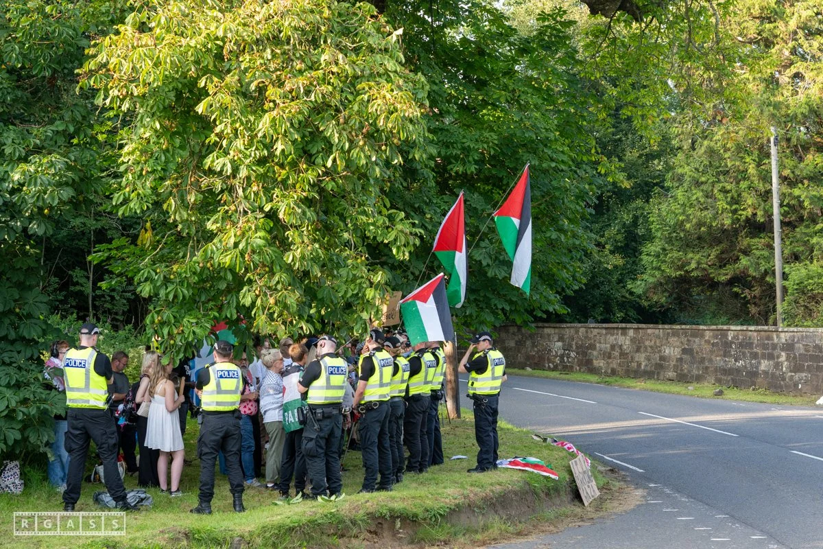 13th August 2025, Kilmarnock. Pro-Palestinian protesters gather at the entrance to Carnell Estate in Ayrshire to show their opposition to US Vice President JD Vance who was arriving at the Estate on holiday.