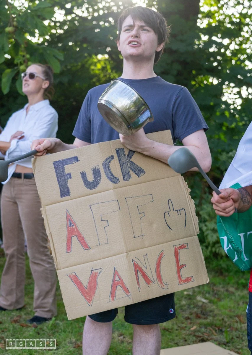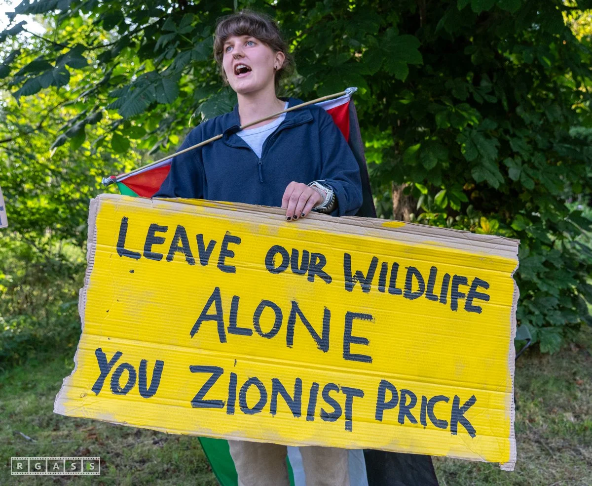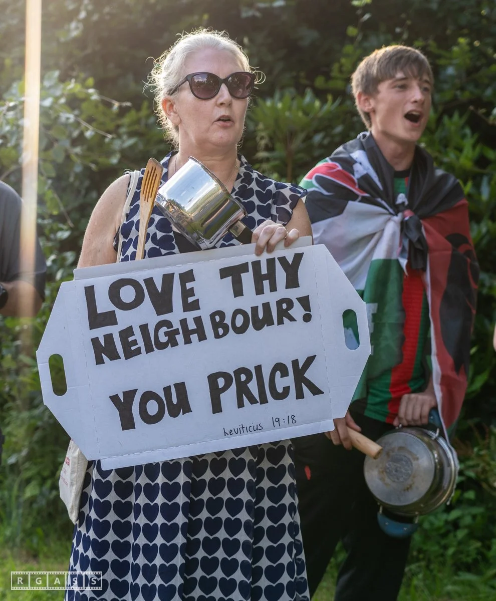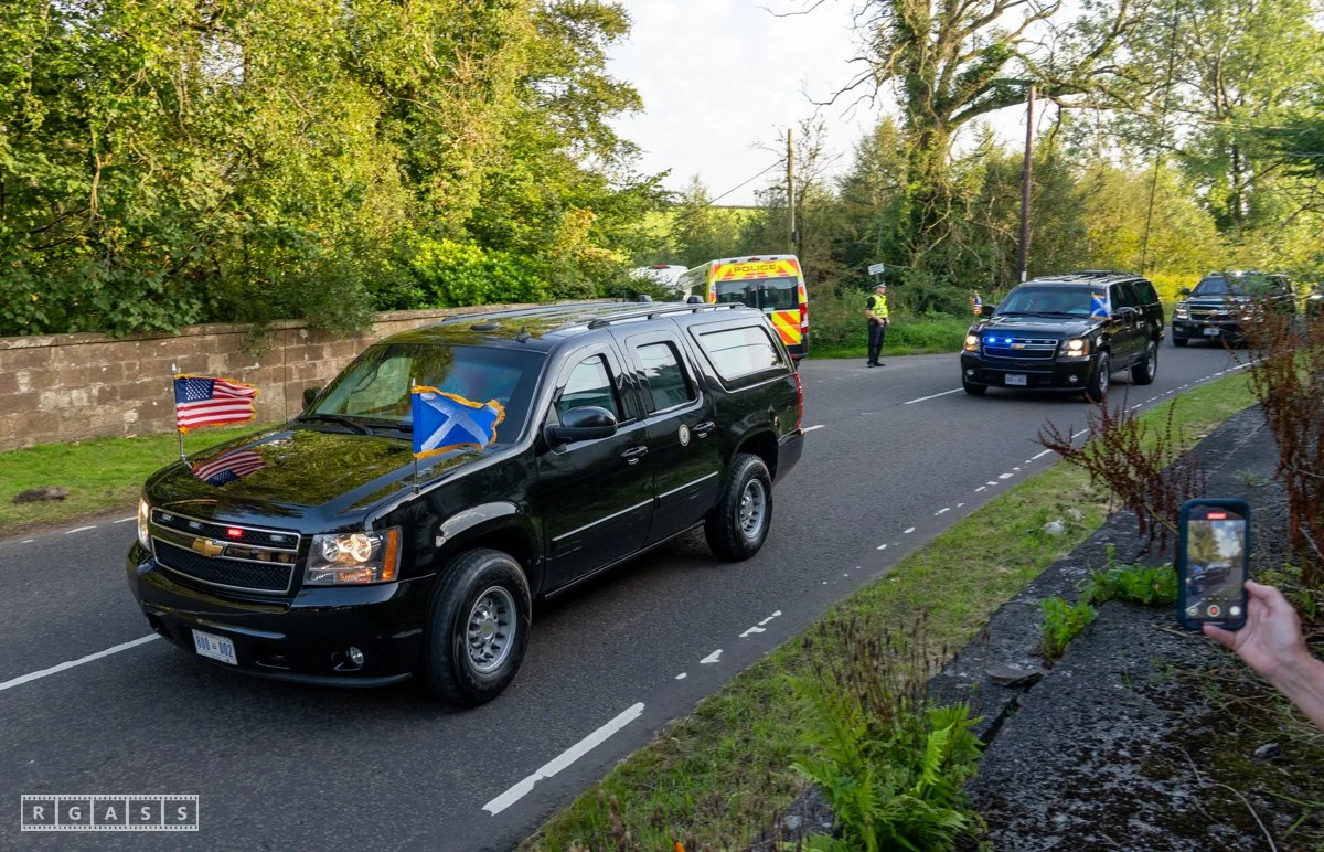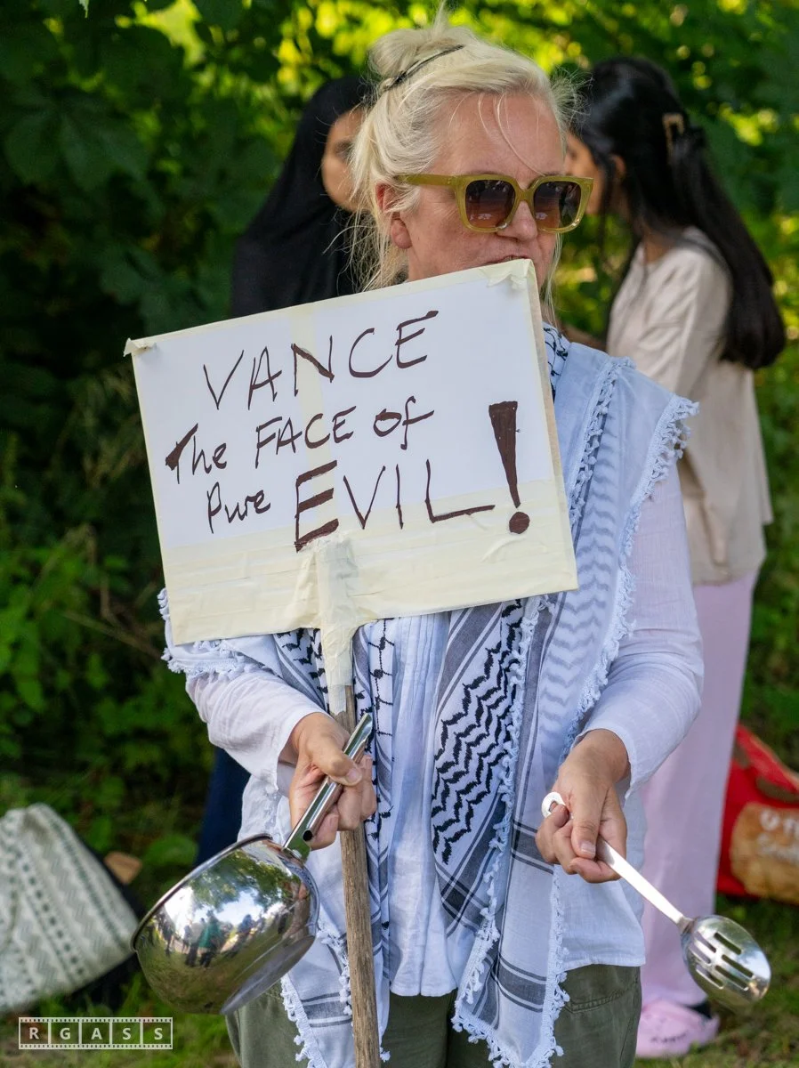 13th August 2025, Kilmarnock. Pro-Palestinian protesters gather at the entrance to Carnell Estate in Ayrshire to show their opposition to US Vice President JD Vance who was arriving at the Estate on holiday.