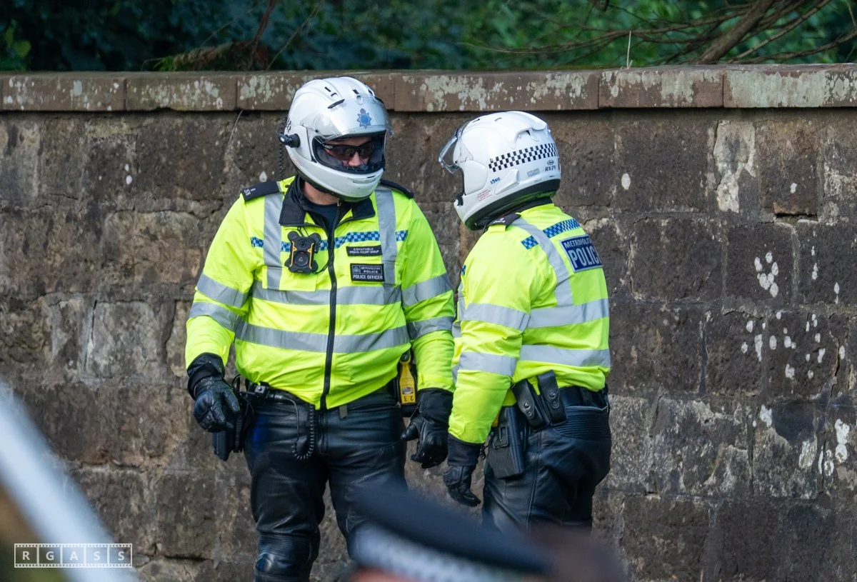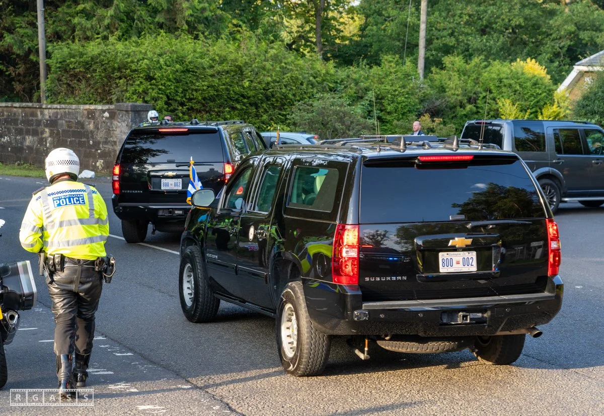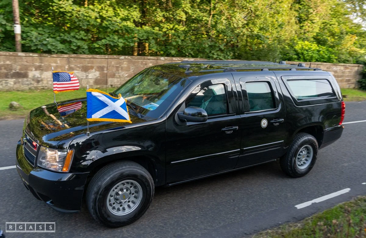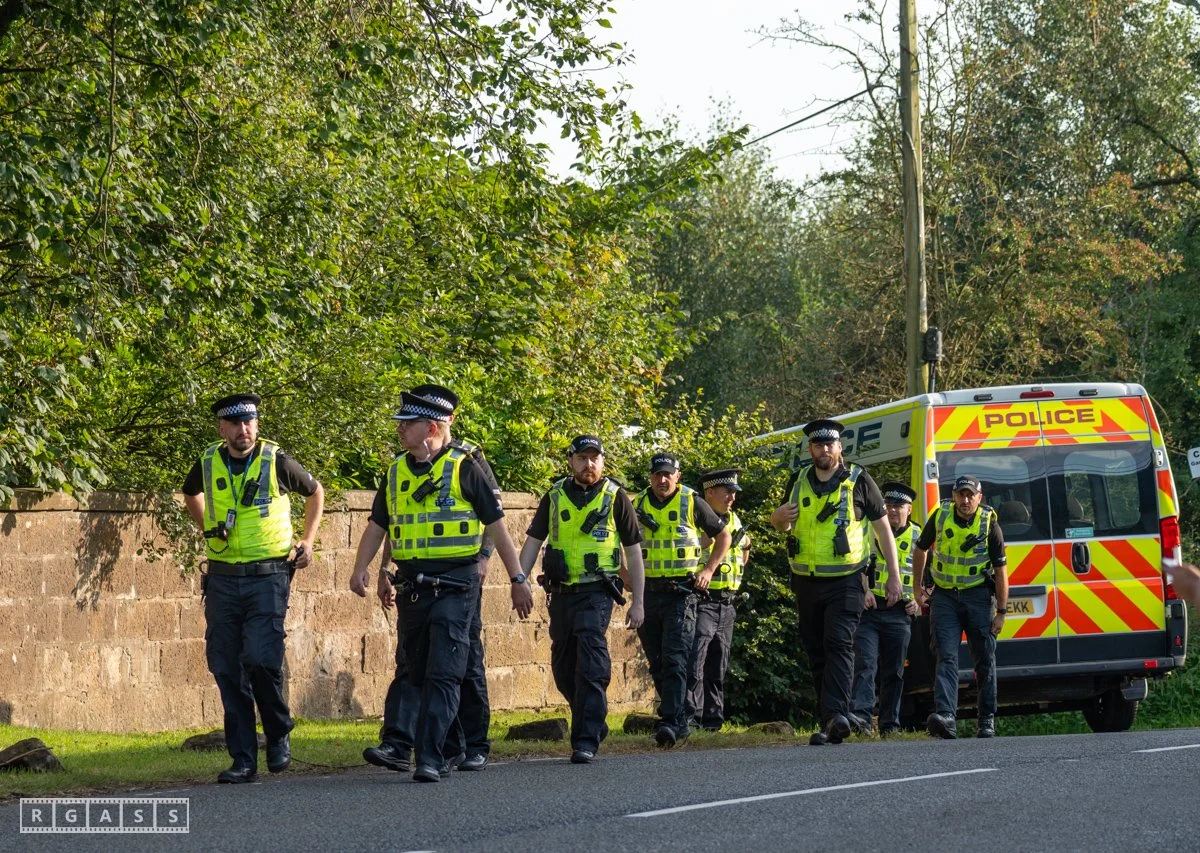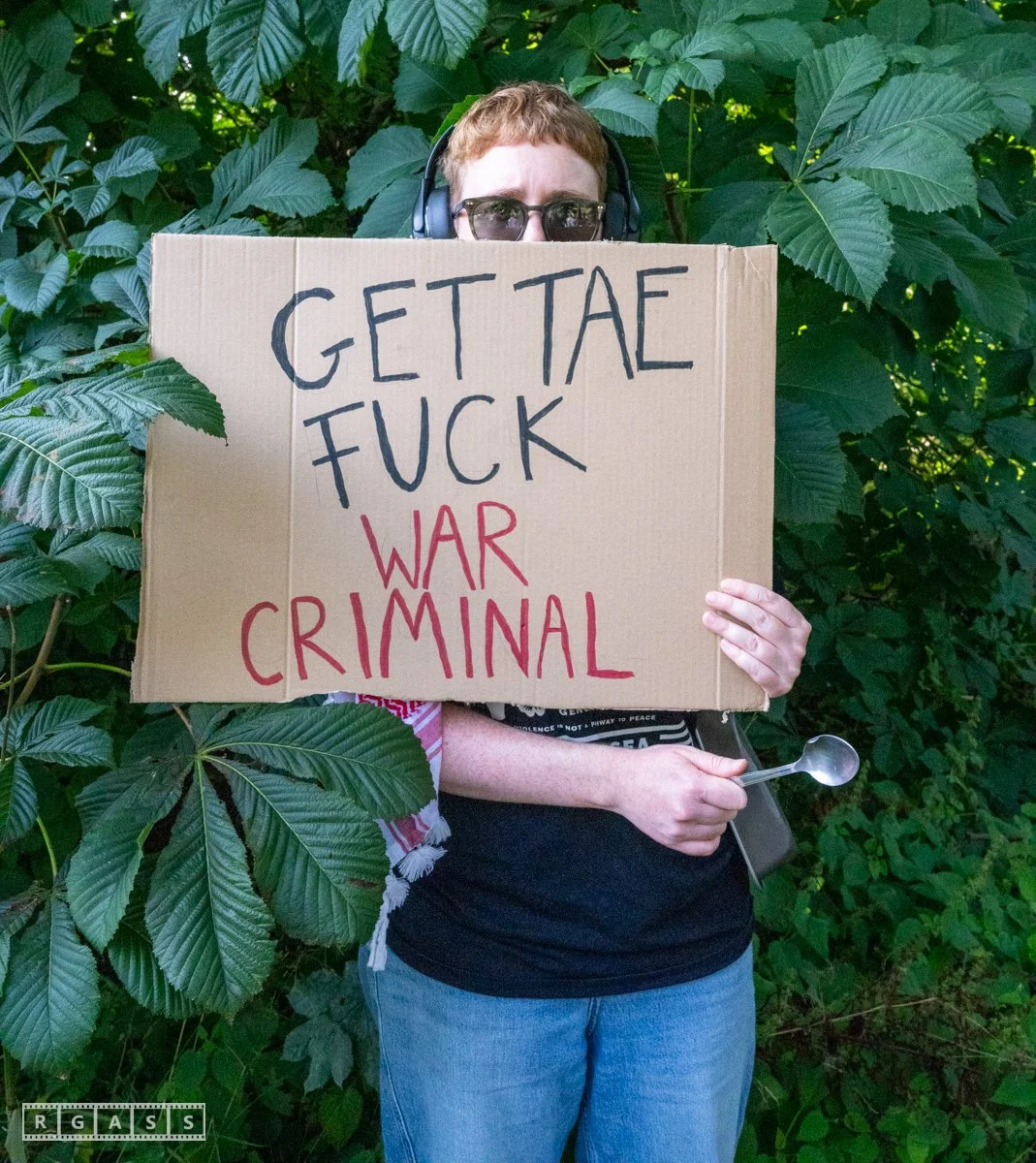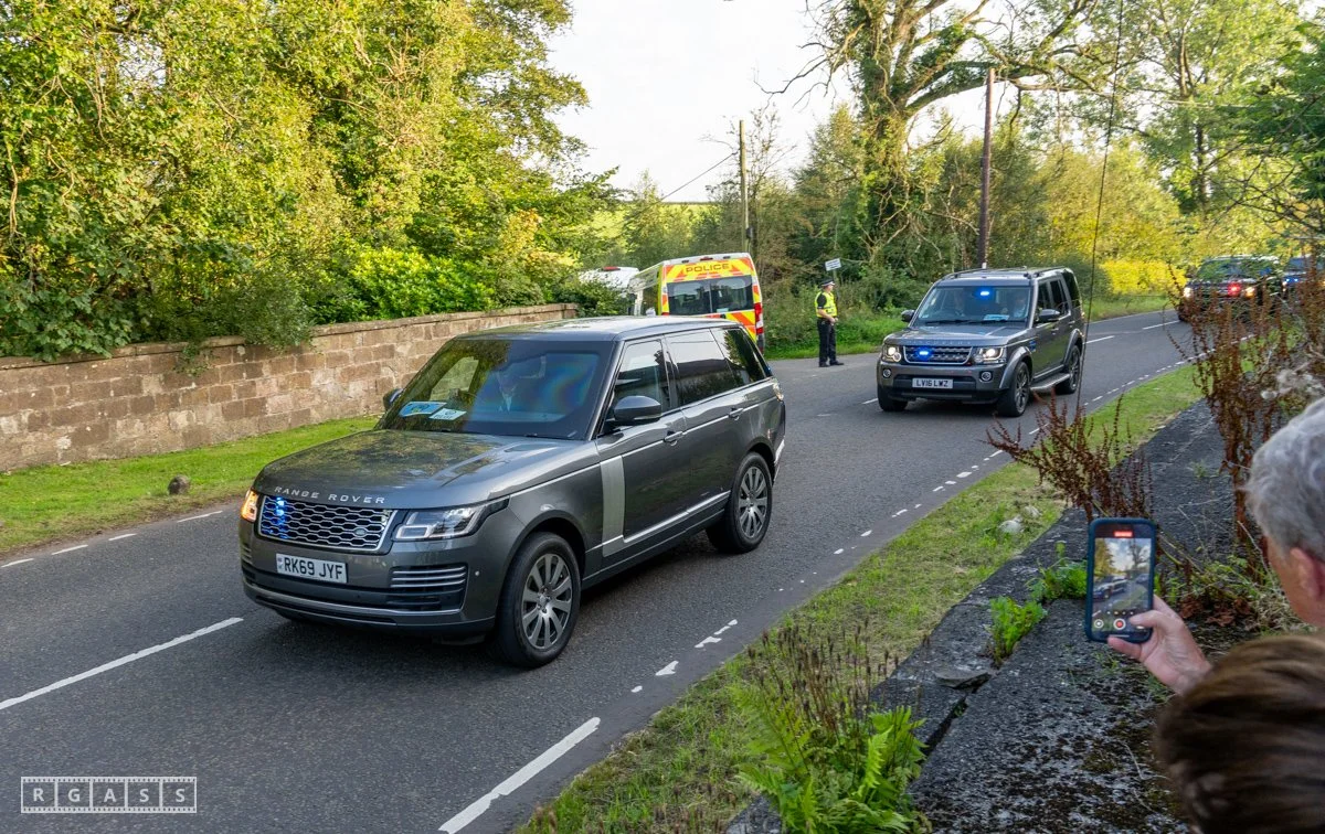 13th August 2025, Kilmarnock. Pro-Palestinian protesters gather at the entrance to Carnell Estate in Ayrshire to show their opposition to US Vice President JD Vance who was arriving at the Estate on holiday.