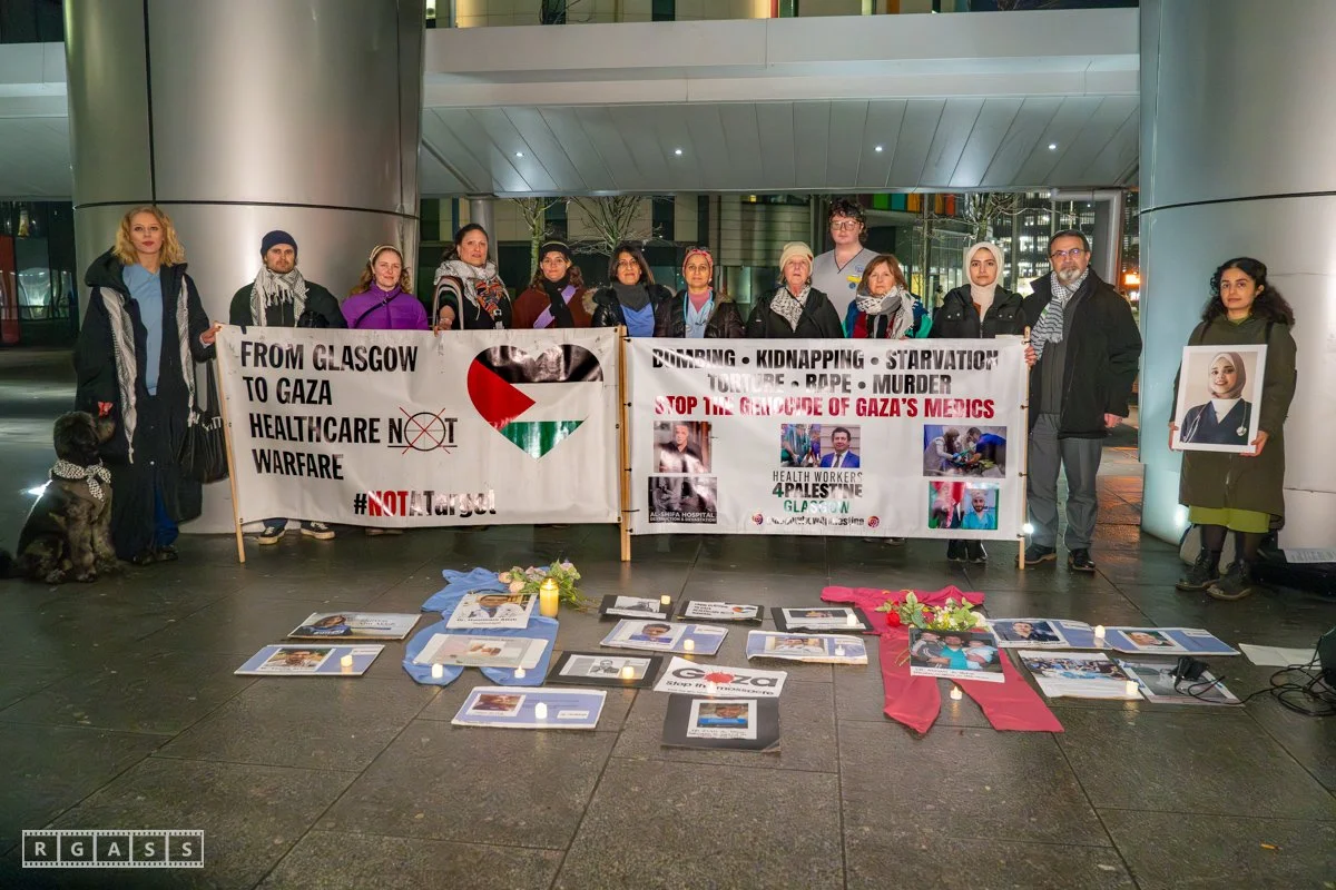 31 Jan 2025. Health Workers 4 Palestine vigil outside the main entrance to the Queen Elizabeth Hospital Make It