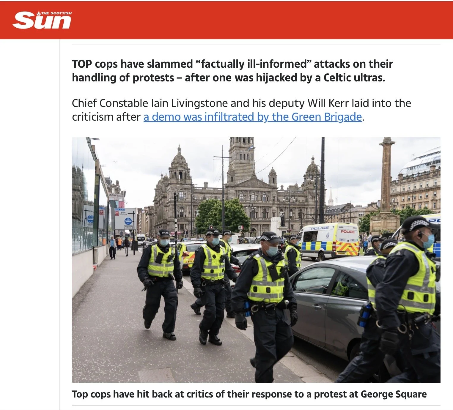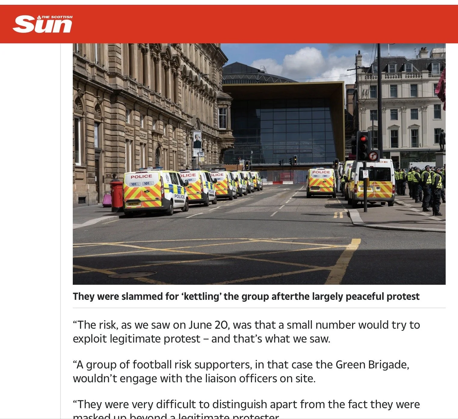 Photo of Police Scotland vans while policing a Green Brigade march to Hampden Park